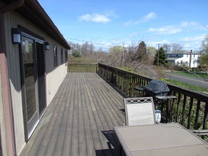 This 4 bedroom 3 bath 2 story deck house has been well cared for and is in immaculate condition. The home offers vaulted timber accented ceilings, open living-dining area, galley kitchen, brick fireplace, master bedroom suite, large den, sundrenched 700+ sq.ft. Mahogany deck, work/storage room, utility room, new oil furnace, updated windows, flowering landscape, sprinkler system, room for pool and one car garage.