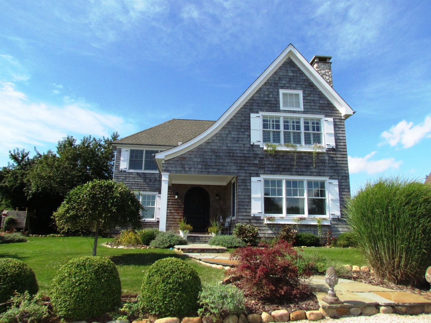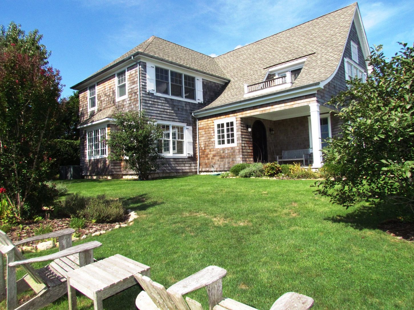 This Cotswold-inspired, recently constructed cedar shingle home is situated on a private .60 acre parcel on quite country lane close to town and Montauk Downs State Park. The home features 4 bedrooms, 2.5 baths, open central island granite kitchen, built- in breakfast alcove, dining room, exposed barn timber accented living room, stone FP, beamed cathedral ceiling master suite, private master balcony, central air-conditioning, hedge lined blue