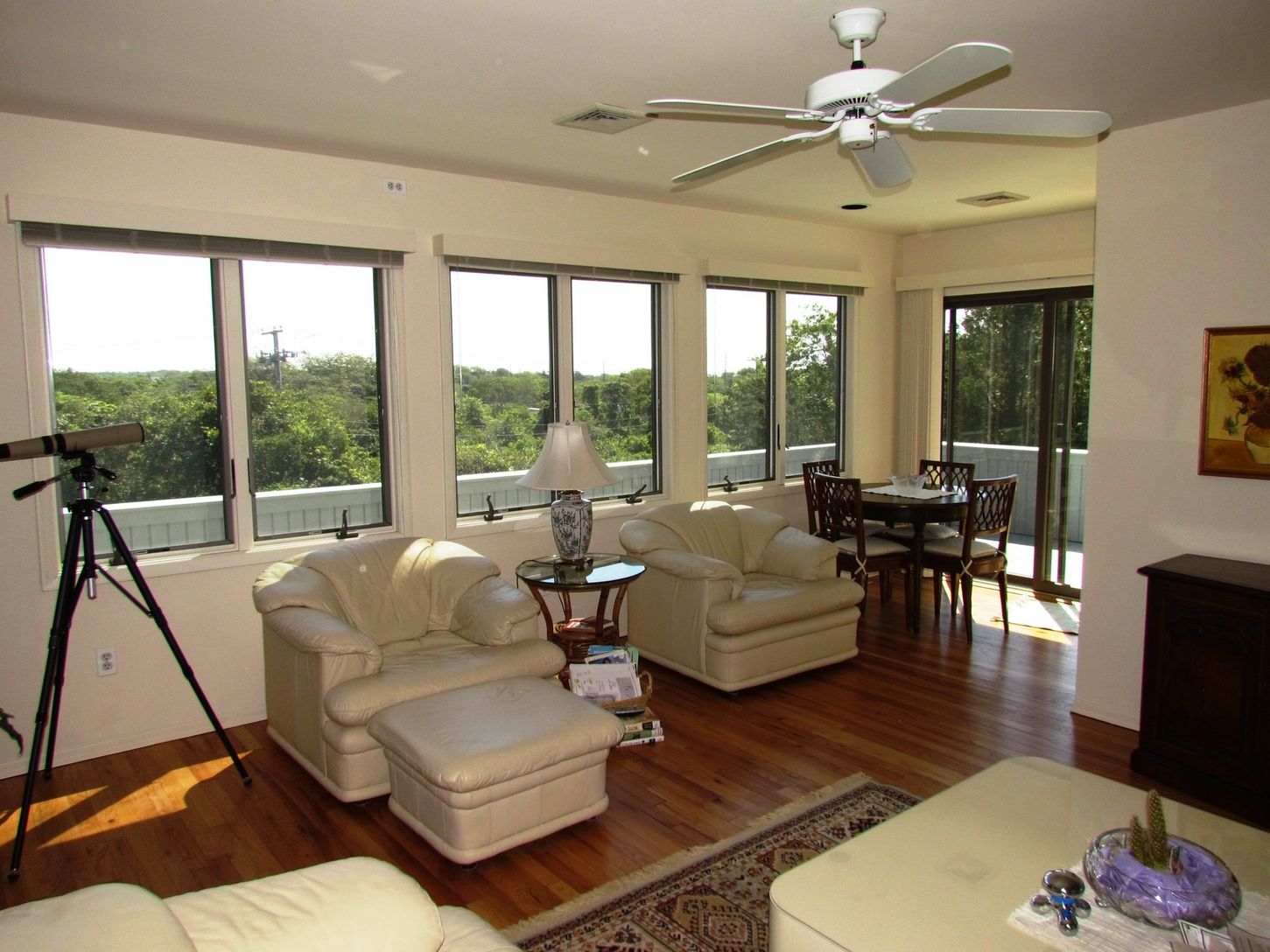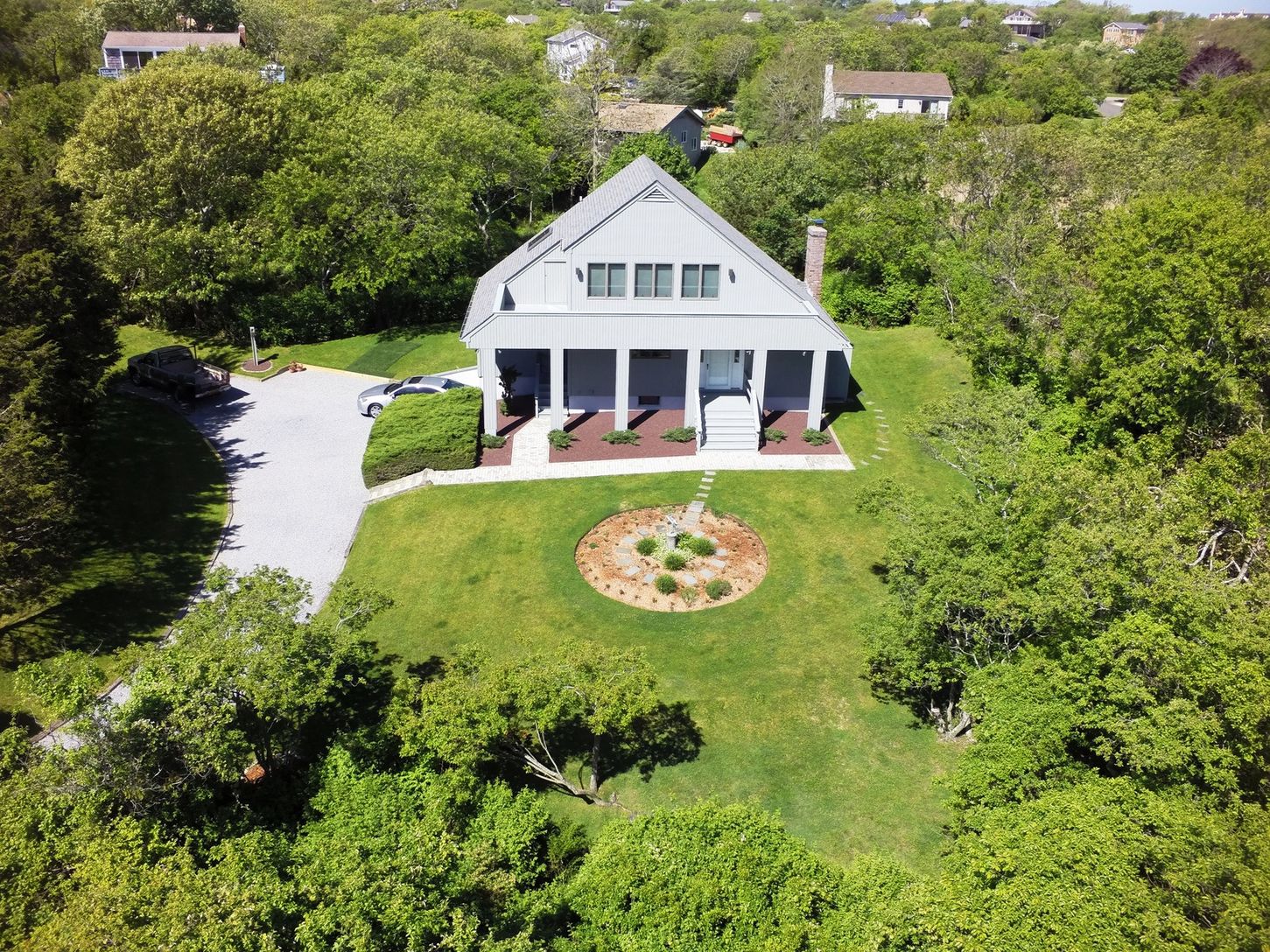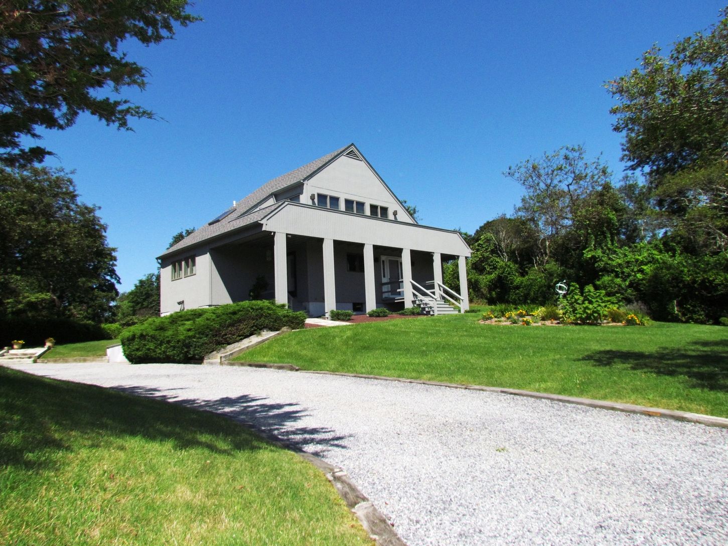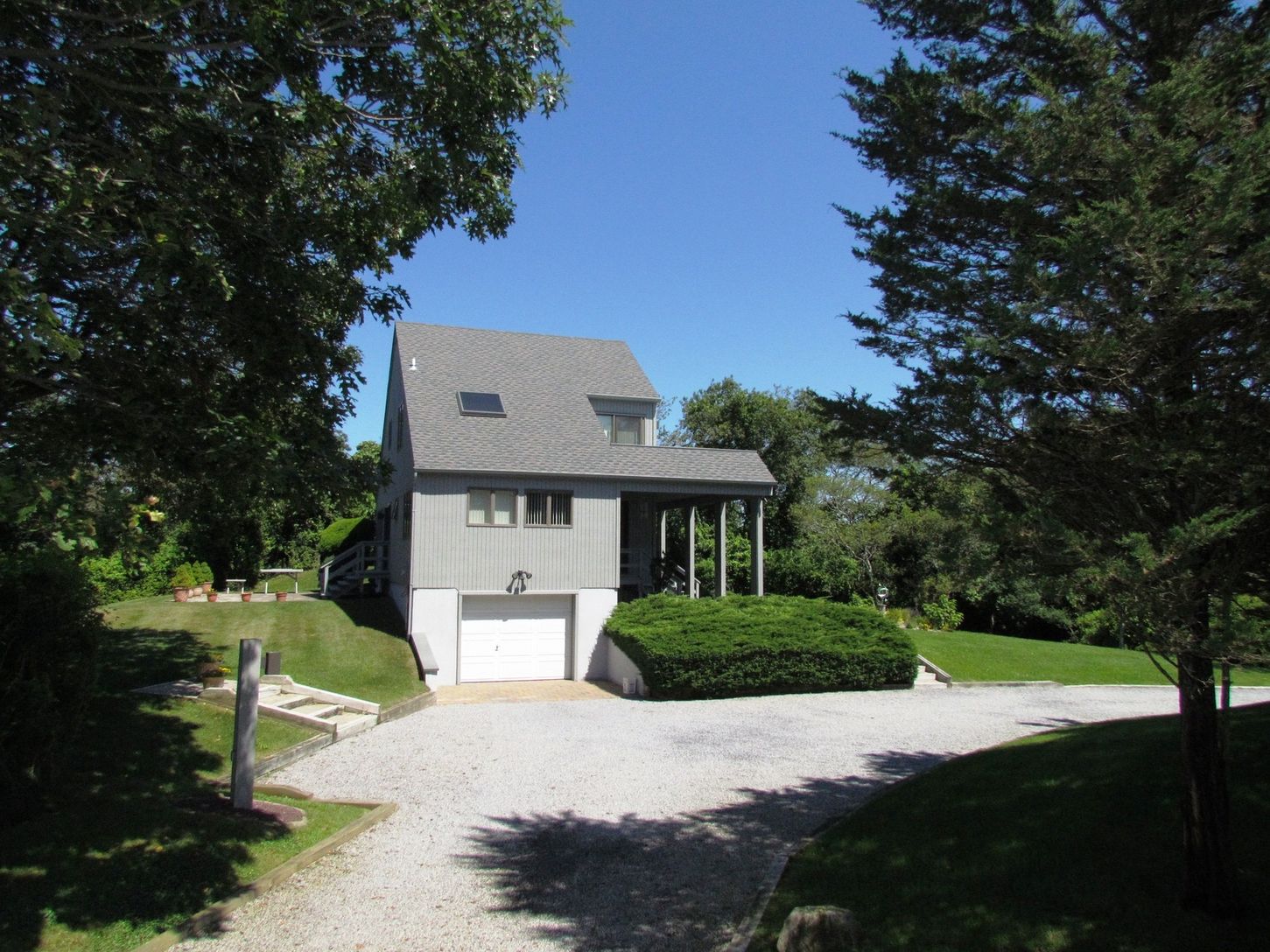This immaculate two bedroom, two bath contemporary would be so nice to come home to! While affording easy access to everything, it is, nonetheless, particularly private on its landscaped acre plus site. There's a ribbon ocean view from the upstairs deck which is accessed from the loft-styled den or eventual third bedroom. The house features an open living area, brick fireplace, kitchen, mud room, loft, private tree-lined yard, stone patio, st