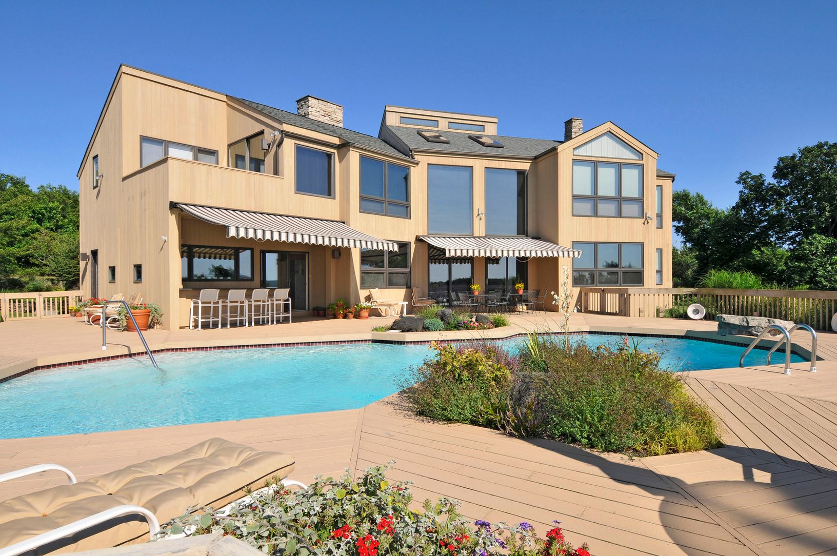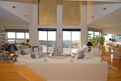 Custom-built, luxurious and beautifully designed 4 bedroom, 6 1/2 bath home on a shy, private acre overlooking Fort Pond Bay. Spectacular western, unobstructed water views from every room. Built for comfortable and gracious living, this beautifully bright, light-filled home features floor to ceiling windows which maximize the views, an open floor plan, two fireplaces on the main floor in the dining and living room areas, a large and sunny ki