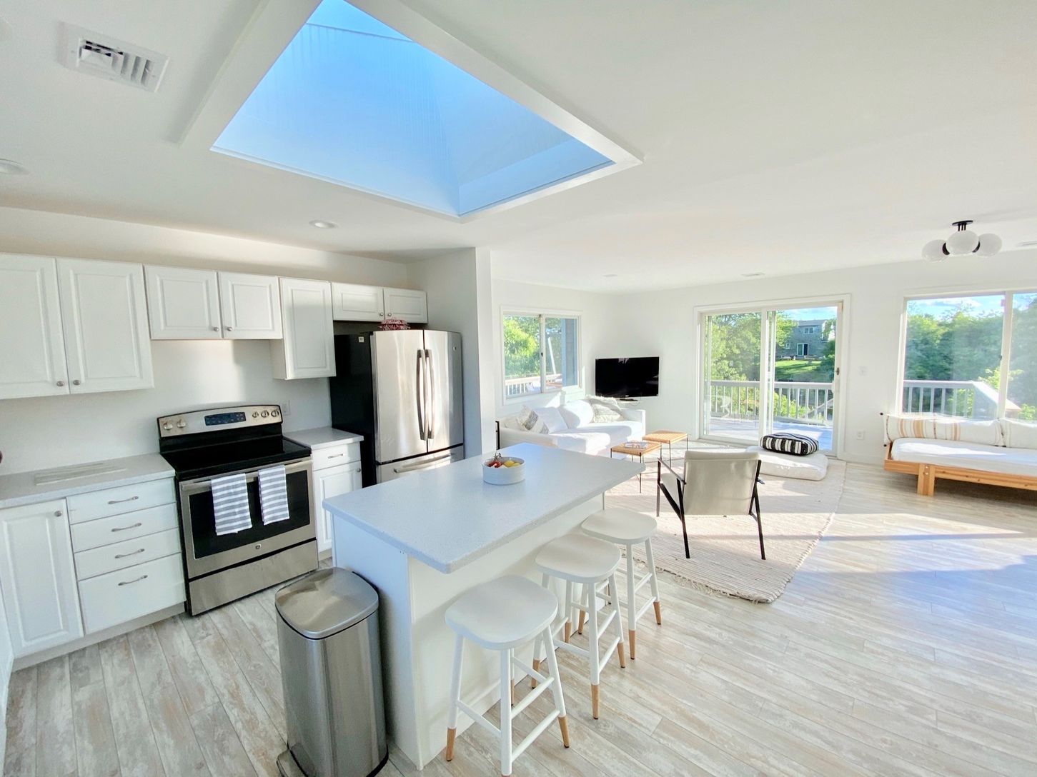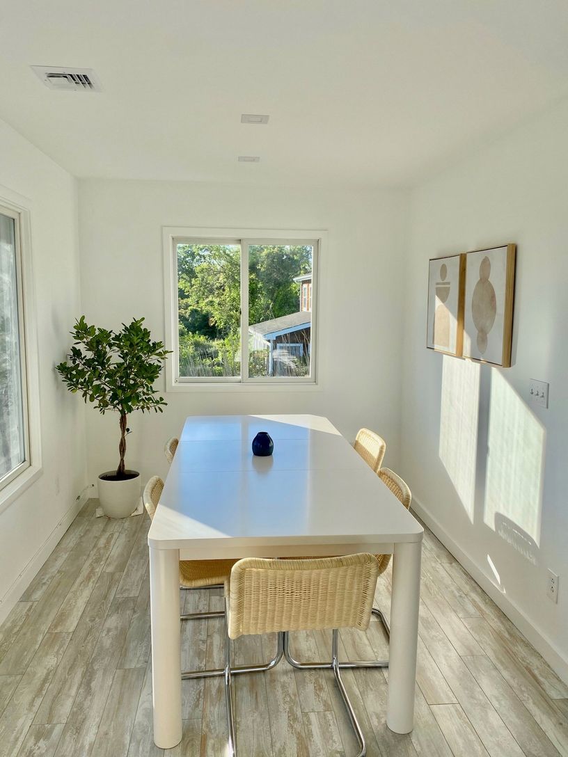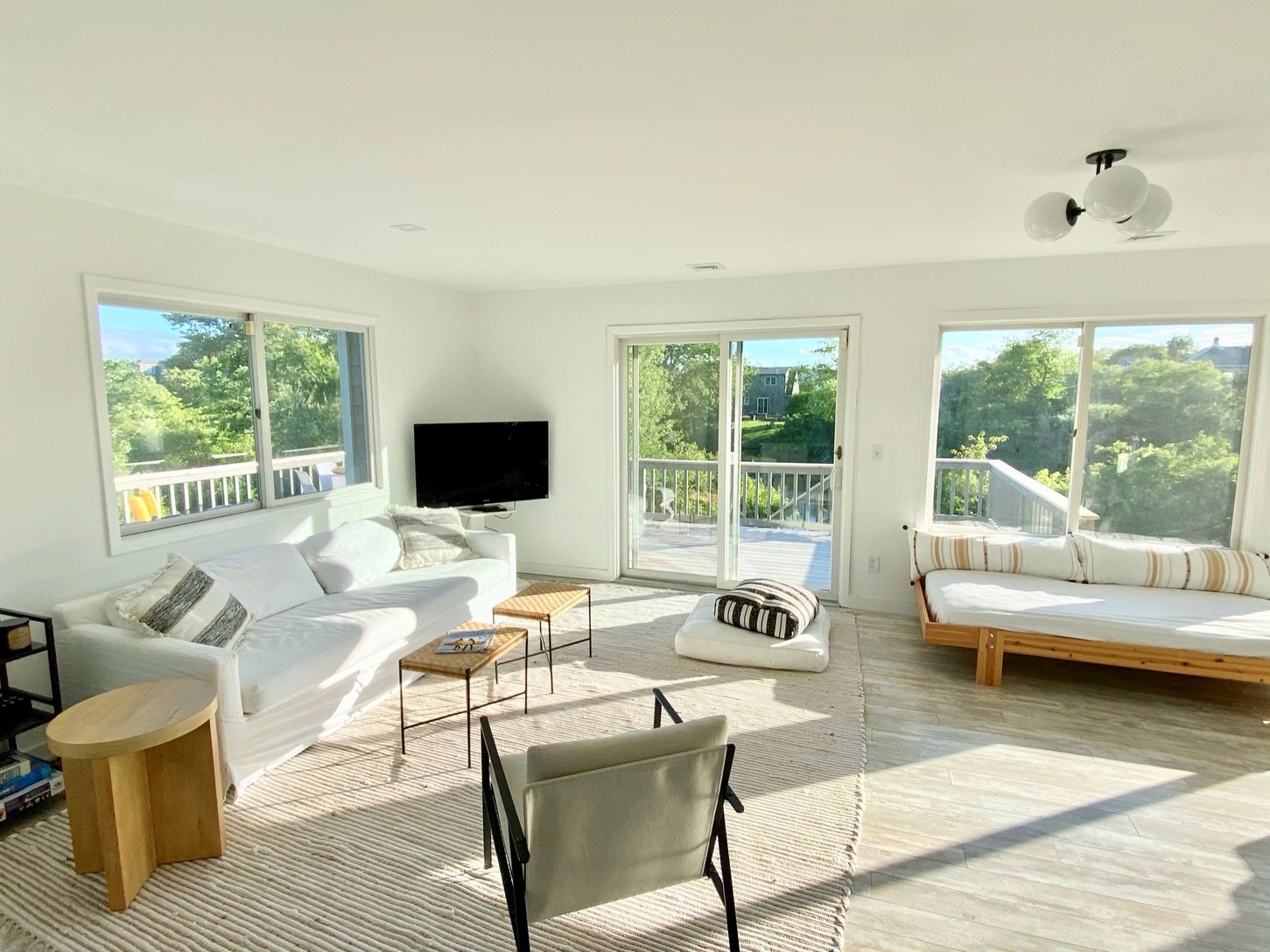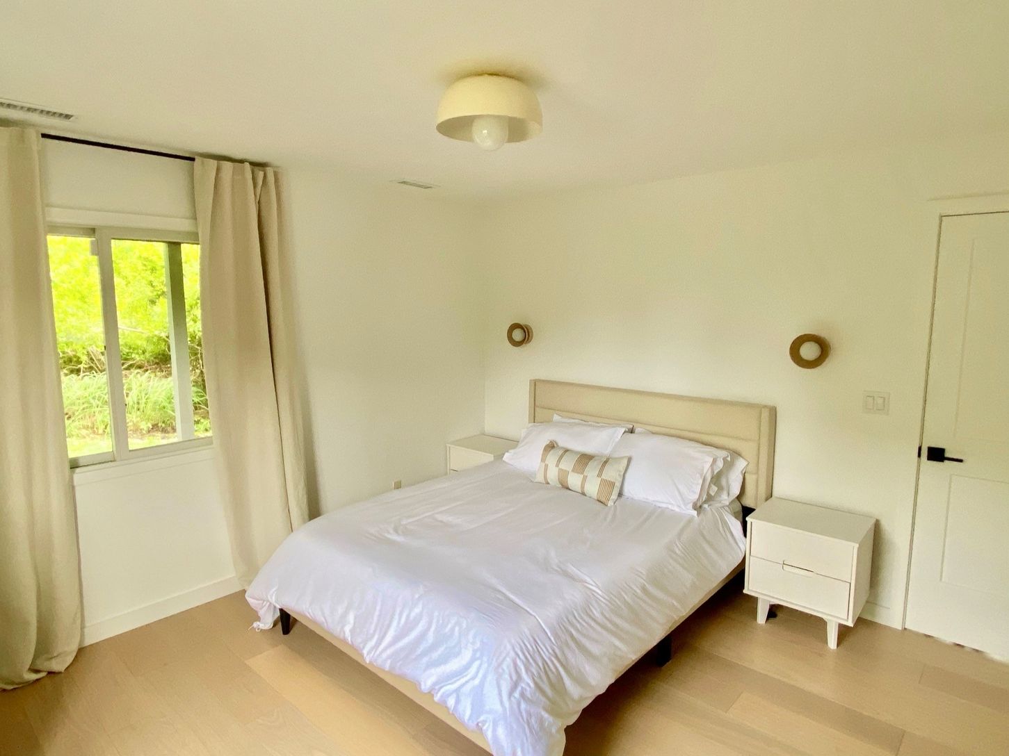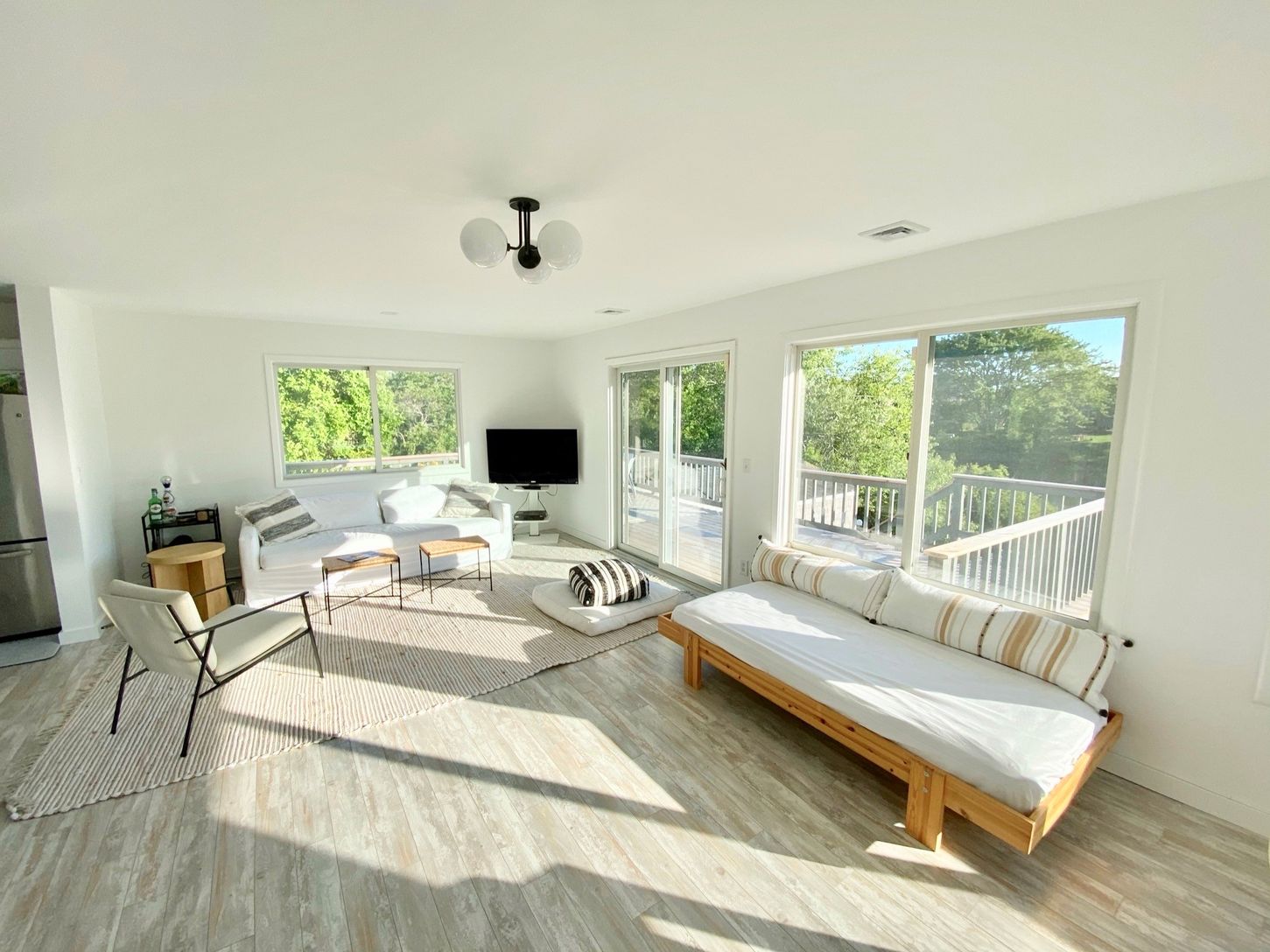 Bright Montauk beach house with gorgeous pond front views. Designer remodeled home completed in May 2021. The house is perfect for families and groups on vacation or working remotely. 5 bedroom, 3 bathroom with an enormous wrap around deck overlooking a pond and a lush backyard. Full indoor and outdoor lounging and dining set ups. Located in the heart of Montauk, 1 mile from both town (shops + ocean beaches) and famous surfing at Ditch Plains.