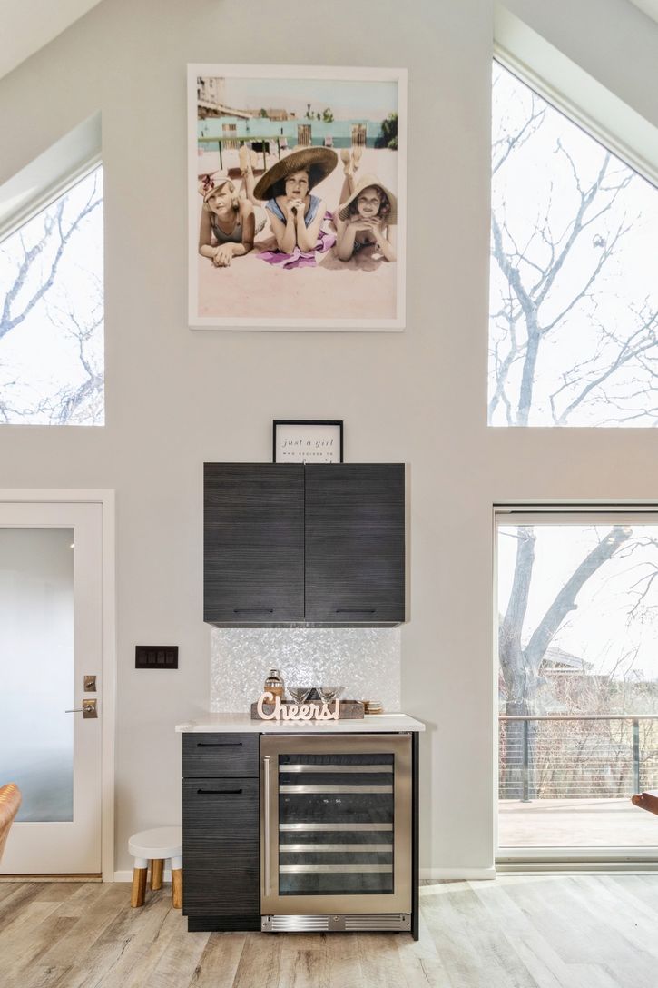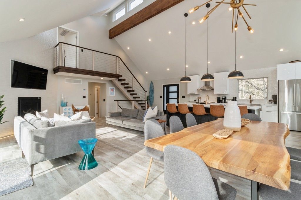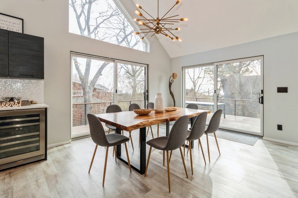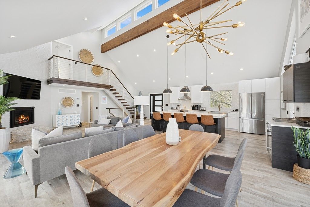 Live edge wood dining table with seating for 8.Wine fridge cocktail area for refreshments. Kitc