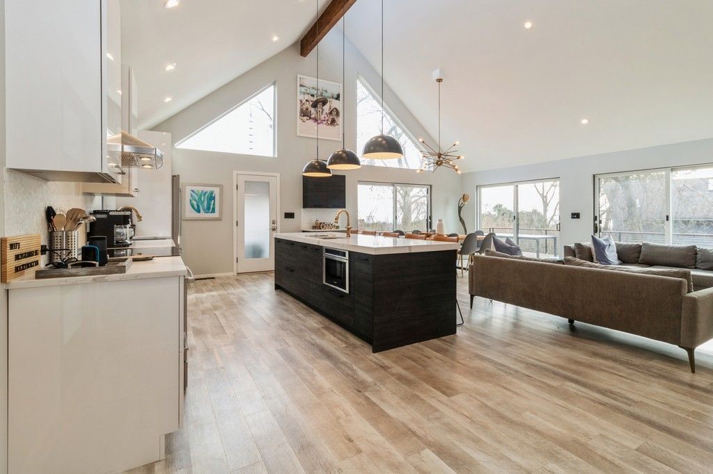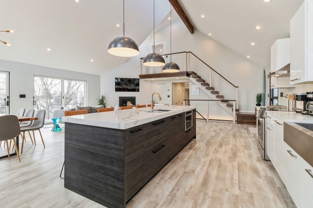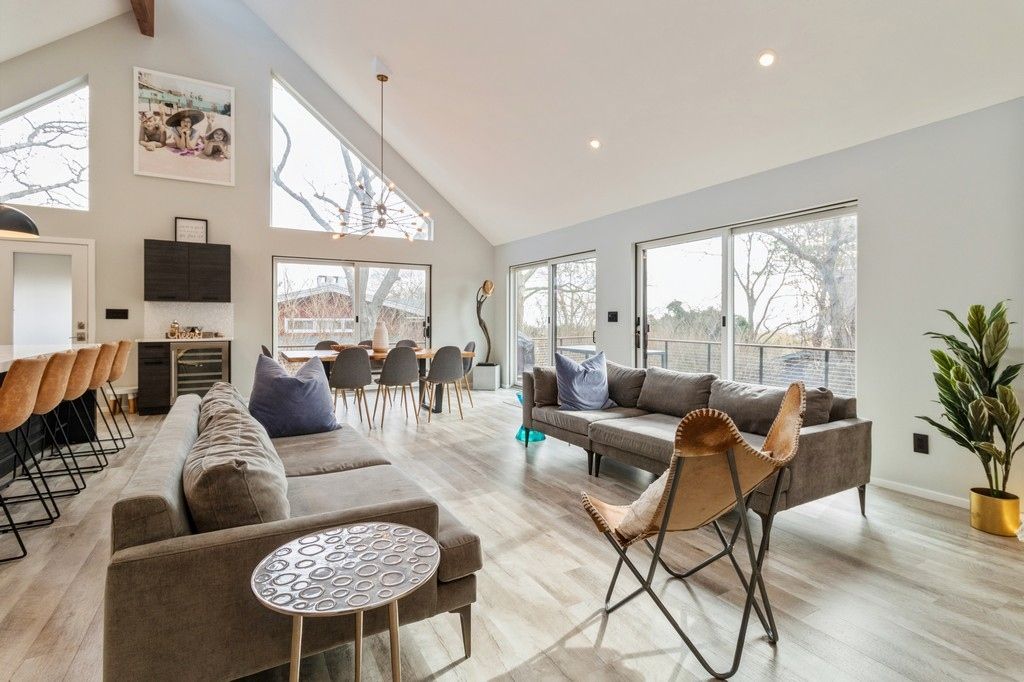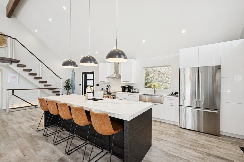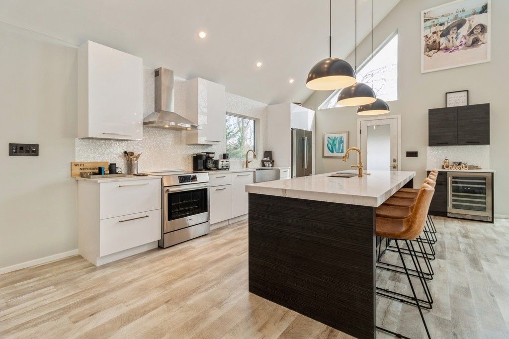Live edge wood dining table with seating for 8.Wine fridge cocktail area for refreshments. Kitc