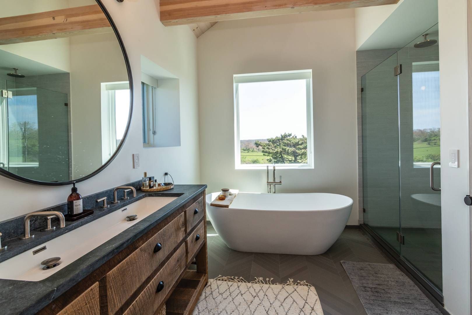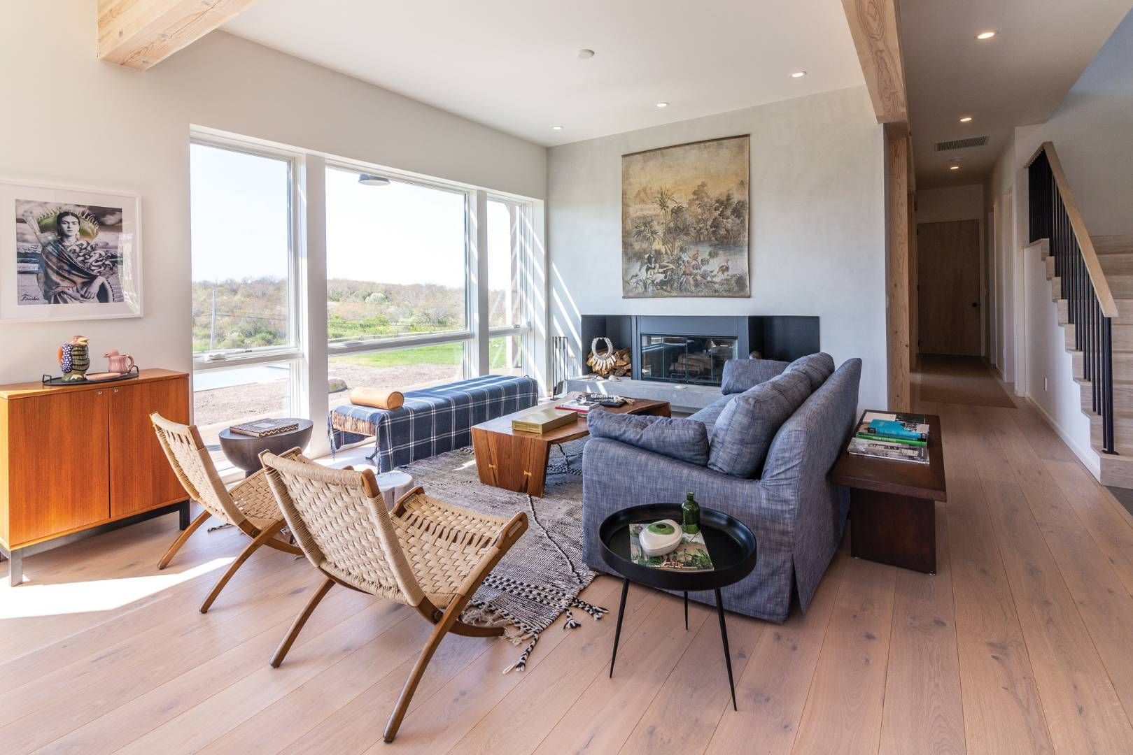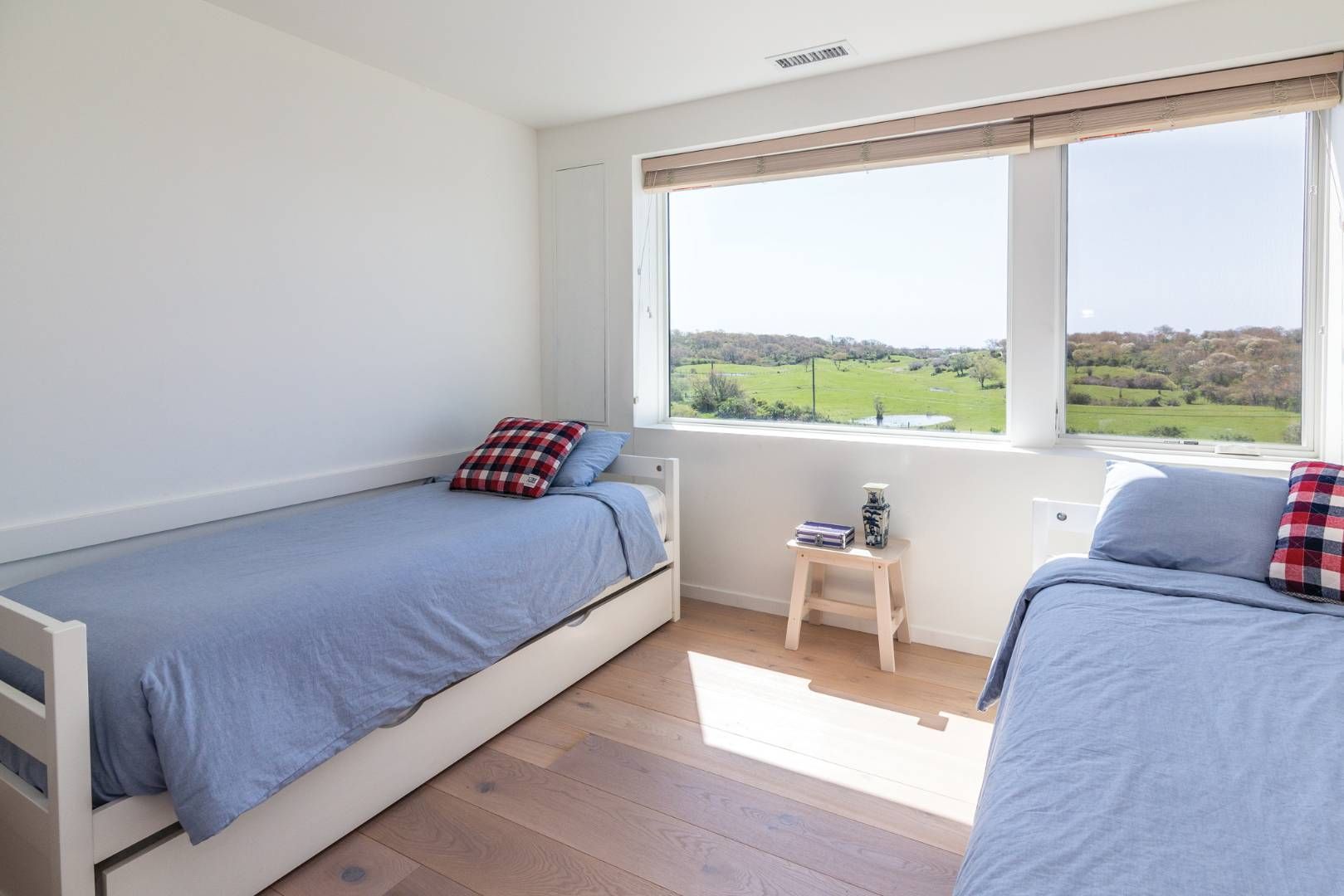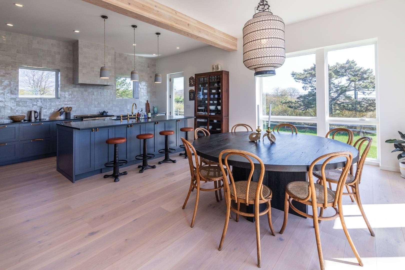 Perched on one of Montauk's most stunning landscapes, this 4,100 sq. ft. timber-frame home on 1.6 acres delivers sweeping views of Deep Hollow Ranch's rolling hills, Lake Montauk, and the ocean beyond. Five bedrooms, five full baths (including two ensuites), a sleek modern kitchen, and multiple living spaces create an effortless summer retreat. Total privacy, breathtaking sunsets, and evening cocktails on the deck set the scene. Spend your day