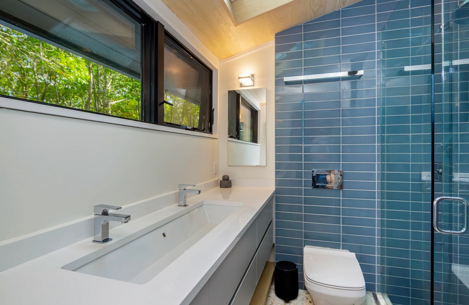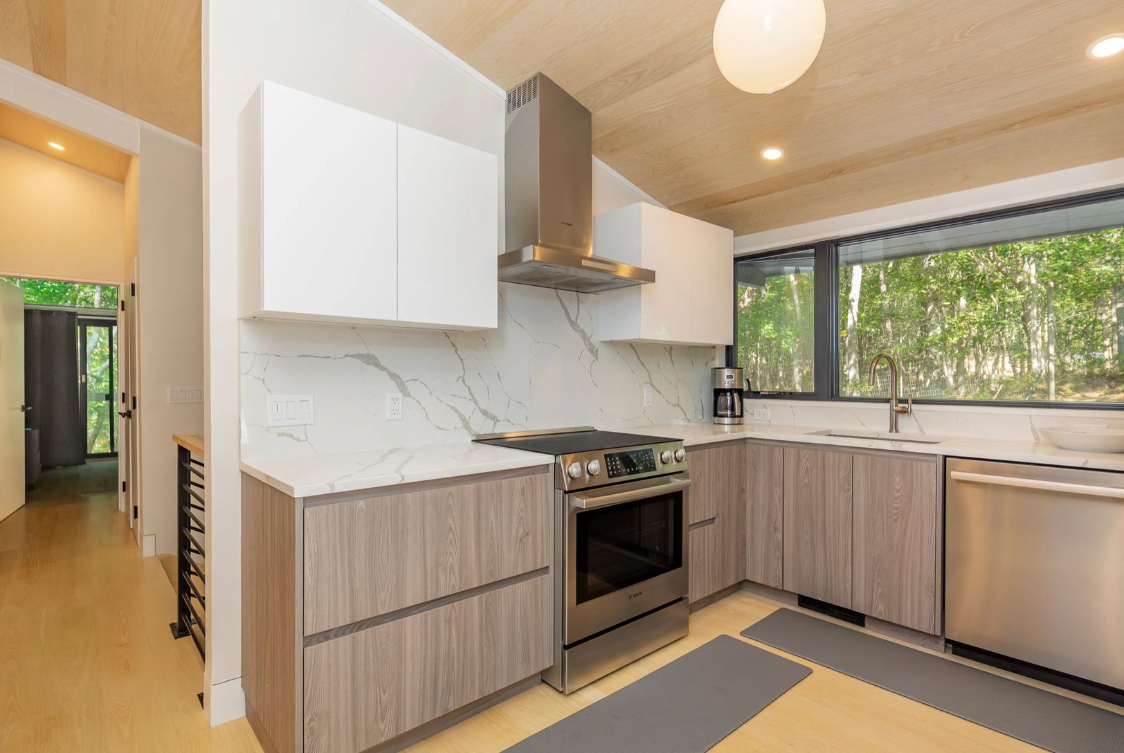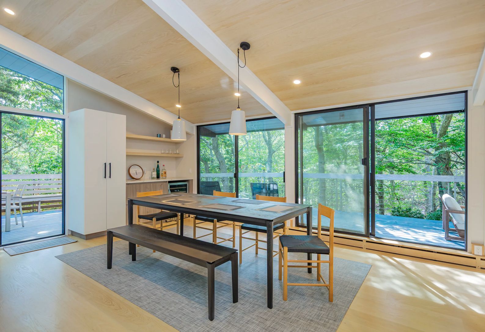 Tucked above a quiet private drive and surrounded by mature trees, this beautifully redone three-bedroom, two-bath home offers a peaceful hideaway in desirable Hither Hills. Inside, the main level feels bright and open, with high ceilings, a comfortable living space centered around a fireplace, and a seamless connection between the dining area and the updated kitchen complete with a wine fridge. Large glass doors stretch across the back of the