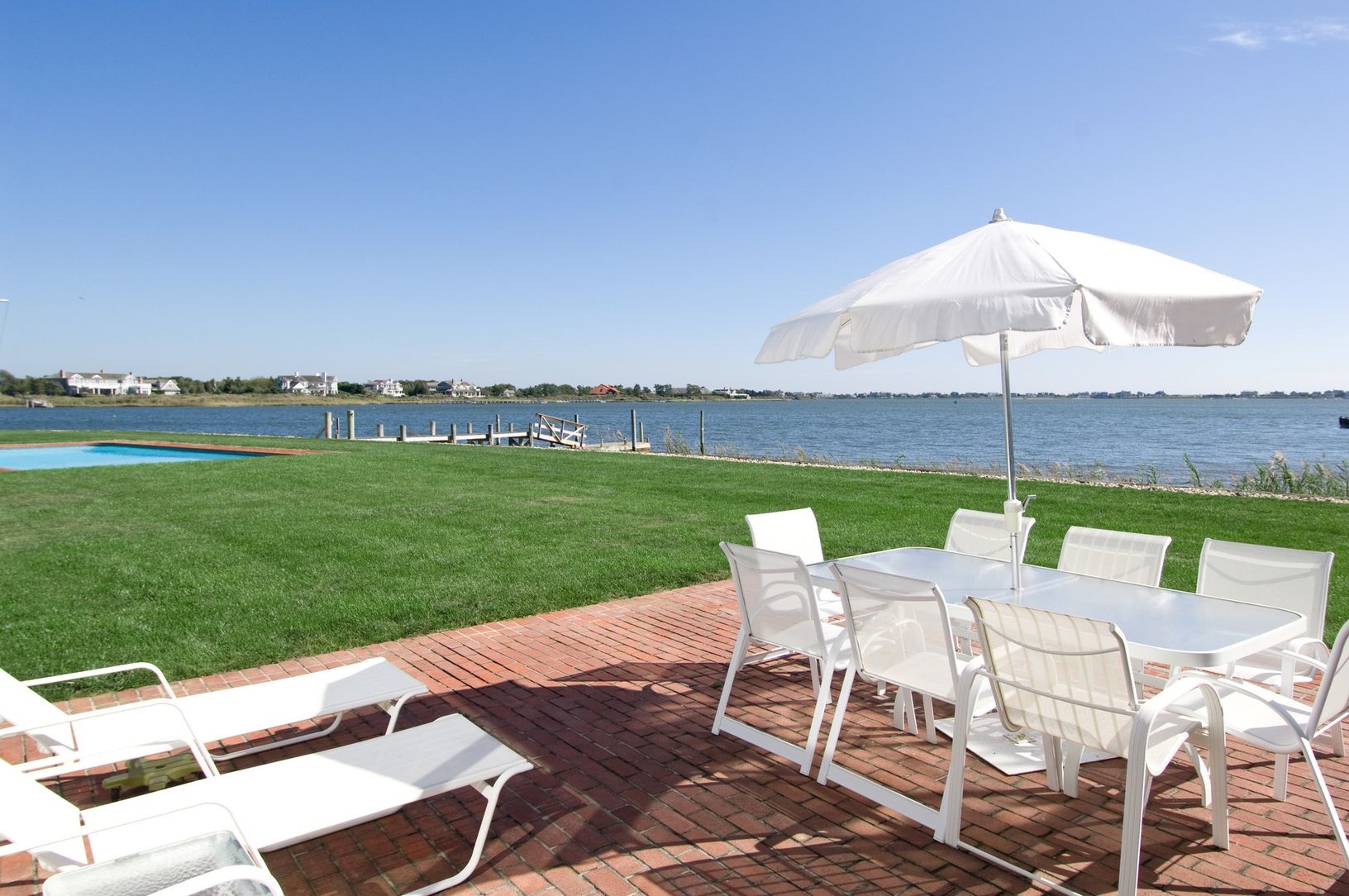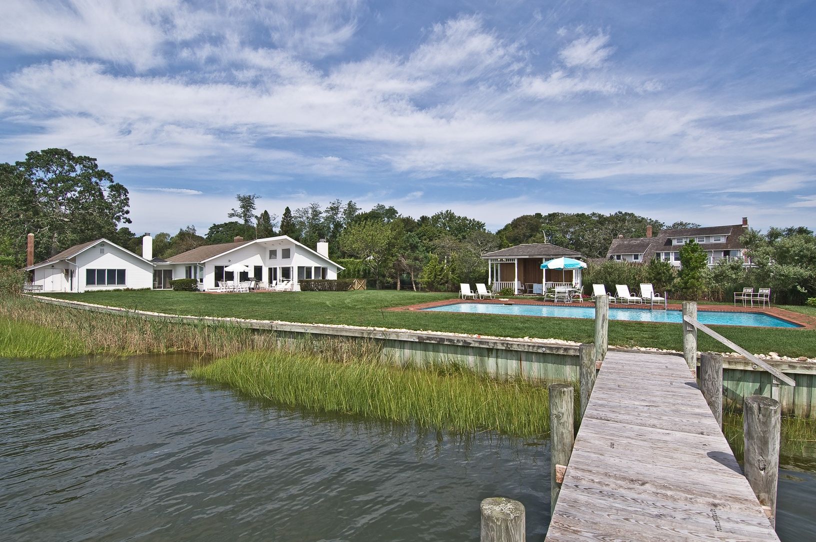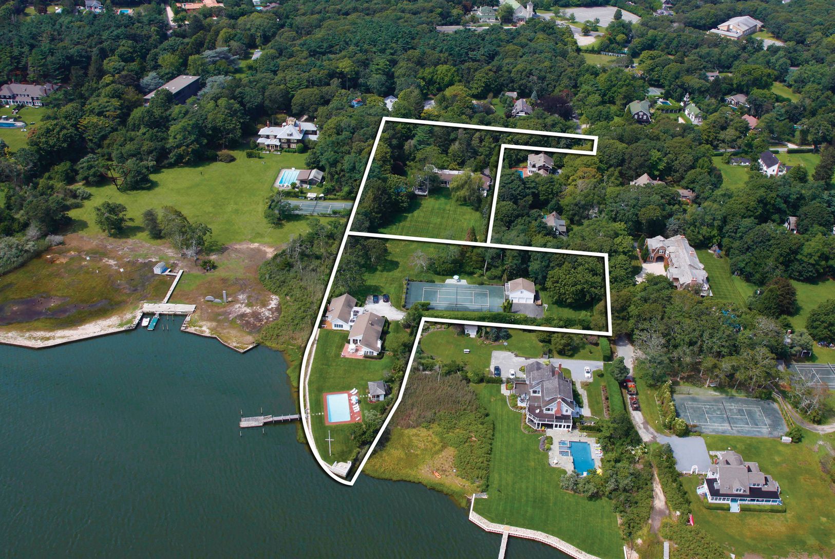 Discover Quiogue..... a quiet hamlet, that sits between Westhampton Beach & Quogue. Rare opportunity to acquire two contiguous parcels, with two homes, on 3 acres, with bulkhead & south facing dock on breathtaking Quantuck Bay. The great lawn separates the larger home from the waterside home. Total of eight bedrooms and seven baths, two gunite swimming pools, a tennis court, garages for seven cars, a gazebo and a guest studio complete