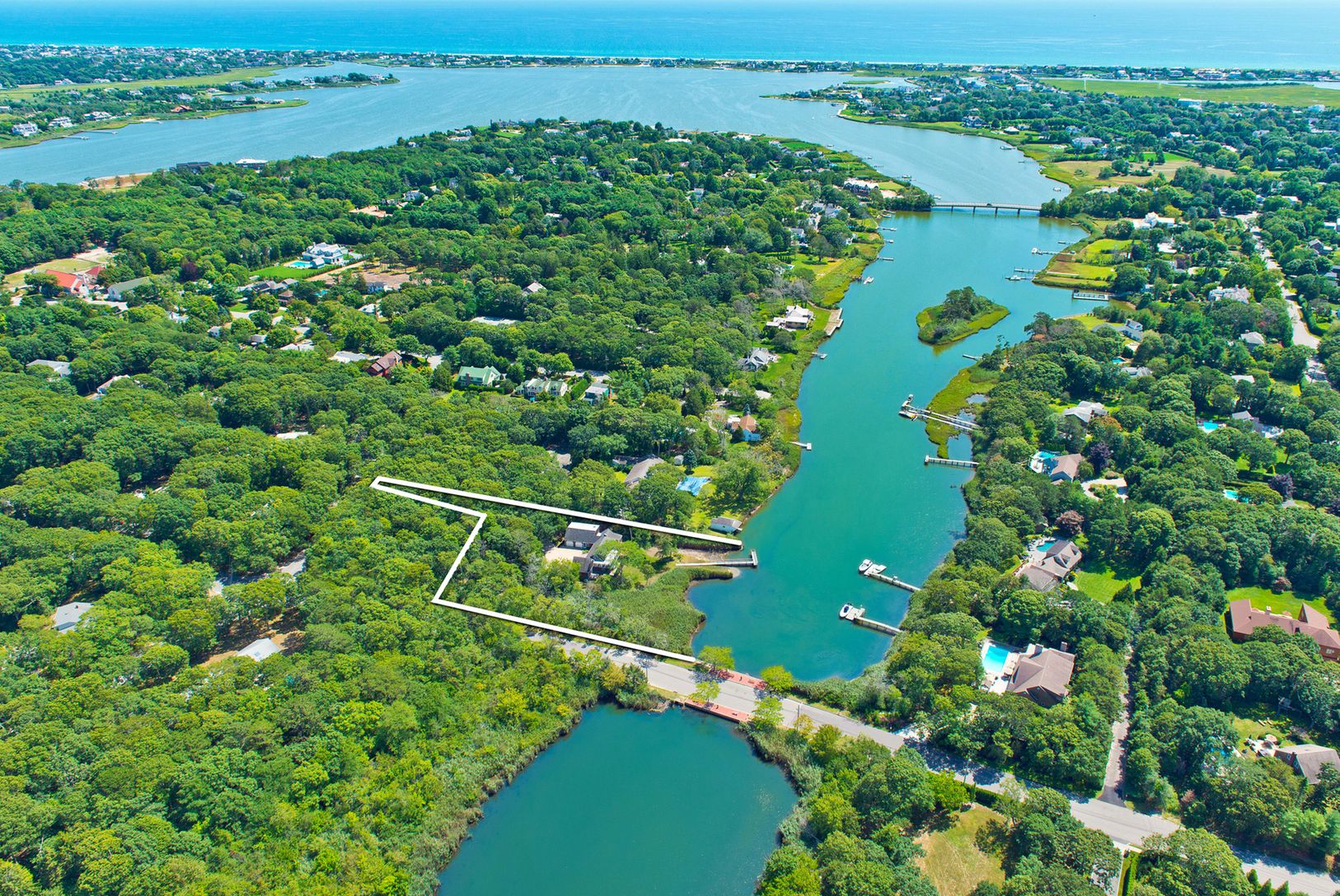 Exclusive. The wooded privacy of this 1.4 acre property, central location near the village of Westhampton Beach, and excellent water views of Aspatuck Creek with 220' frontage and dock, make this an extraordinary buy. This sun-filled shingled cape features solid construction, wide beam hardwood floors and generous closet space. In addition, there is a 2-car garage with a guest suite above which includes a living room, spacious bedroom and ba