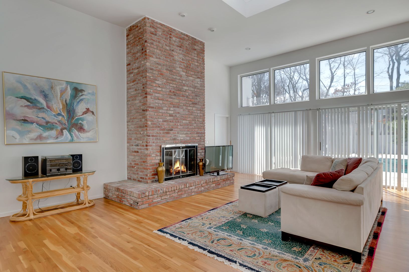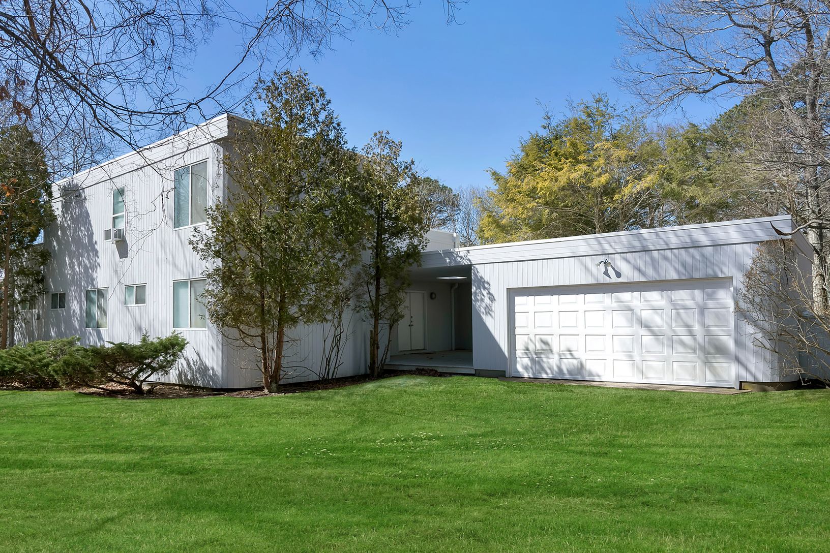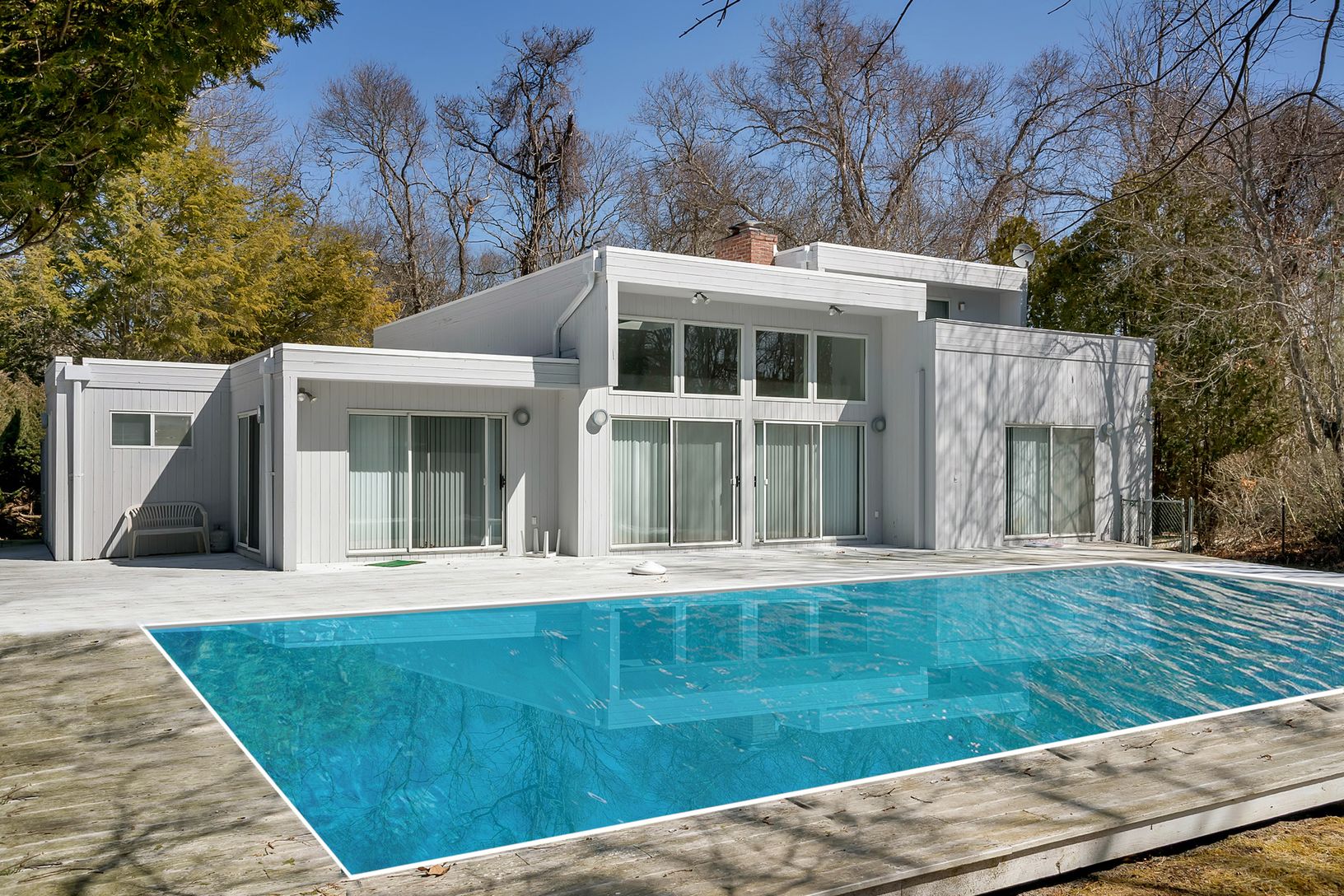 North Quogue contemporary boasts five bedrooms and open, sun drenched layout, it is tucked away on a an acre with pool and tennis. Also available for rent. Easy living with decking and mature landscape.