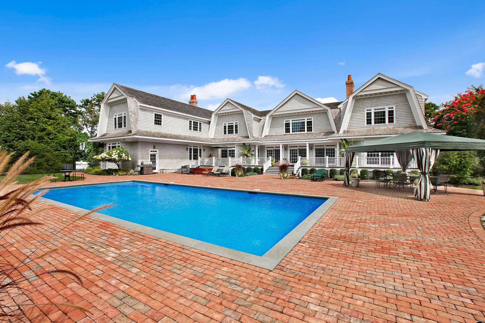 Located in the heart of Quogue Village, this elegant and architecturally stunning Gambrel-roof masterpiece offers the most discerning buyer 7,500 sq. ft. of living space with 7 bedrooms and 8 baths. The large entry foyer--perfect for displaying art--leads to a dream gourmet kitchen, living room with fireplace, formal dining, spacious game room, wine room, laundry and private guest bedroom and bath. Ascend the stairs to the second floor wrap-ar