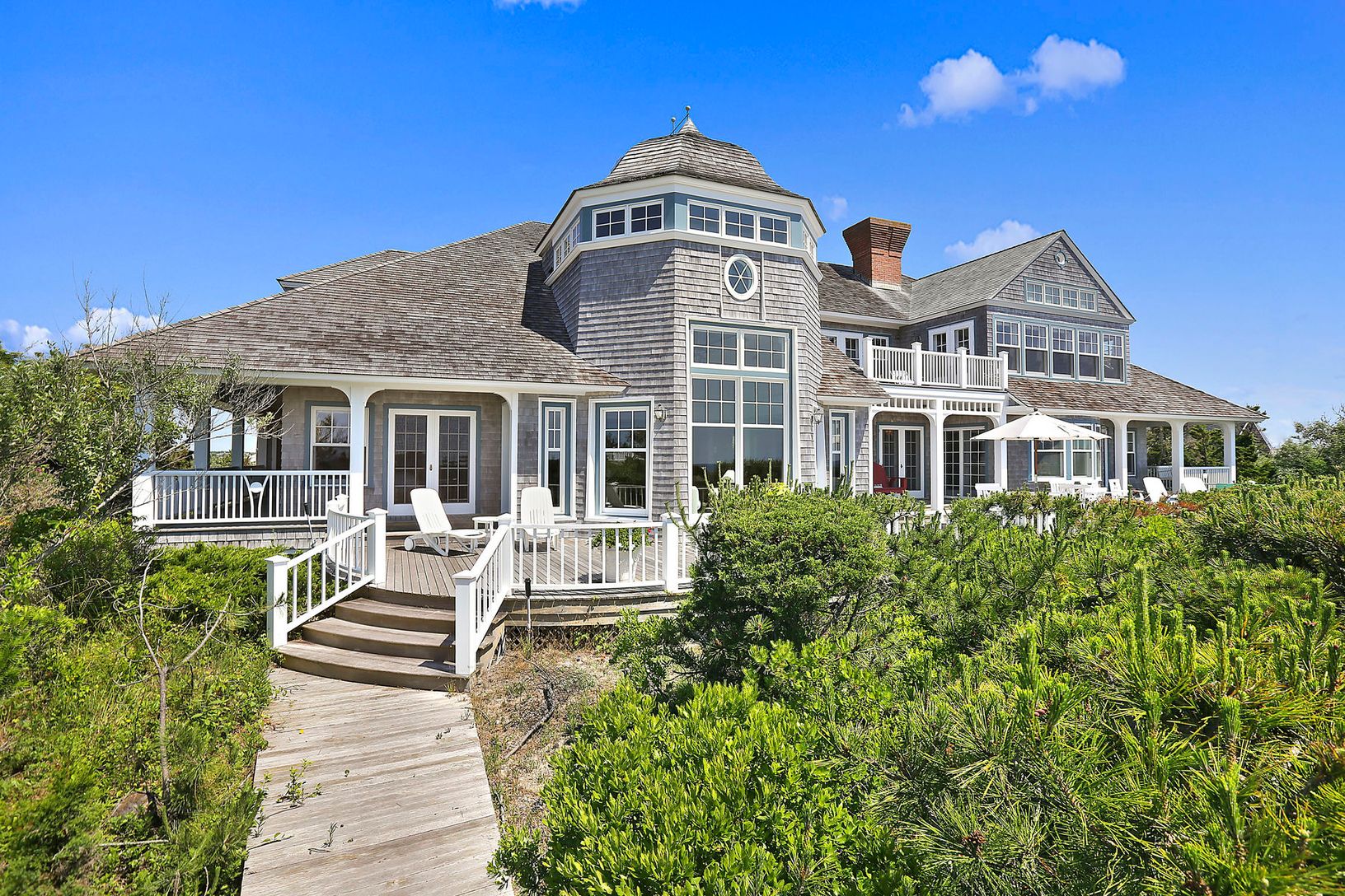 Welcome to "Four Winds," a timeless oceanfront estate located on Dune Road in sought-after Quogue Village. Built in 1989 on 1.4 acres with an impressive 160 feet of ocean frontage, this Shingle-style home was designed by famed Hamptons architect Eugene Futterman (with assistance from Peter Cook and Eric Woodward). From the turrets and fresh-air porches to the numerous decks and balconies, this 10,622 sq. ft. beach home was artfully designed to