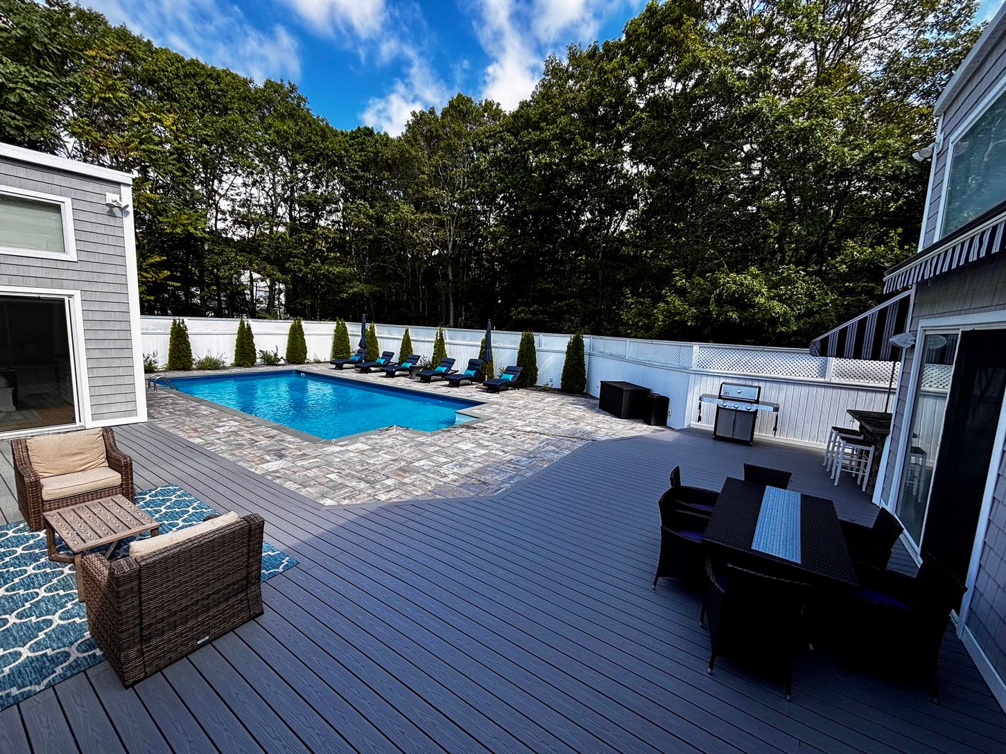 This light-filled Quogue Village contemporary home was completely renovated in 2018. The open floor plan is perfect for entertaining. The home offers 3 bedrooms, 2 full baths, and a powder room. The expansive deck hosts the heated pool and large awning for shade. Minutes to the Quogue Village Ocean Beach. Available from 6/21/26-7/5/26 ($15,000) and 8/16/26-9/7/26 ($20,000 for two weeks or $30,000 for three weeks.)