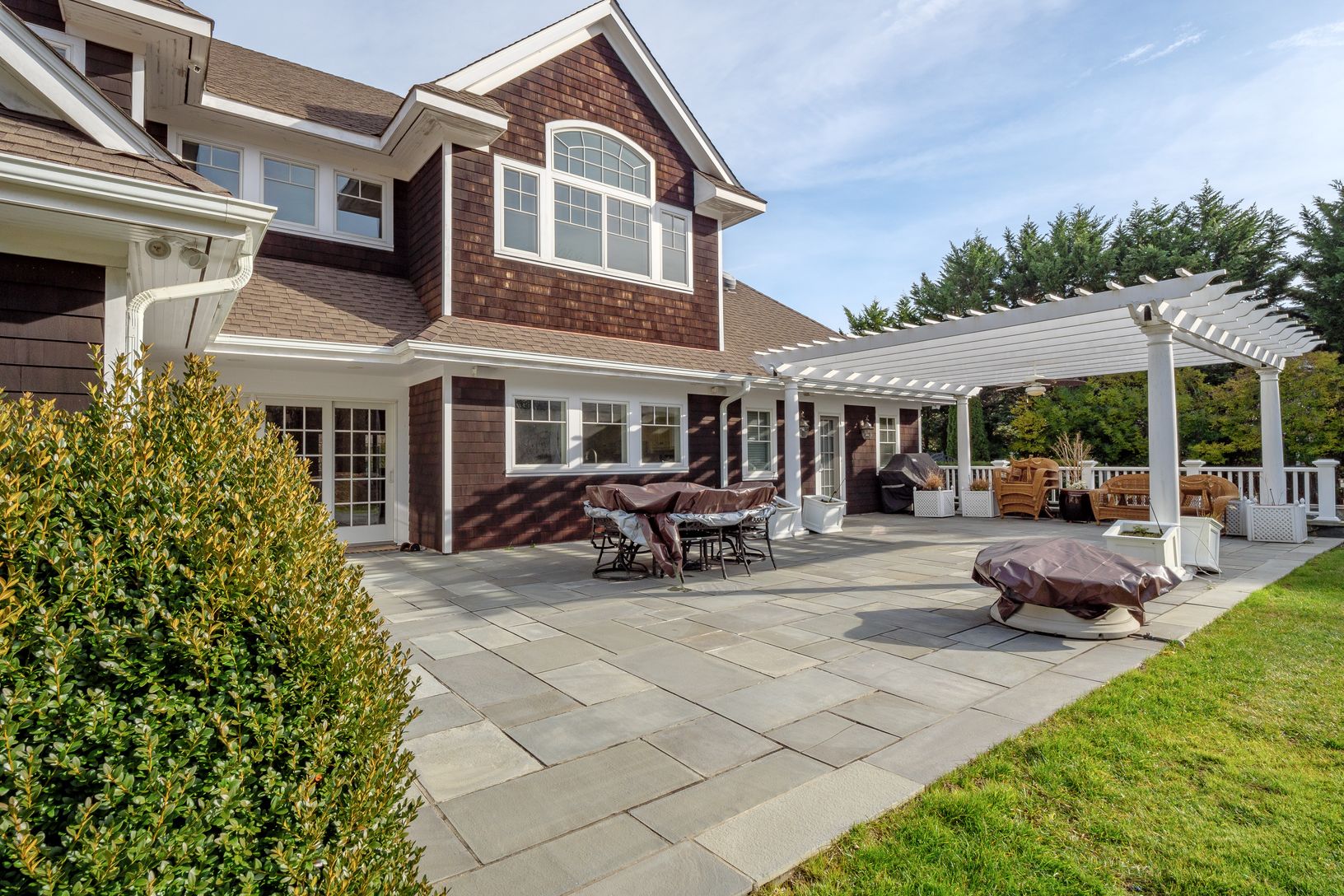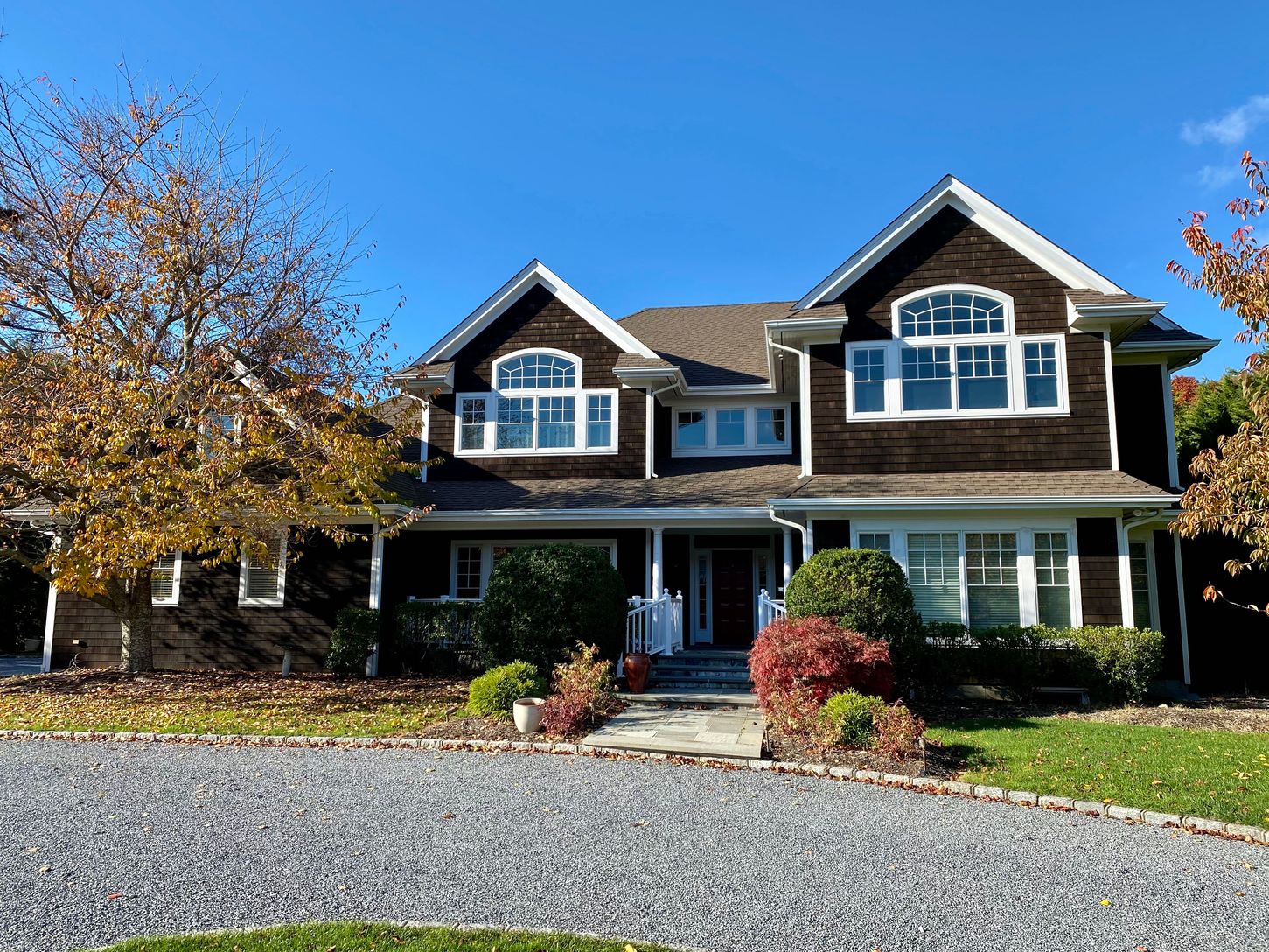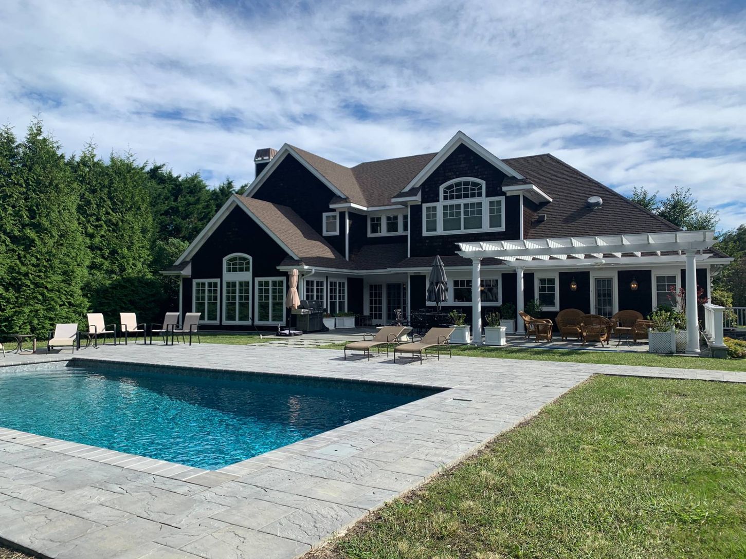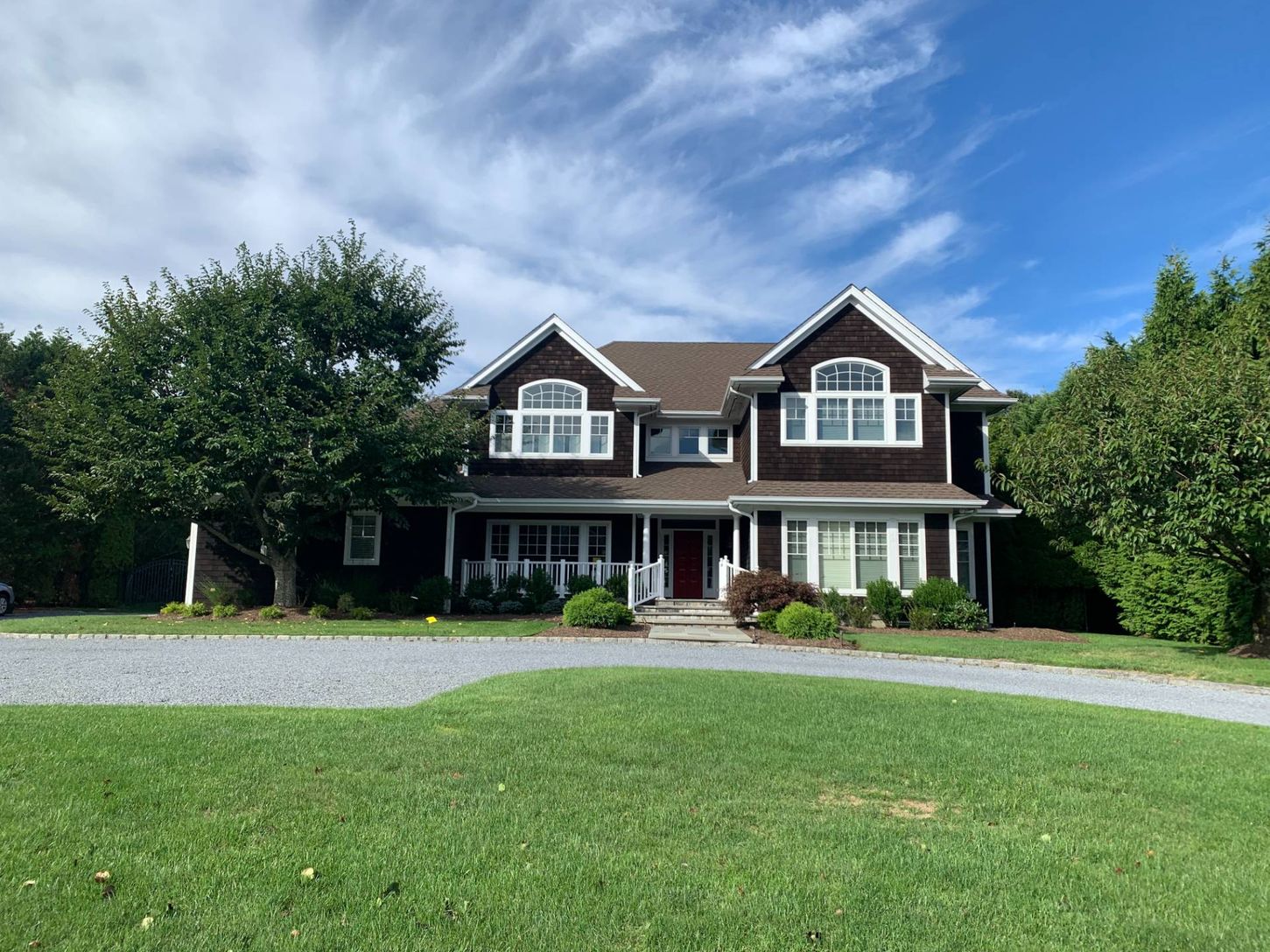 This spacious 5 BR, 6 BA home sits on a quiet cul de sac in Quogue. The first floor features an airy foyer, a formal dining room with seating for 10, a 1st floor owner's suite with marble bath/soaking tub, an open kitchen and an oversize living room with fireplace and views of the leafy back yard. Upstairs there's another primary suite with lofty ceilings, fireplace, and ensuite bath with soaking tub/shower; there's also a queen BR with bath,