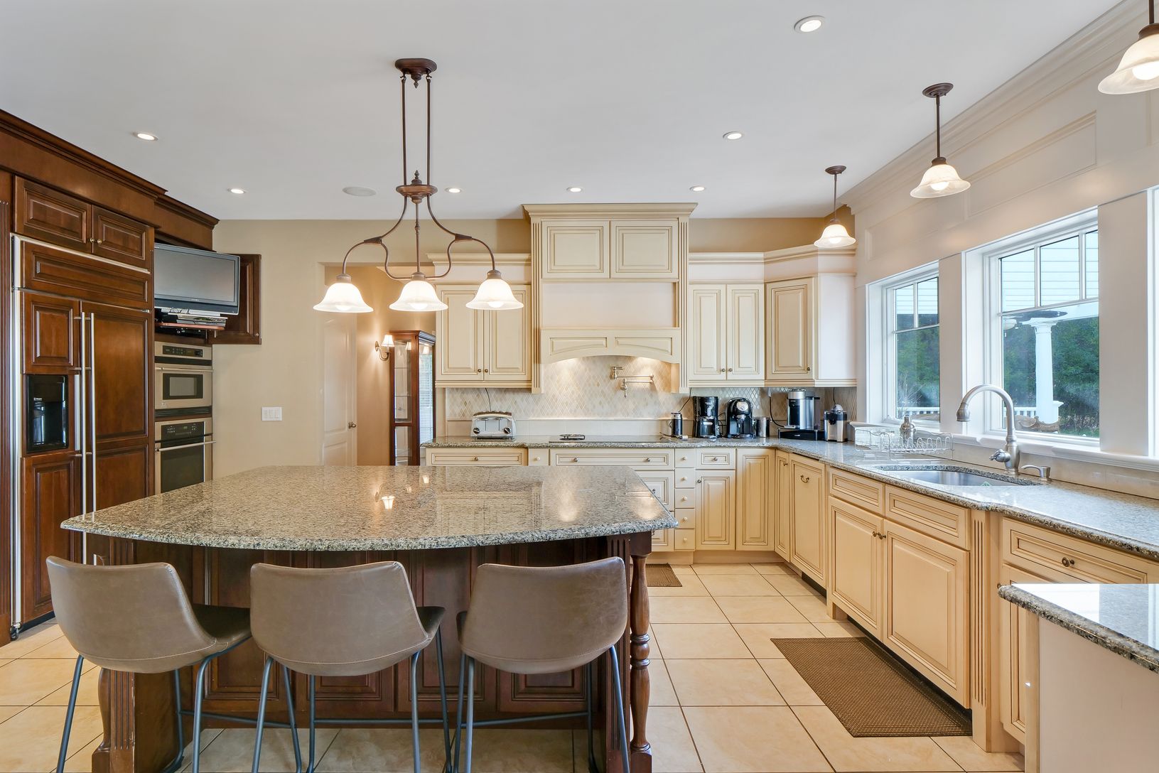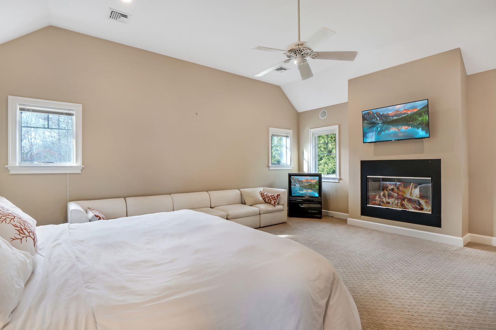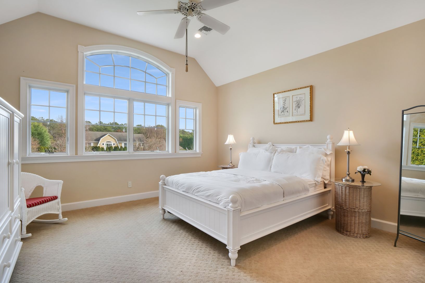 This spacious 5 BR, 6 BA home sits on a quiet cul de sac in Quogue. The first floor features an airy foyer, a formal dining room with seating for 10, a 1st floor owner's suite with marble bath/soaking tub, an open kitchen and an oversize living room with fireplace and views of the leafy back yard. Upstairs there's another primary suite with lofty ceilings, fireplace, and ensuite bath with soaking tub/shower; there's also a queen BR with bath,