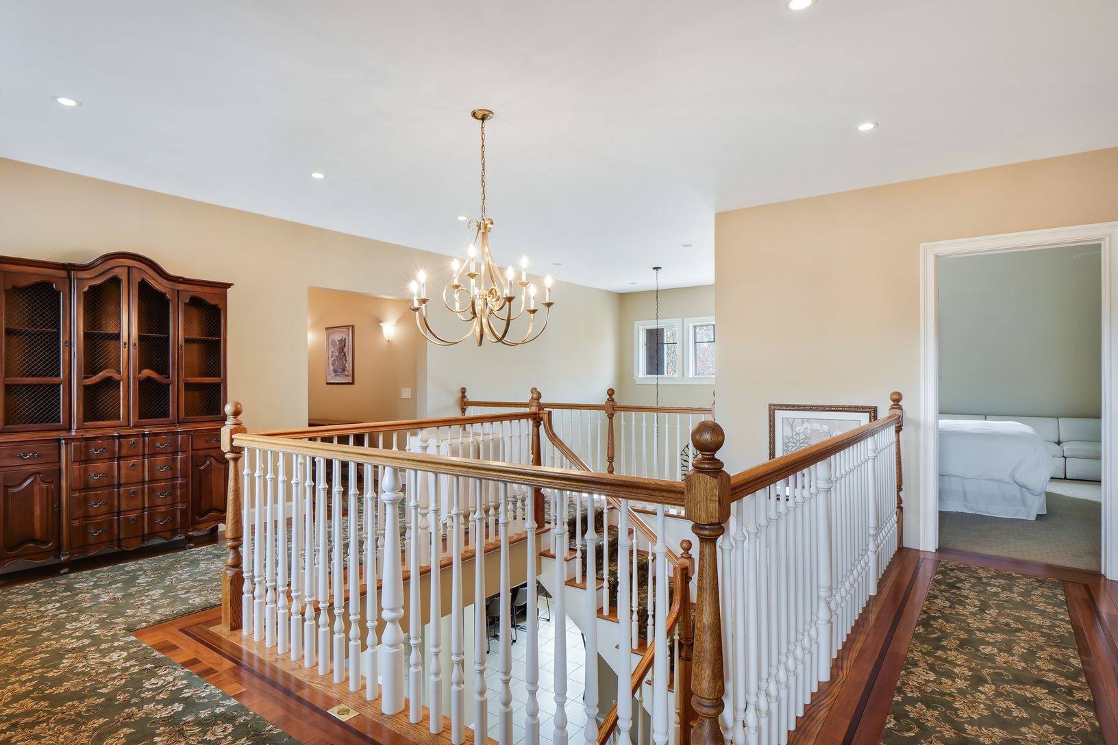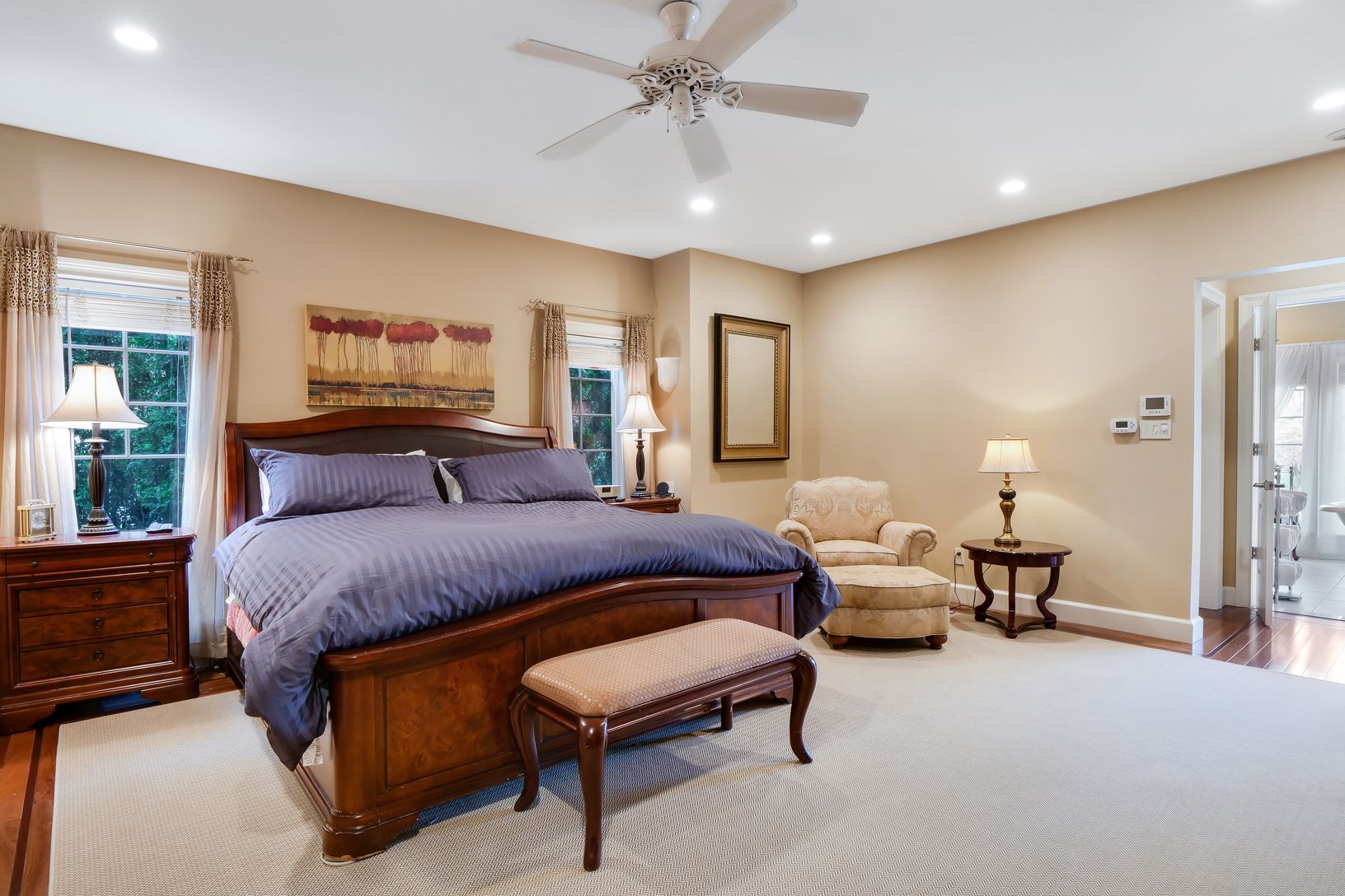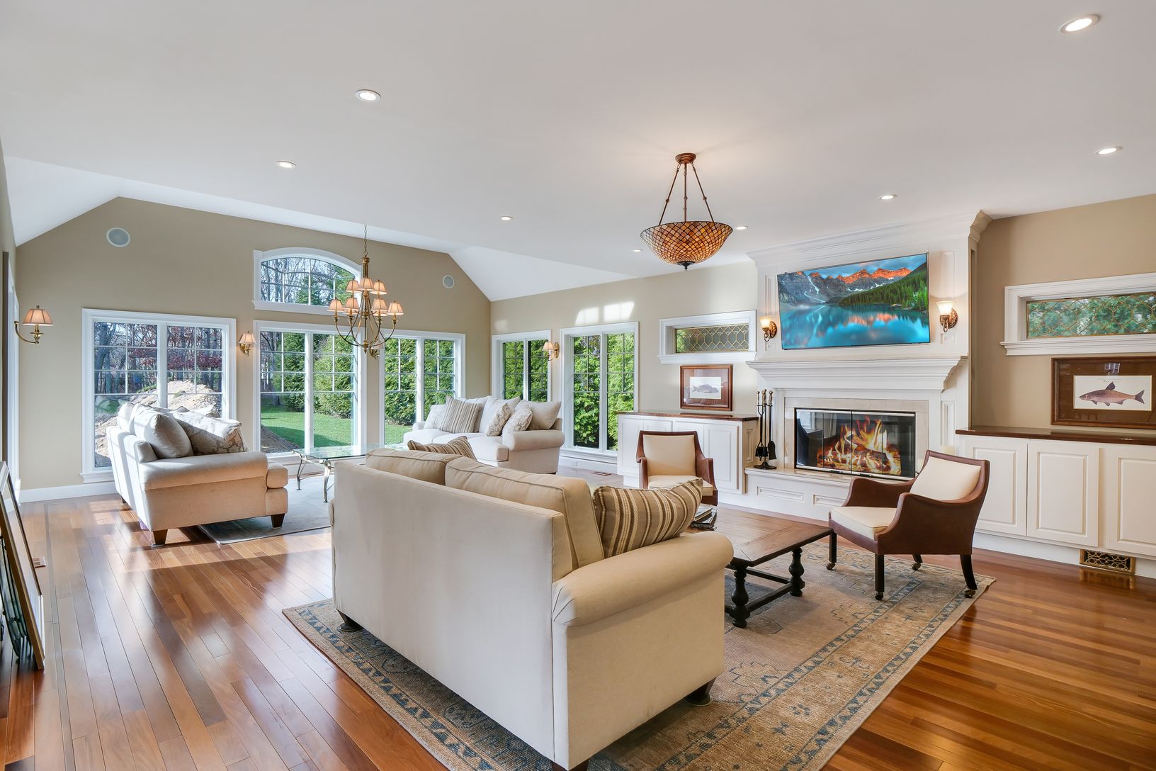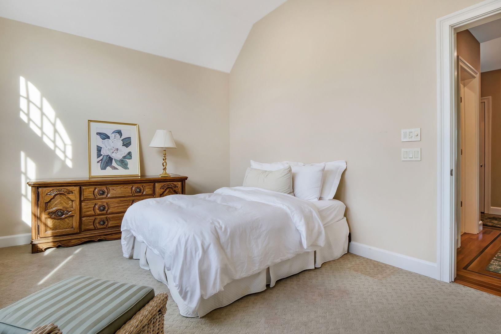 This spacious 5 BR, 6 BA home sits on a quiet cul de sac in Quogue. The first floor features an airy foyer, a formal dining room with seating for 10, a 1st floor owner's suite with marble bath/soaking tub, an open kitchen and an oversize living room with fireplace and views of the leafy back yard. Upstairs there's another primary suite with lofty ceilings, fireplace, and ensuite bath with soaking tub/shower; there's also a queen BR with bath,