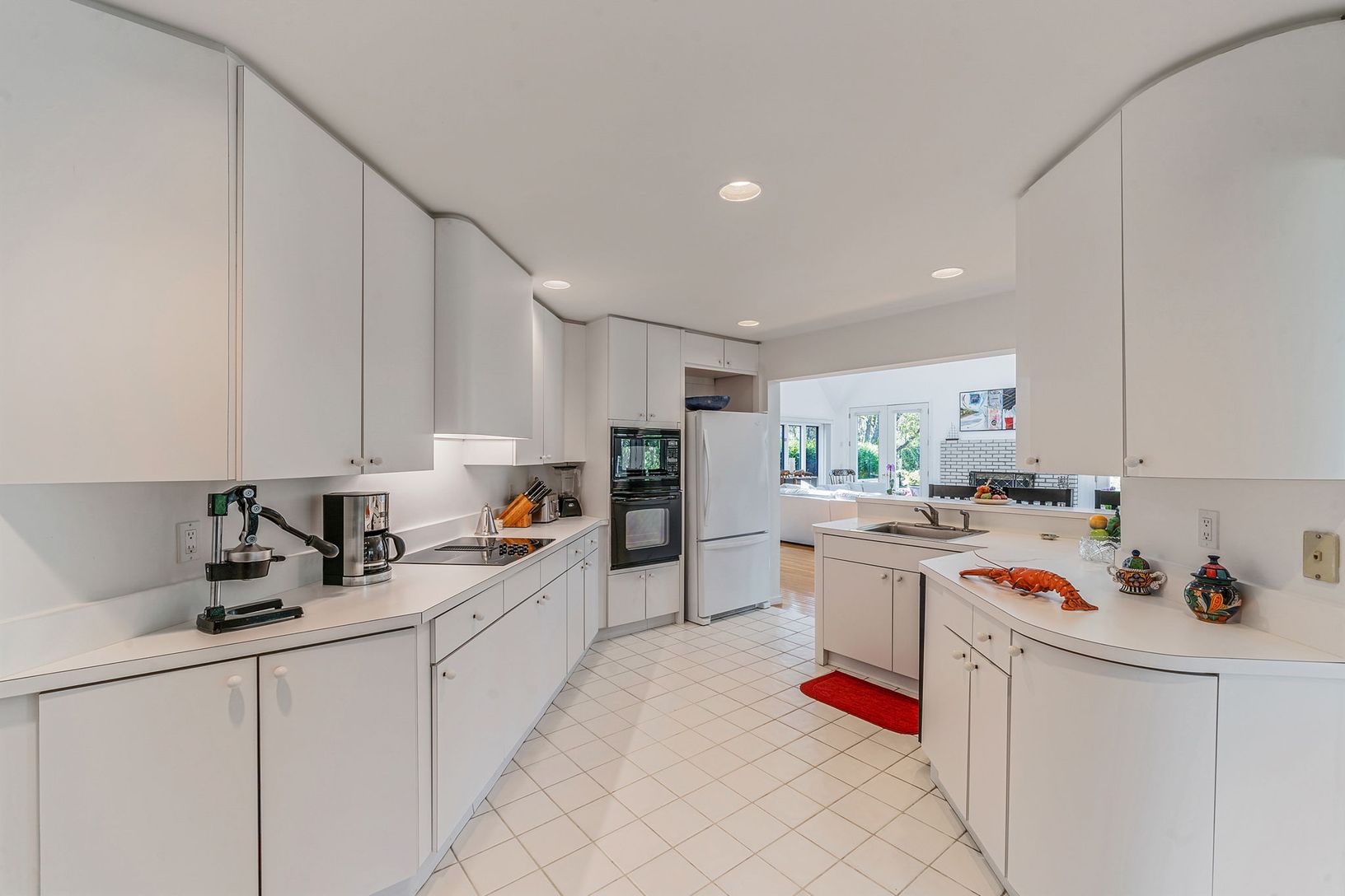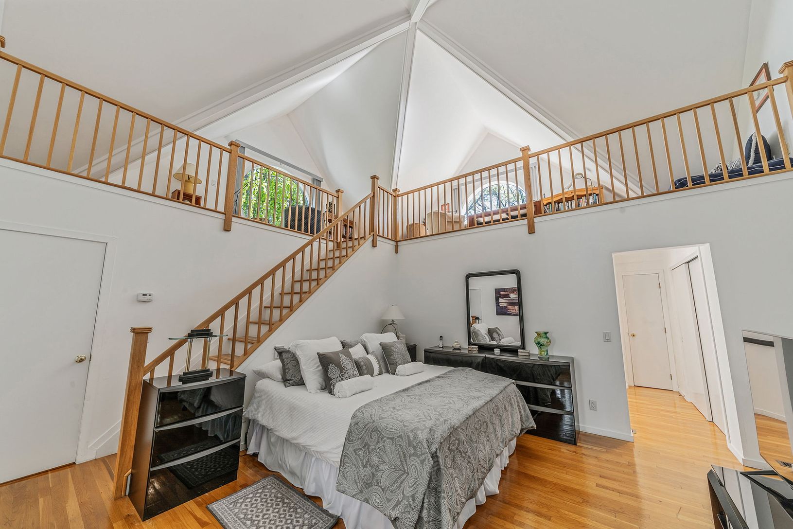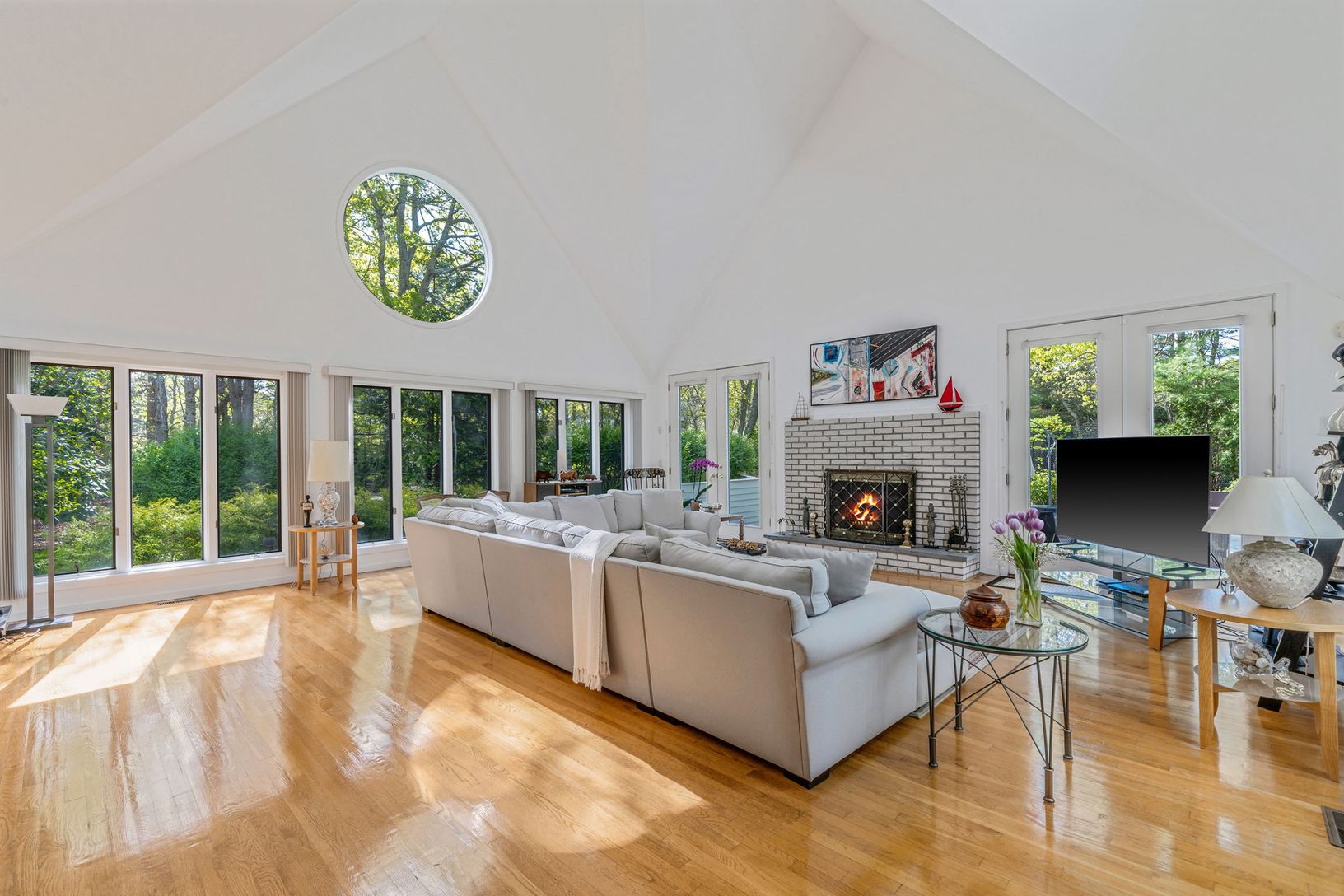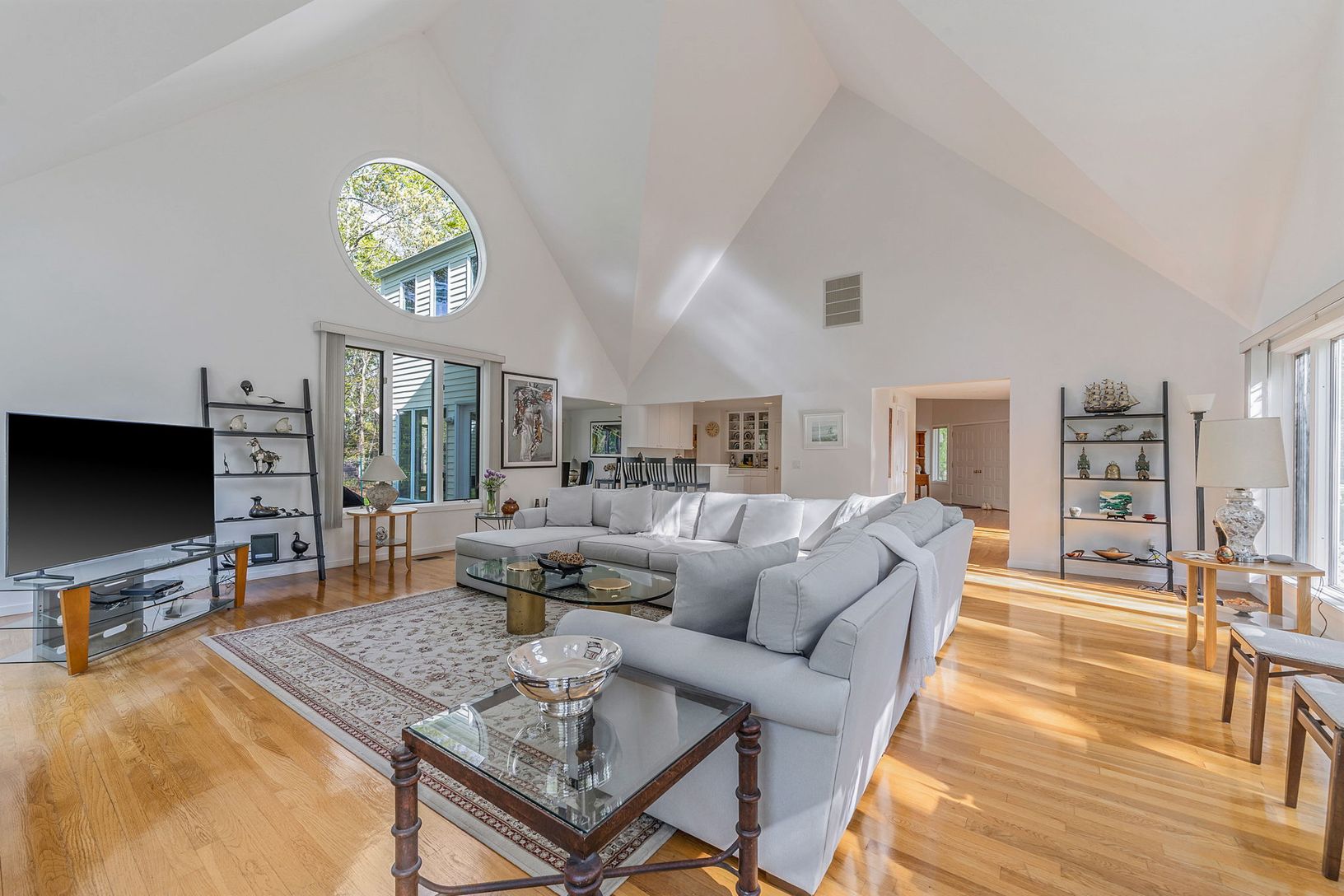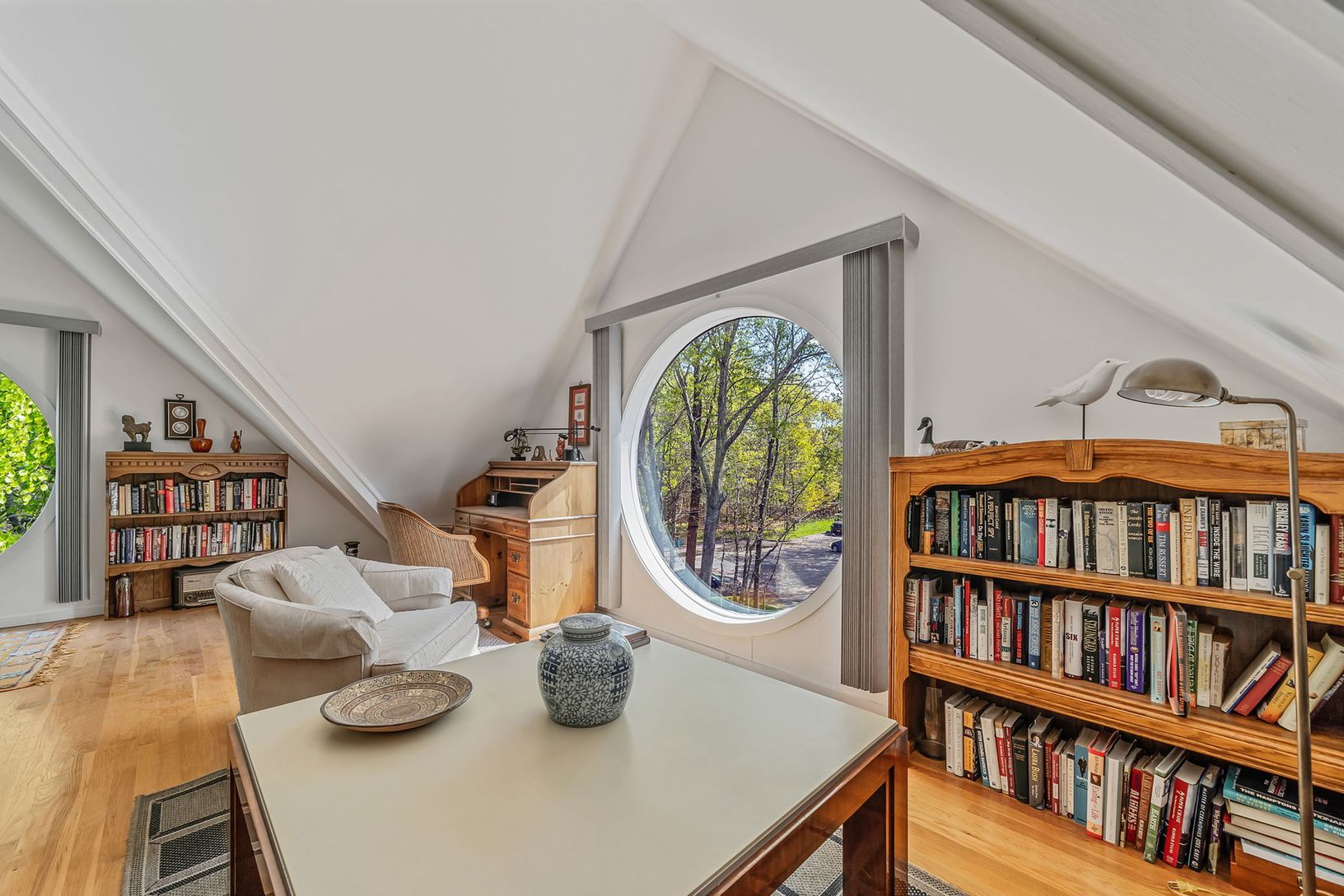 The interior is bathed in natural light, thanks to expansive circular windows, enhancing the spacious main living area. An open layout ensures seamless