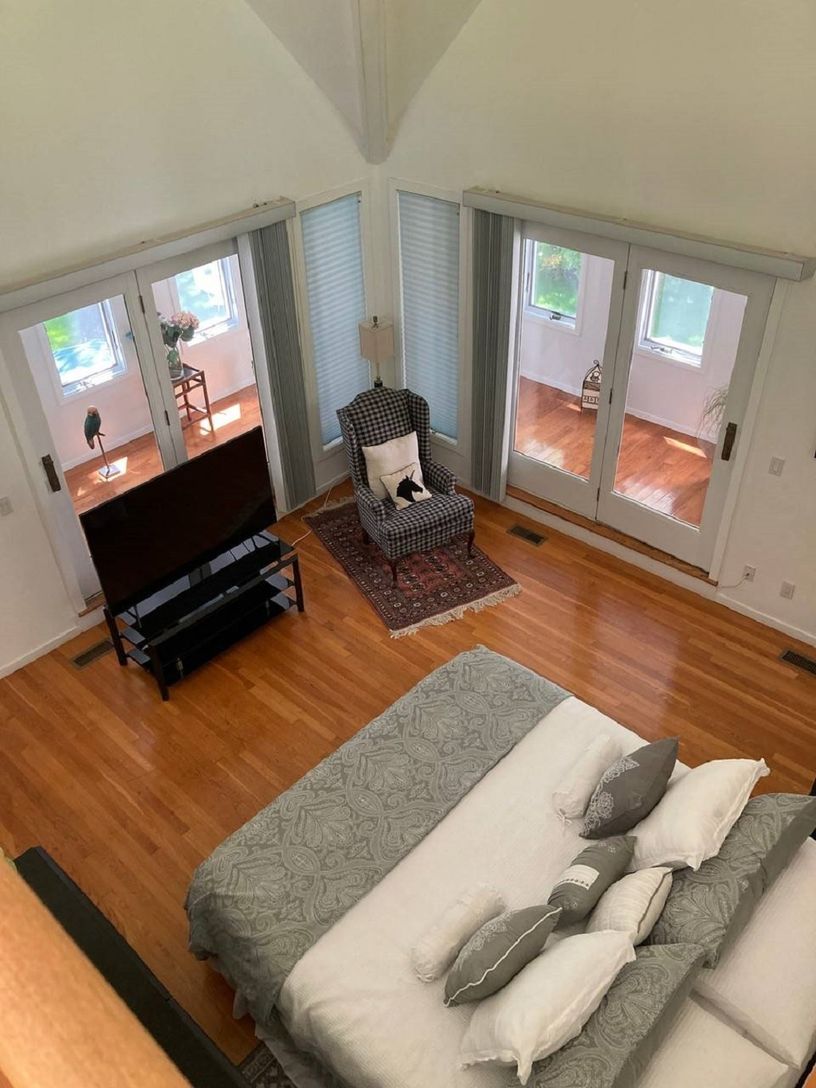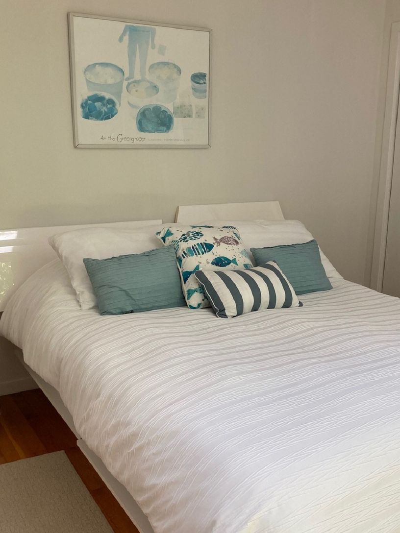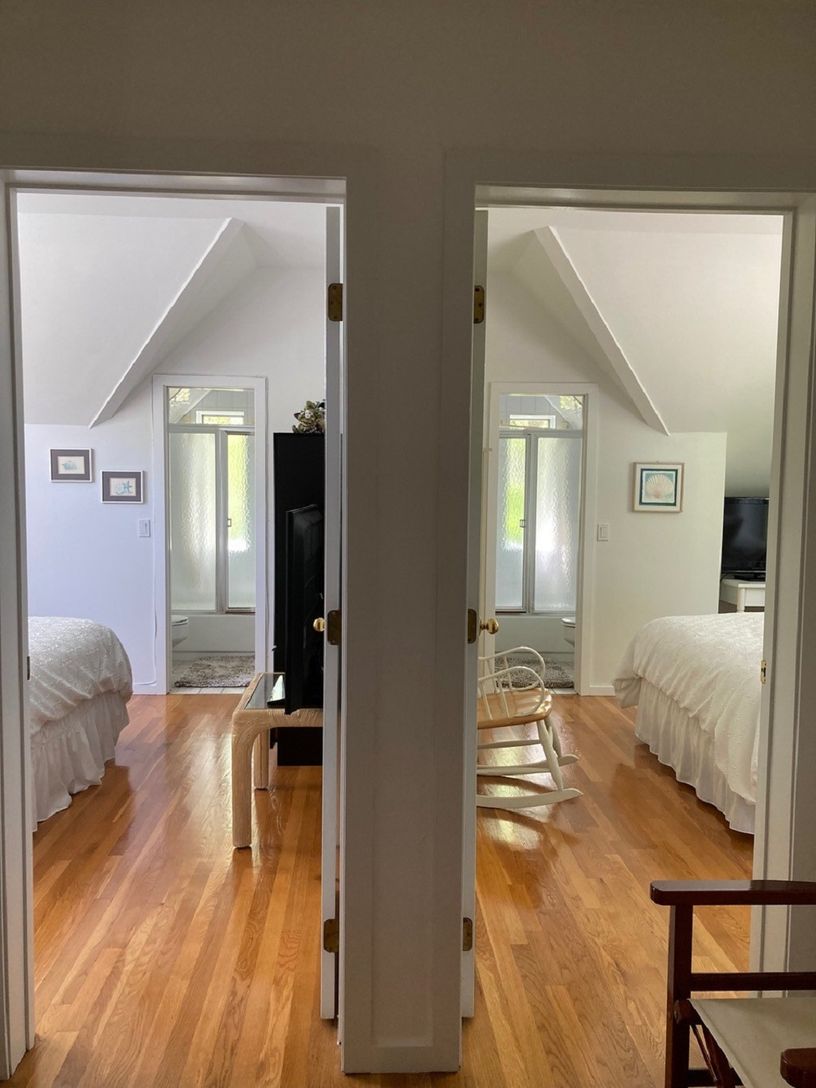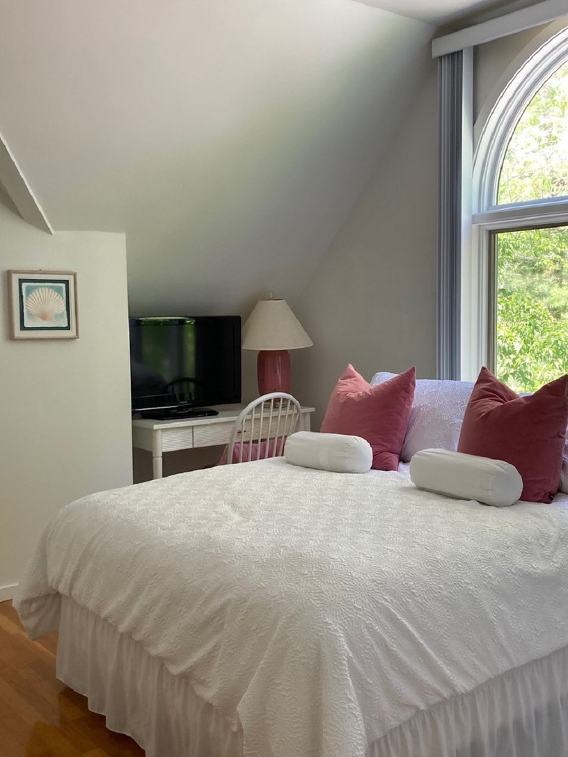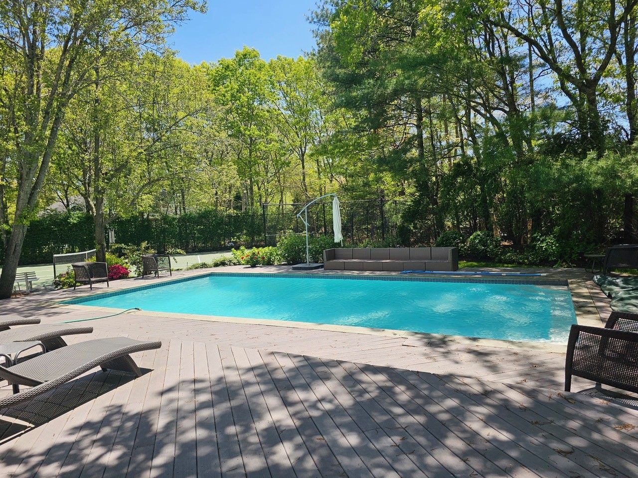 Located in Quogue this home features four bedrooms and four and one half baths. There is a bath for every bedroom. Spacious and open living area with fireplace, eat- in kitchen. Large deck with sliders leading out to gunite heated inground pool and tennis. On a Cul-da-sac. Private, big and bright. Great summer home for the whole family.