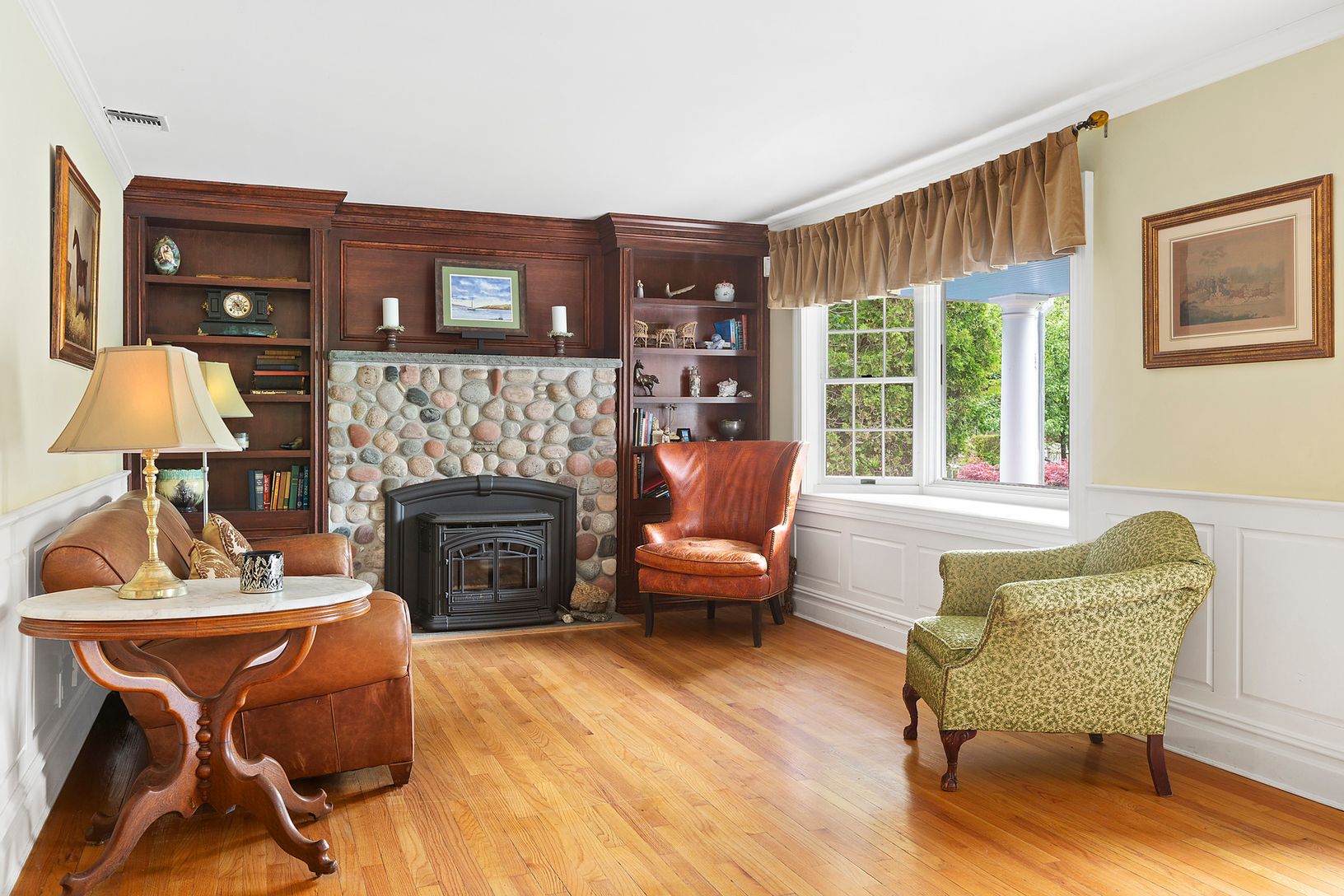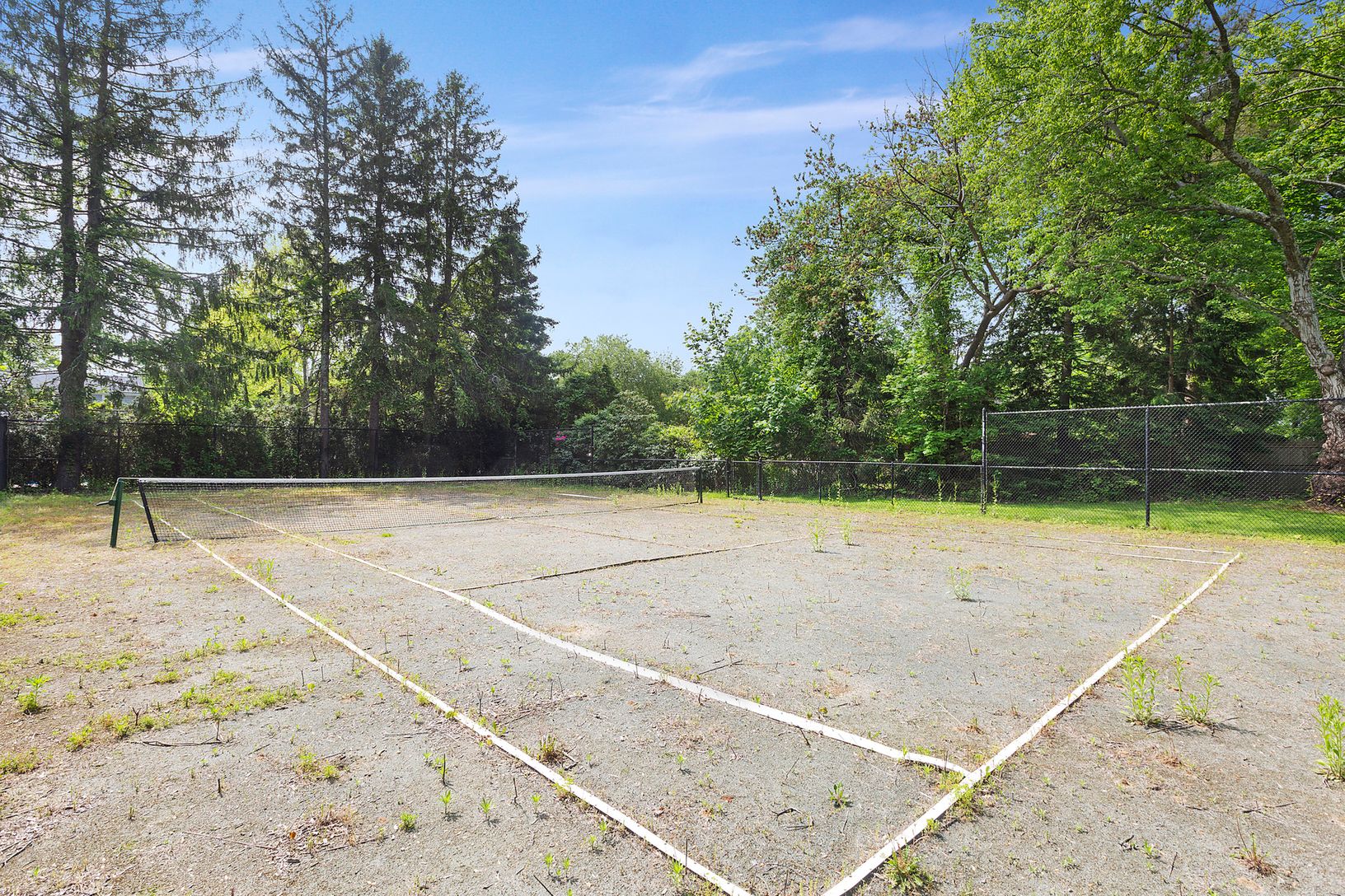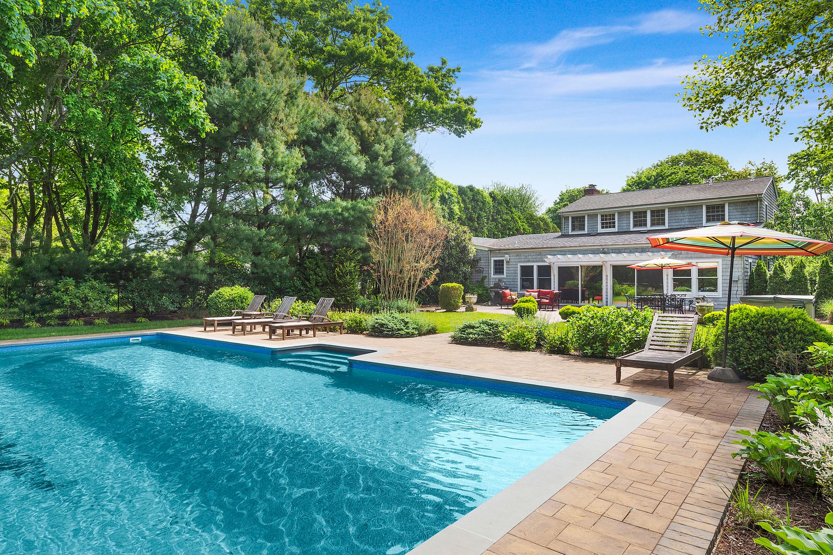 This 5-bedroom home sits on a lushly-landscaped property in Remsenburg, and features an especially fabulous backyard, complete with pool, hot tub, a har-tru tennis court, an entertaining area with built-in speakers, a large koi pond and some giant pine trees. The house itself offers a sunken great room across the back, with a seating and dining area just off of the open kitchen, a cozy den with pellet stove, and a large master suite with luxu