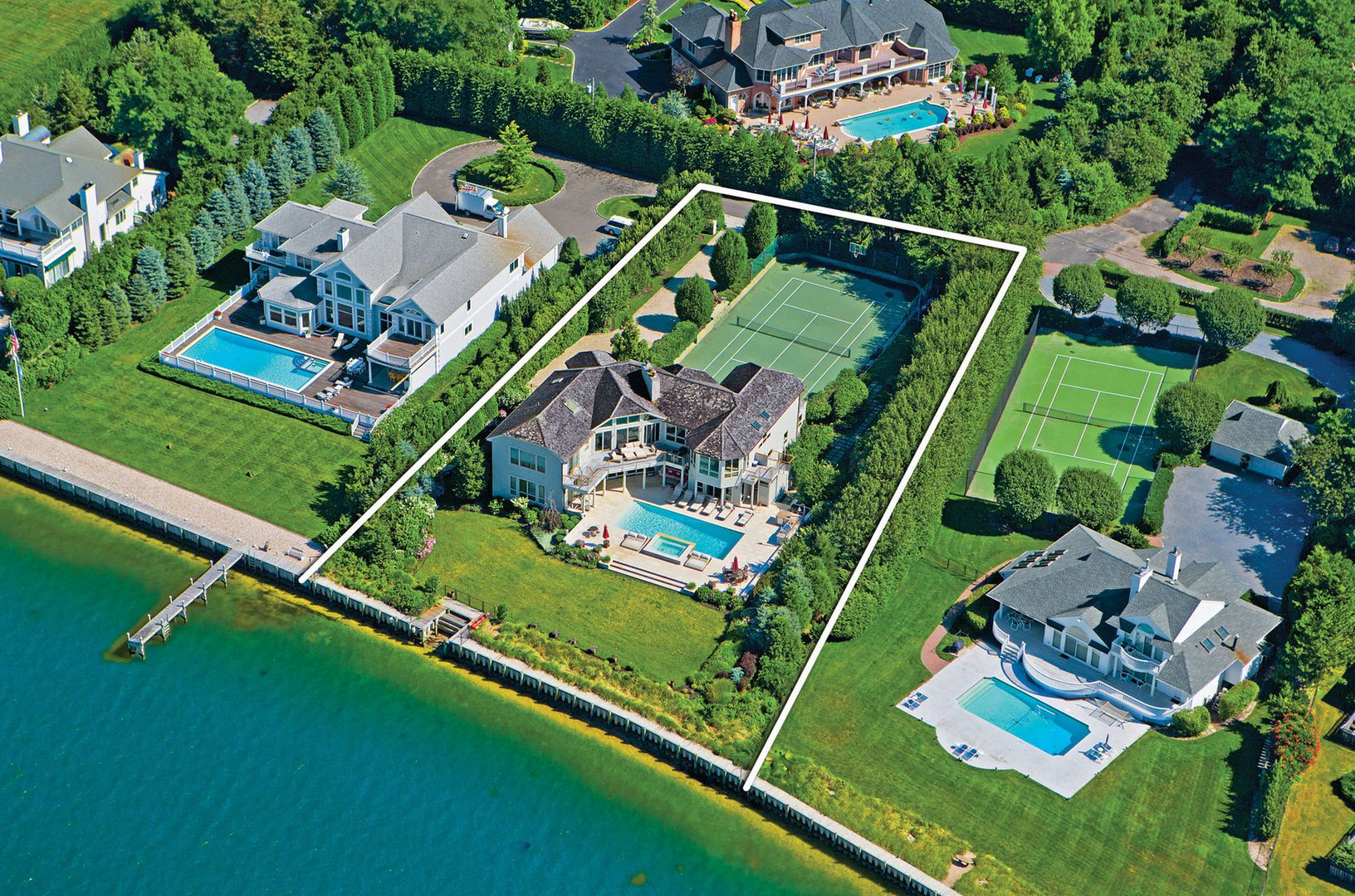This house is what the Hamptons are about: Summer Fun, Swimming, Tennis, Boating & Entertaining. Breathtaking views from this magnificent modern home. This six bedroom home in mint condition with an amazing heated gunite pool with cascading hot tub and all weather tennis court with viewing stand. Add a boat slip with 150 feet of bulkhead on the open bay. Cared for lovingly with upgraded fixtures and built-ins. Enjoy the breathtaking wa