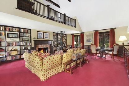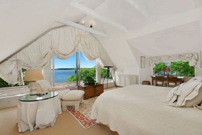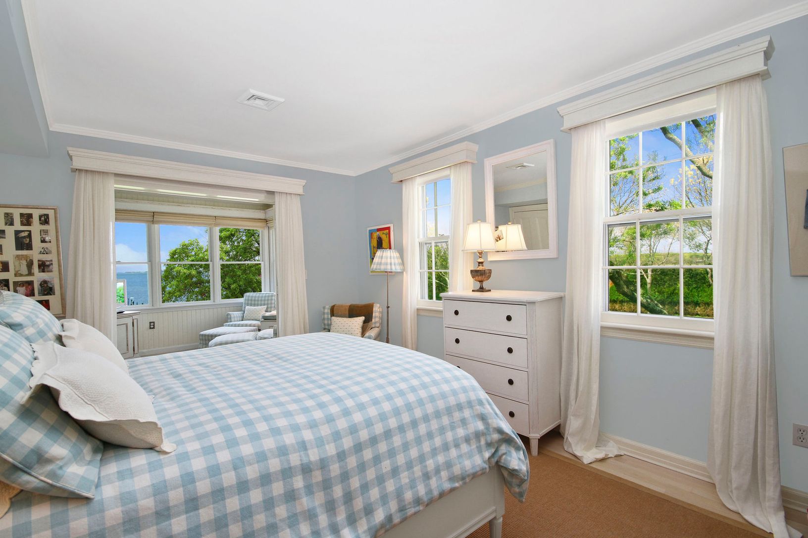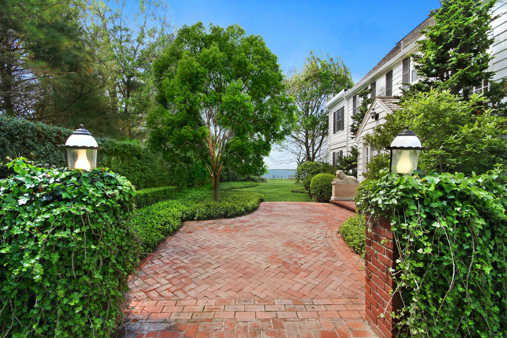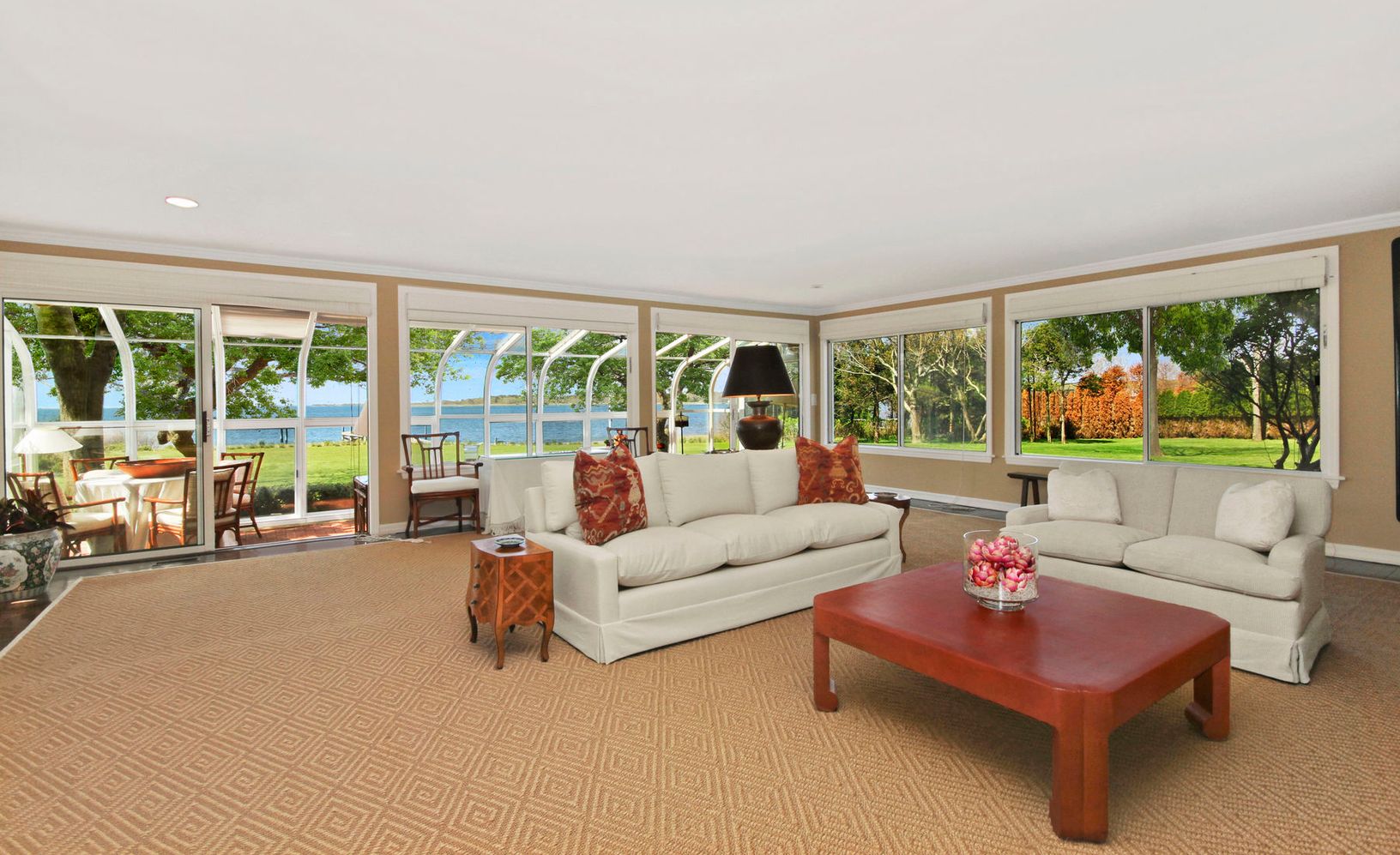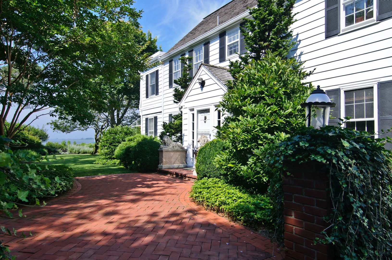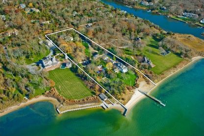Lovely gated traditional home set on 3.5 landscaped acres with over 200ft of frontage on the Bay... Wonderful views of Moriches Bay! Property features a main house with country kitchen with fireplace and French doors to the yard, two butler's pantries, den, bright living room leading to a wonderful sun porch, living room with fireplace and great room with fireplace, cathedral ceilings and loft space which leads to a separate wing with theat
