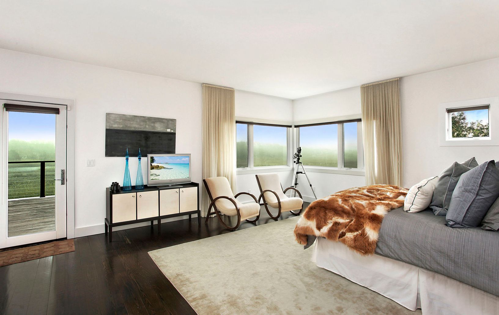 New York based Interior Designer's personal Residence. 3,500sq ft contemporary home with open floor plan located at the end of a quiet Remsenburg Lane. Beautiful wild life views abound throughout this extraordinary home. The professional kitchen has stainless steel appliances, custom cabinetry, 2 Bosch Dishwashers, Sub Zero Refrigerator and Granite counters. The great room with natural stone firplace has 14 ft ceilings and huge windows for op