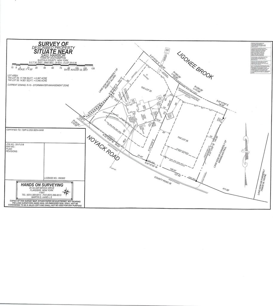 2 Waterfront Lots Offered Together - Close proximity to Sag Harbor Village, this waterfront property offers 190 feet frontage on Ligonee Brook and approx. 250 ft street frontage. R-15 Zoning. 0.34 acre plus adjacent 0.397 acre lot with an existing 3-bedroom 1-level contemporary ranch offering a renovation opportunity or re-build new on this 32,549 sq ft site assemblage. Call for more details including a new survey showing building envelope.