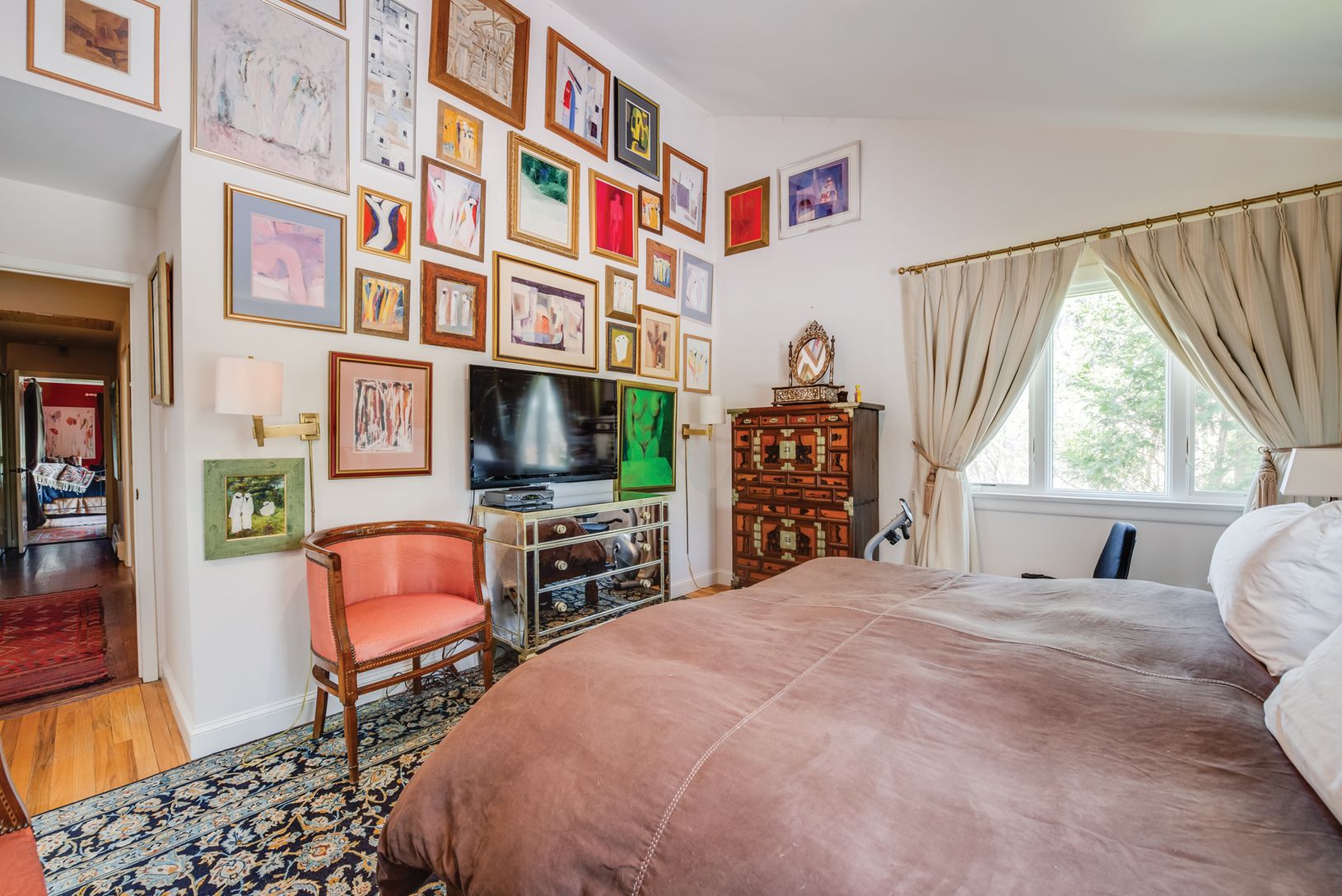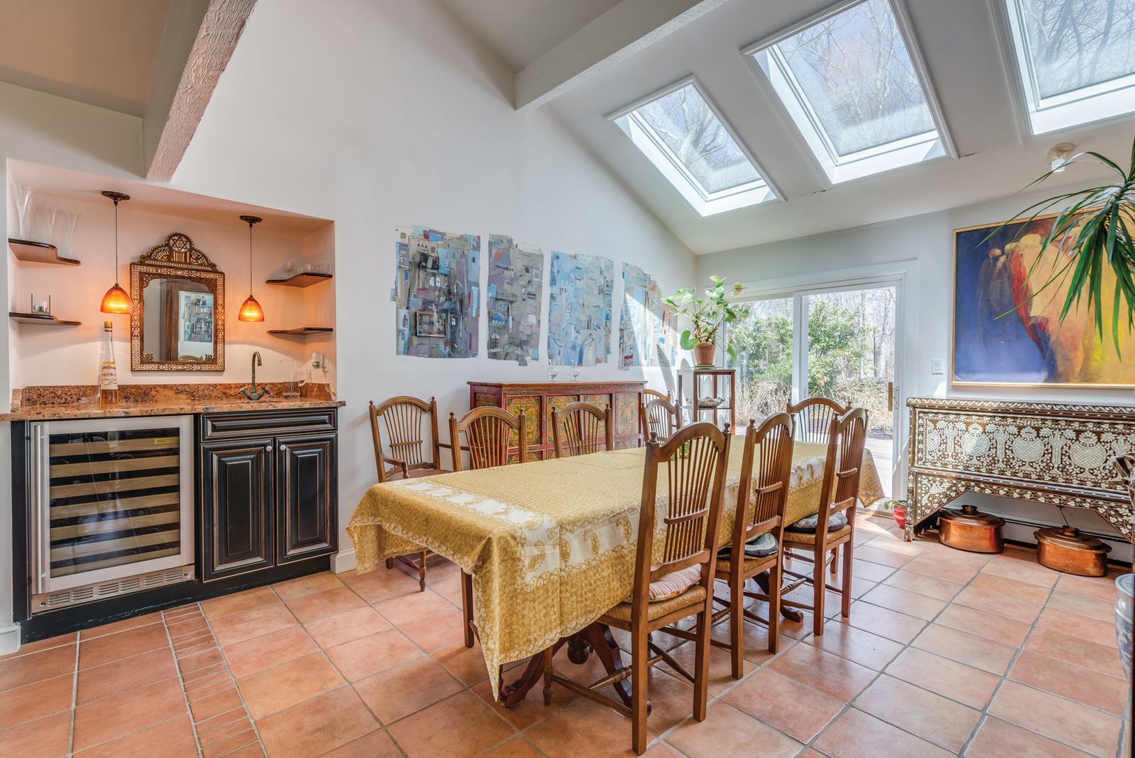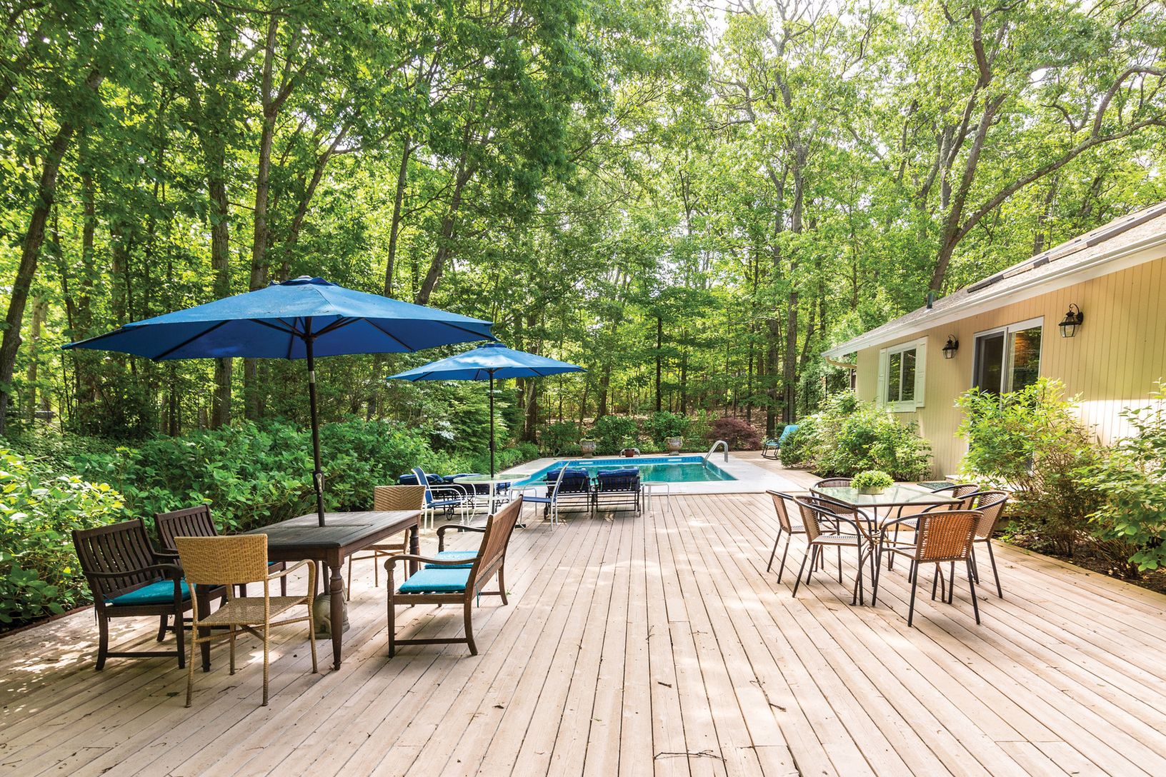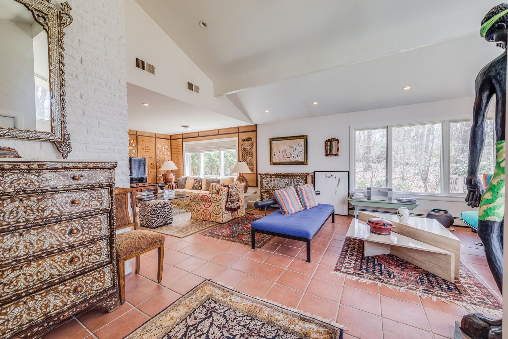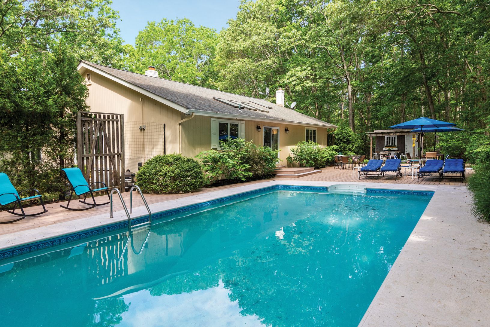 Three bedroom, four bath, one level contemporary with an open floor plan, cathedral ceilings, and tons of light. The home also features a recently renovated kitchen; superbly maintained grounds; a tranquility-inducing pool area; and an attractive winding driveway. Current owner is an artist and has third bedroom set up as a light-filled painting studio.