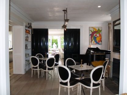 Originally built by clockmaker Benjamin Hope in 1865, the Second Empire-style town house on Main Street in Sag Harbor underwent a complete renovation by renown designer in 2007. The three-story, mansard-roofed residence showcases the public rooms on the first floor (living room, dining room, piano room and kitchen off a long center hall), two bedrooms on the second floor and transformed what had likely been a third-floor attic into an enterta