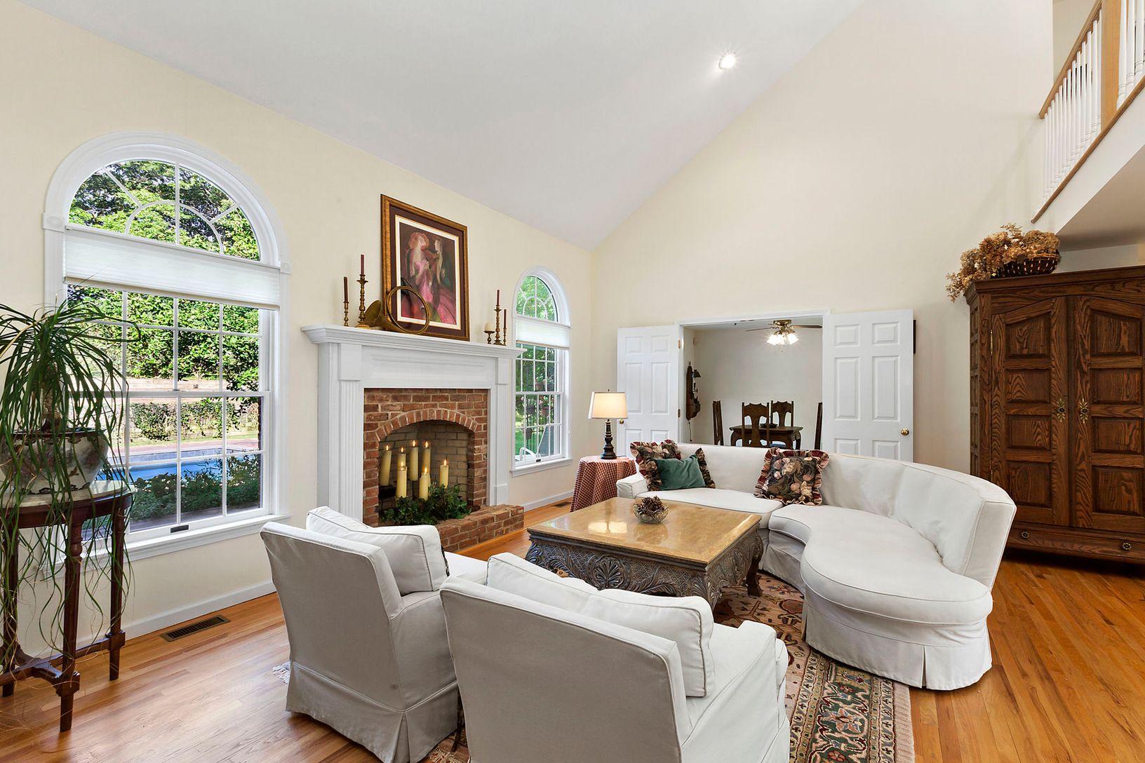A double-height entry foyer leads to expansive first-floor living areas with cathedral ceilings, large windows,