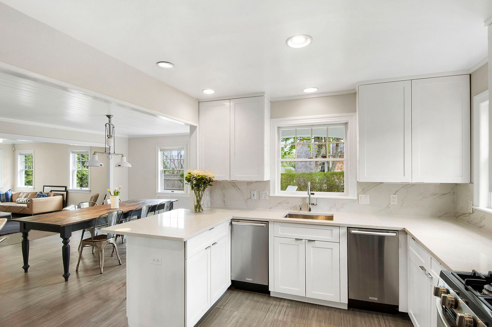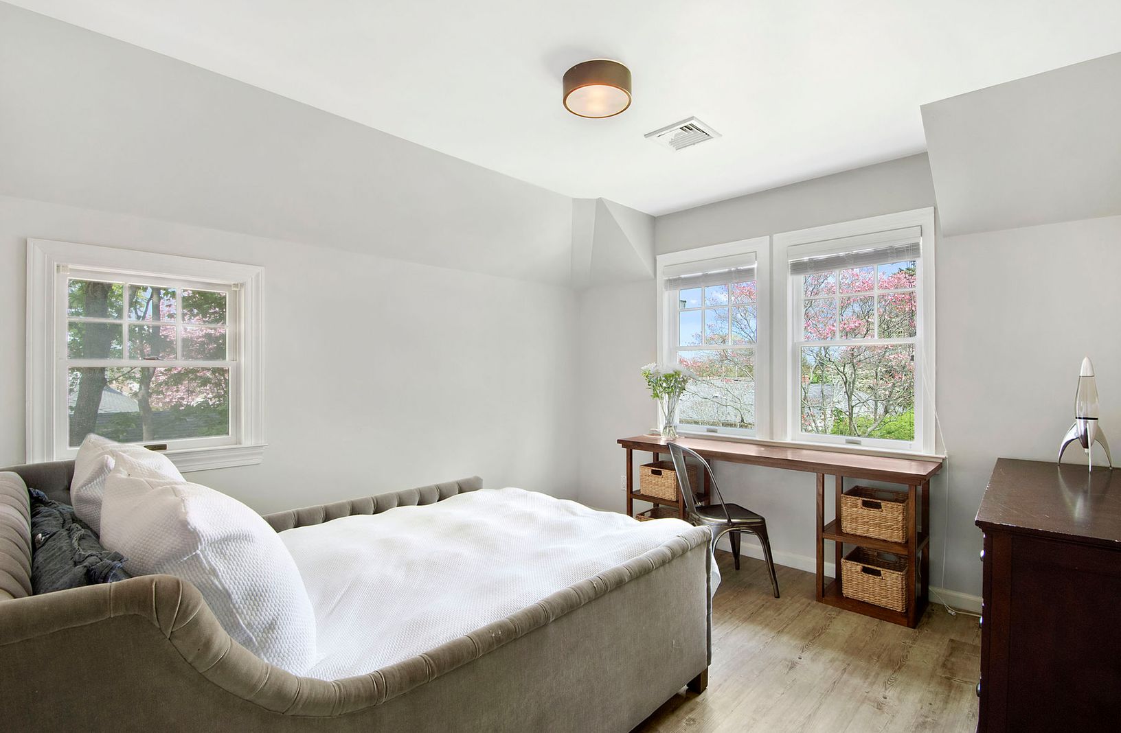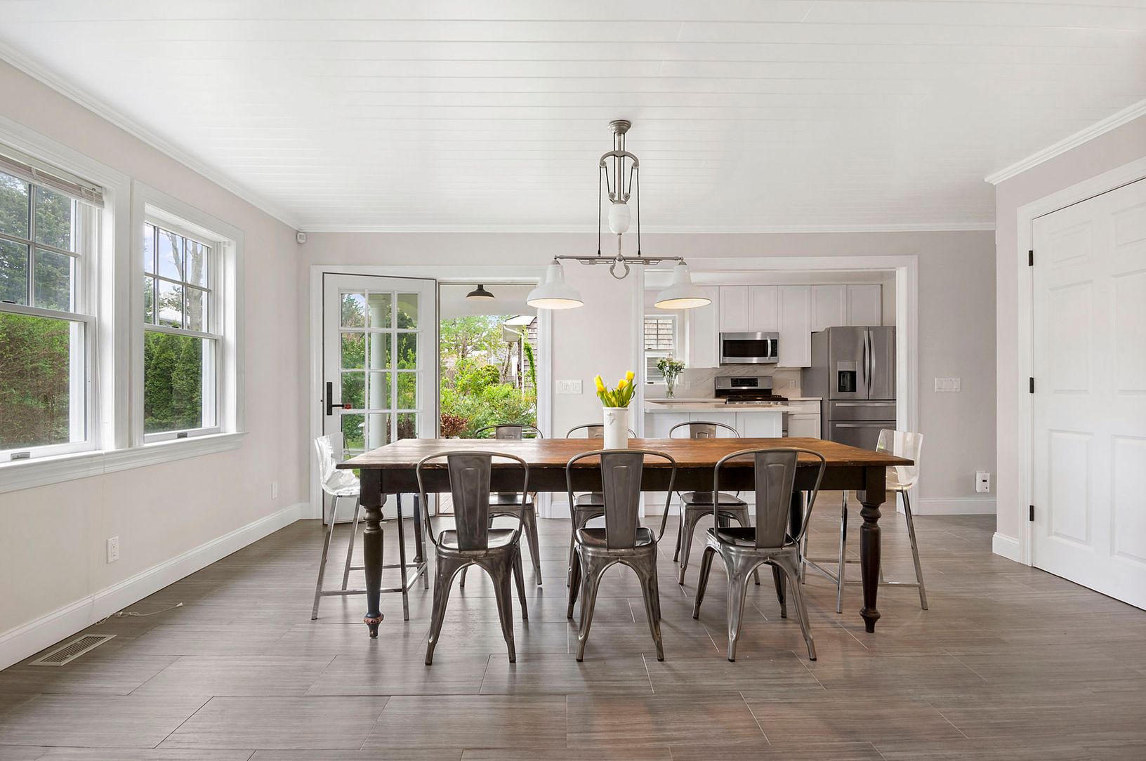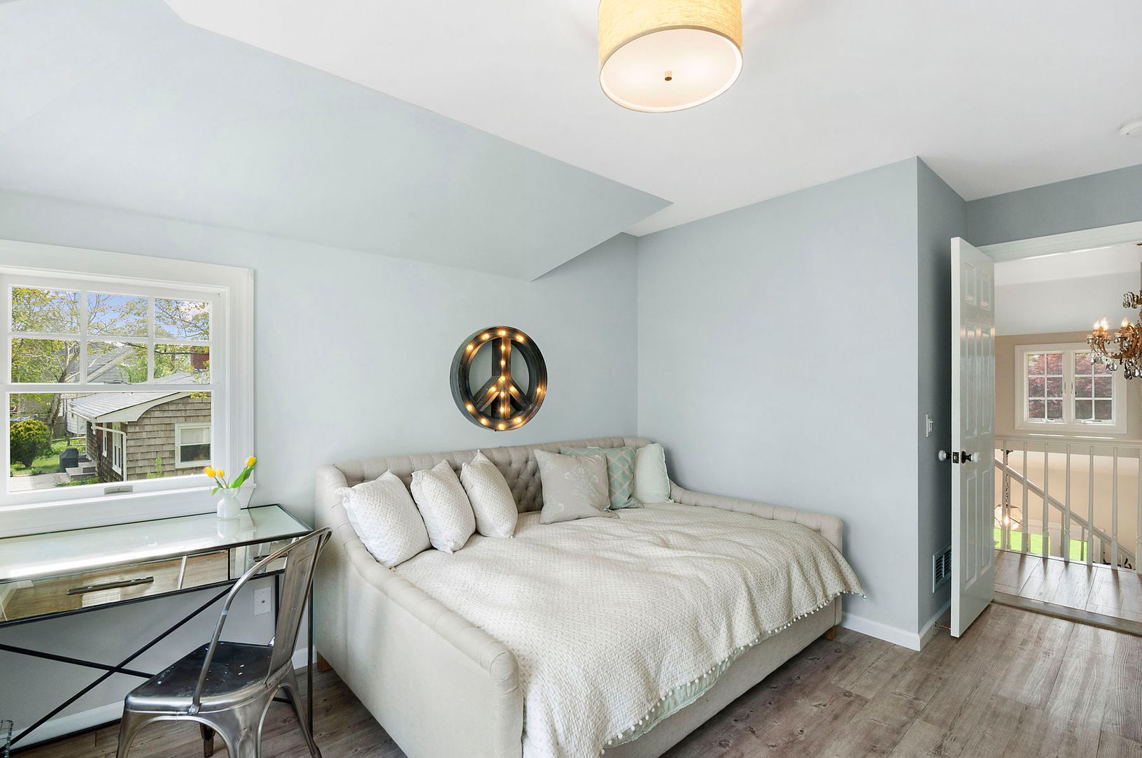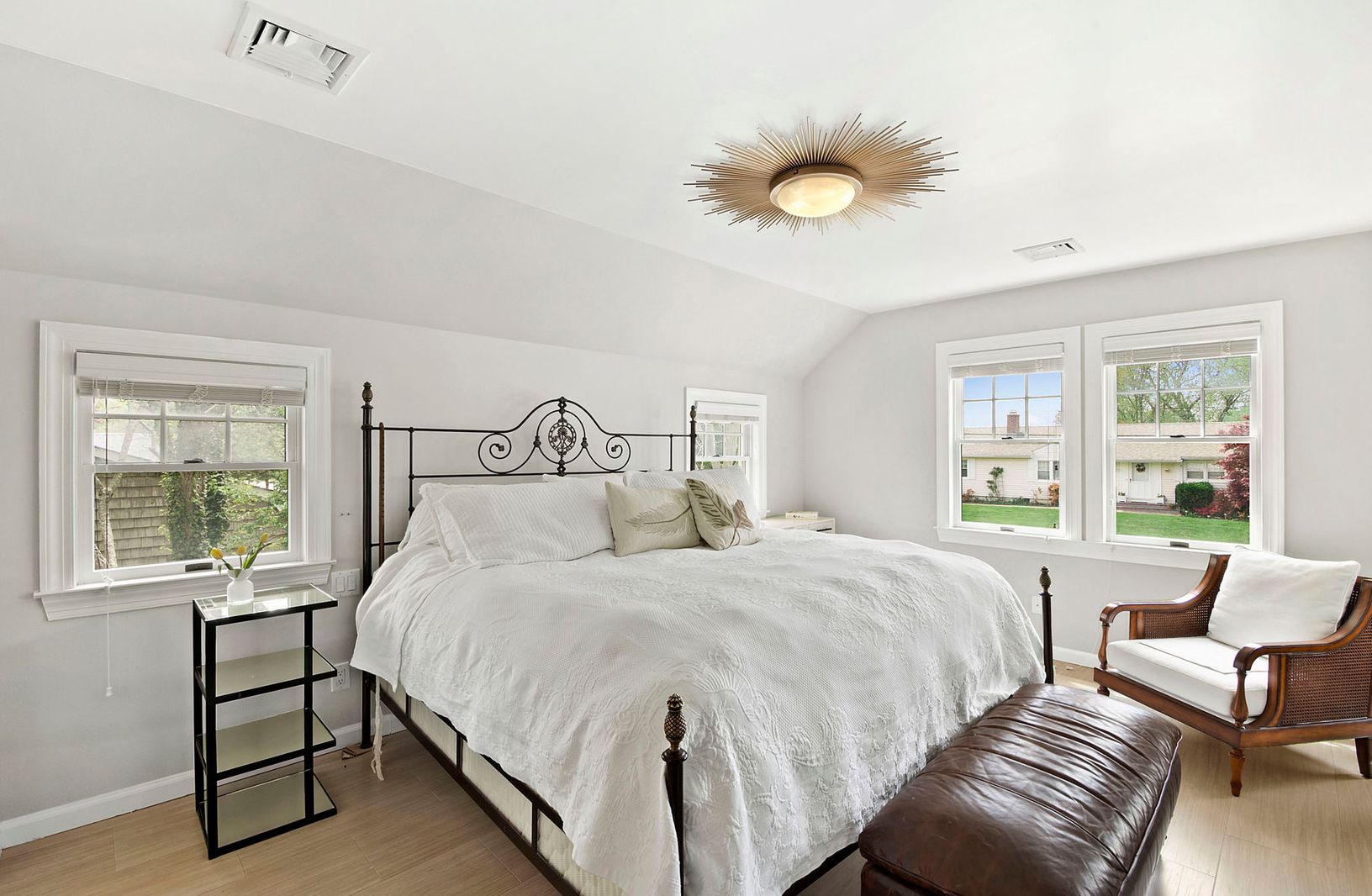 Located in Sag Harbor's Bay Point minutes from Main Street and around the corner from Long Beach and its wonderful sunsets, this 4 bedroom, 3.5 bath stylishly renovated Colonial has all new interiors and a finished basement. Off the foyer, a sunken living room with fireplace connects to the kitchen via a pass through window. An open layout unites the kitchen, dining area with French doors to the rear covered porch, and second sitting room. Ups
