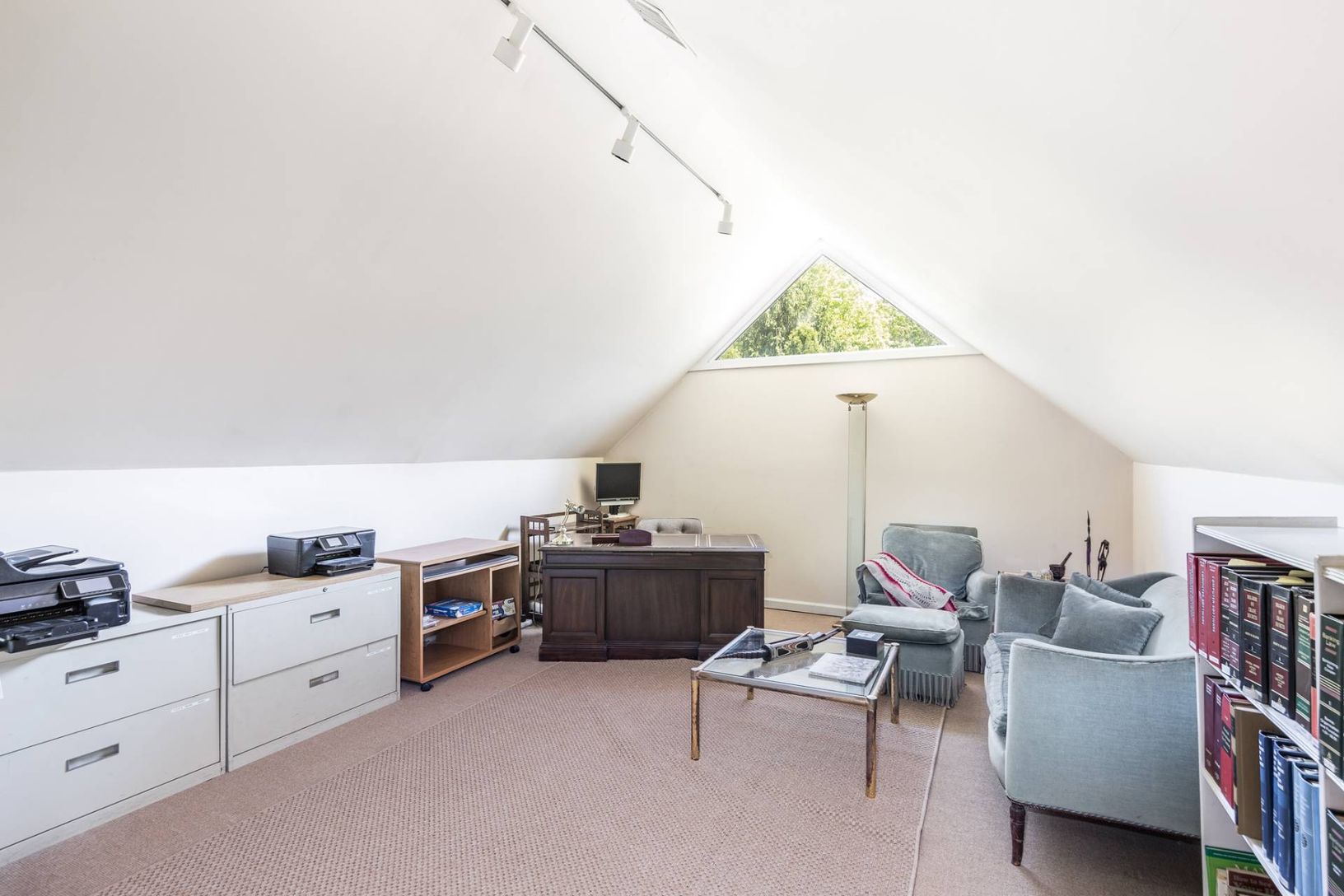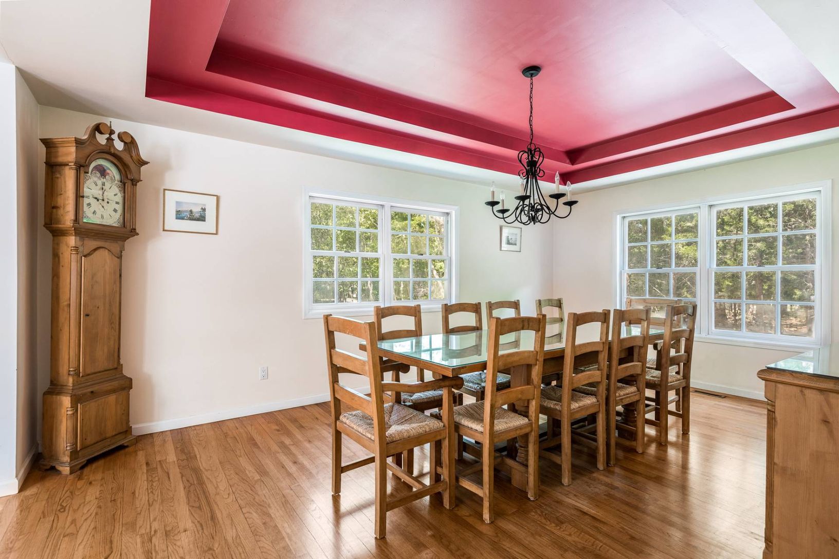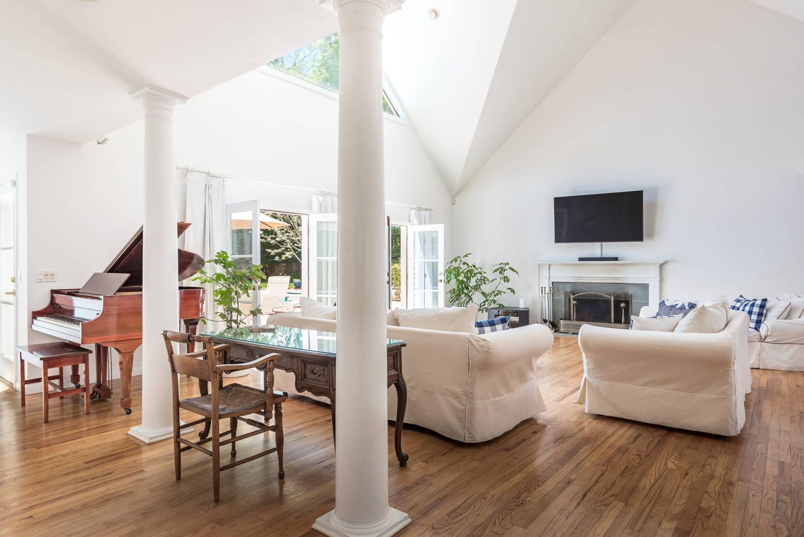 Sunsets over your own private wooded six+ acres personal sylvan reserve, set back from road and away from any visible neighbors, yet within a few minutes' to Mashashimuet Park/Otter Pond and Sag Harbor Main Street. Winding circular driveway, with EV fastest home-charge parking area post outlet, leads to a five-bedroom, three and one half-bath, post-modern and approx. 4000+/- sq.ft. home. Double entrance doors open into a five-columned, spectac