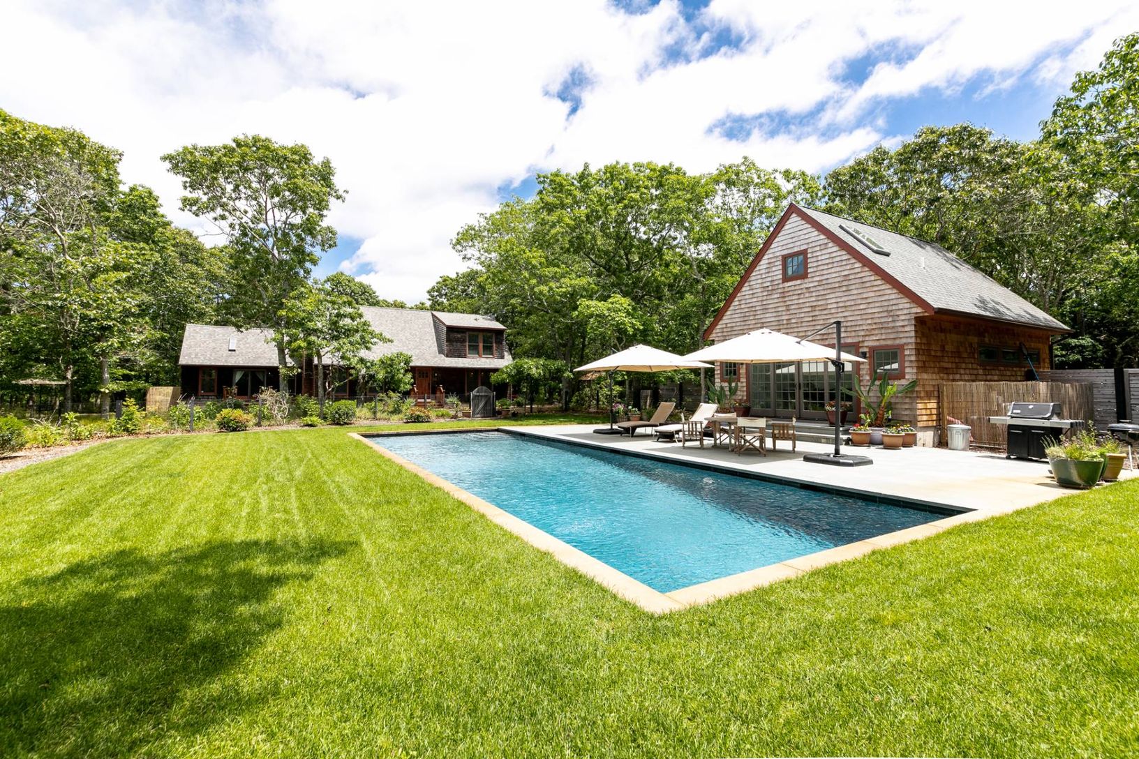 Moments from Sag Harbor Village, this bright and inviting home is ready for an unforgettable Summer. Sited on a quiet cul-de-sac surrounded by the serenity of Round Pond and ready to accommodate with 2,204 +/- sq. ft. of living space, 4 bedrooms, 3 full and 2 half baths, and a large 50' heated gunite pool. The charming Craftsman-style home is filled with natural light and accented by delightful decorations, hardwood floors, and exposed beams.