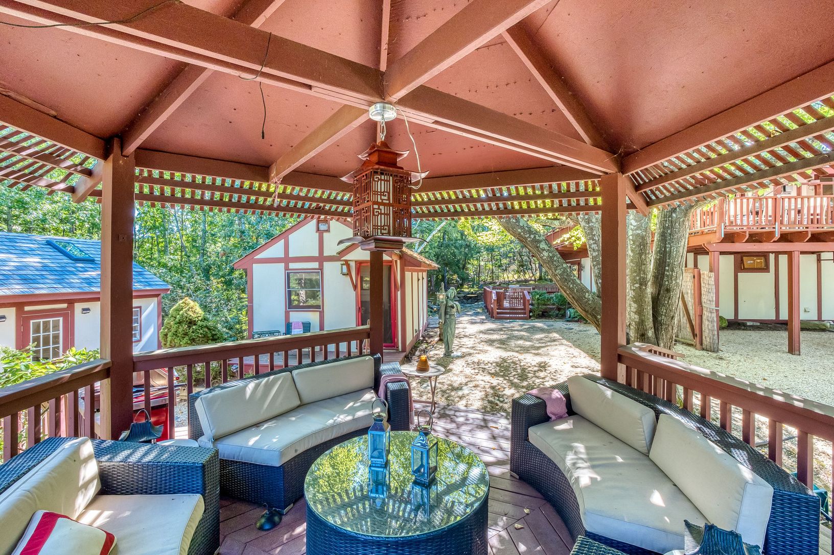 Feel transported without taking a plane ride at this charming 3 structure Prop in heart of Sag Harbor. Main house is Japanese Pagoda House with open Liv Room floor plan, ensuite Master Bedroom. PoolHouse and Studio also have en-suite bathroom. Your guests or your family can all have privacy in their own structures. Kids, couples, families love the property. Has a rental history. House manager. Rarely does property of this type and additional s