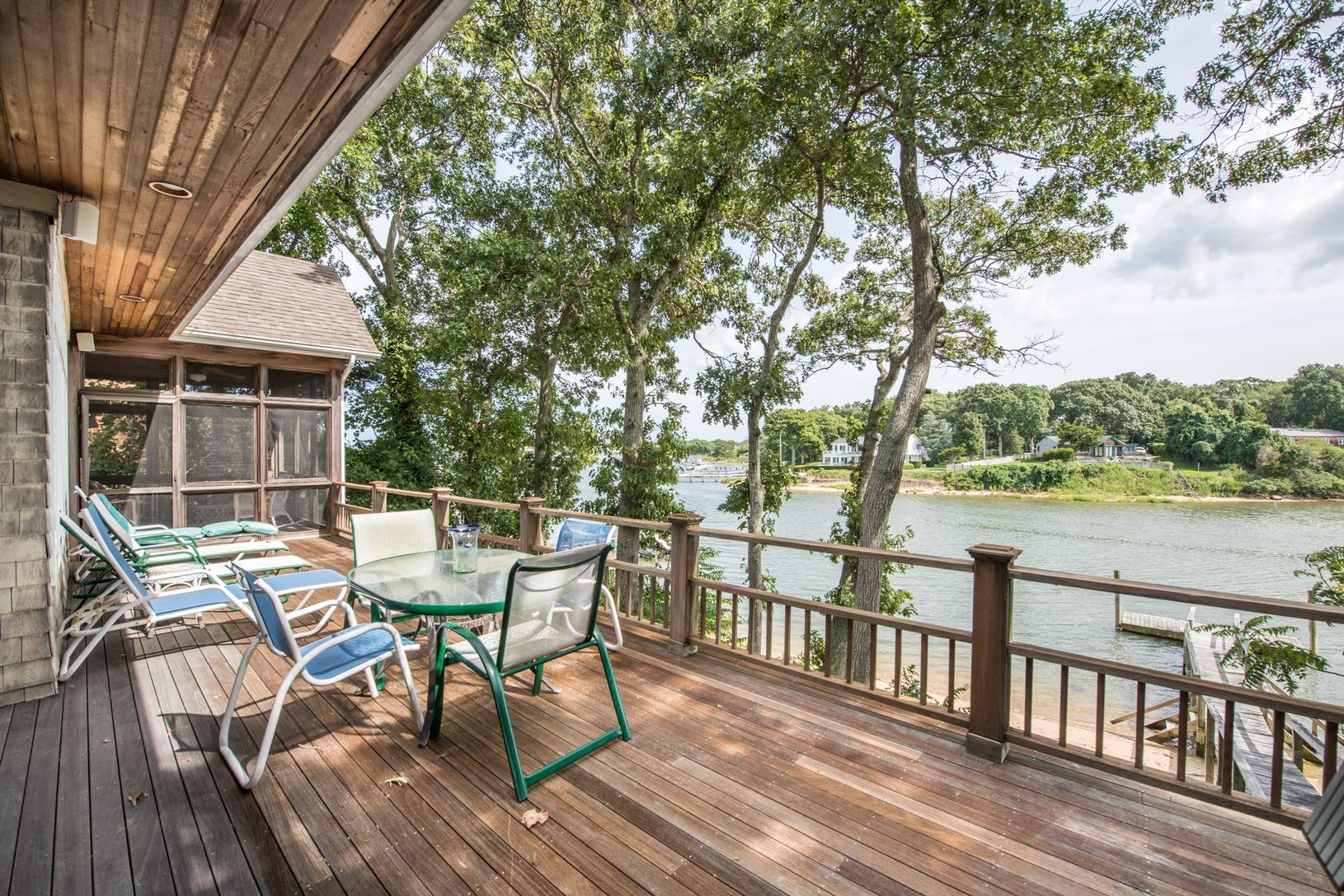 Highly desirable waterfront in Sag Harbor Bay Point house with private dock. 3 bedrooms 2.5 baths. Gorgeous combined living, dining and gourmet kitchen, 10 foot coffered ceilings throughout all with glass doors onto a deck facing incredible water views. Downstairs Master has it's own deck and screened-in porch. Central air-conditioning and central vacuum.