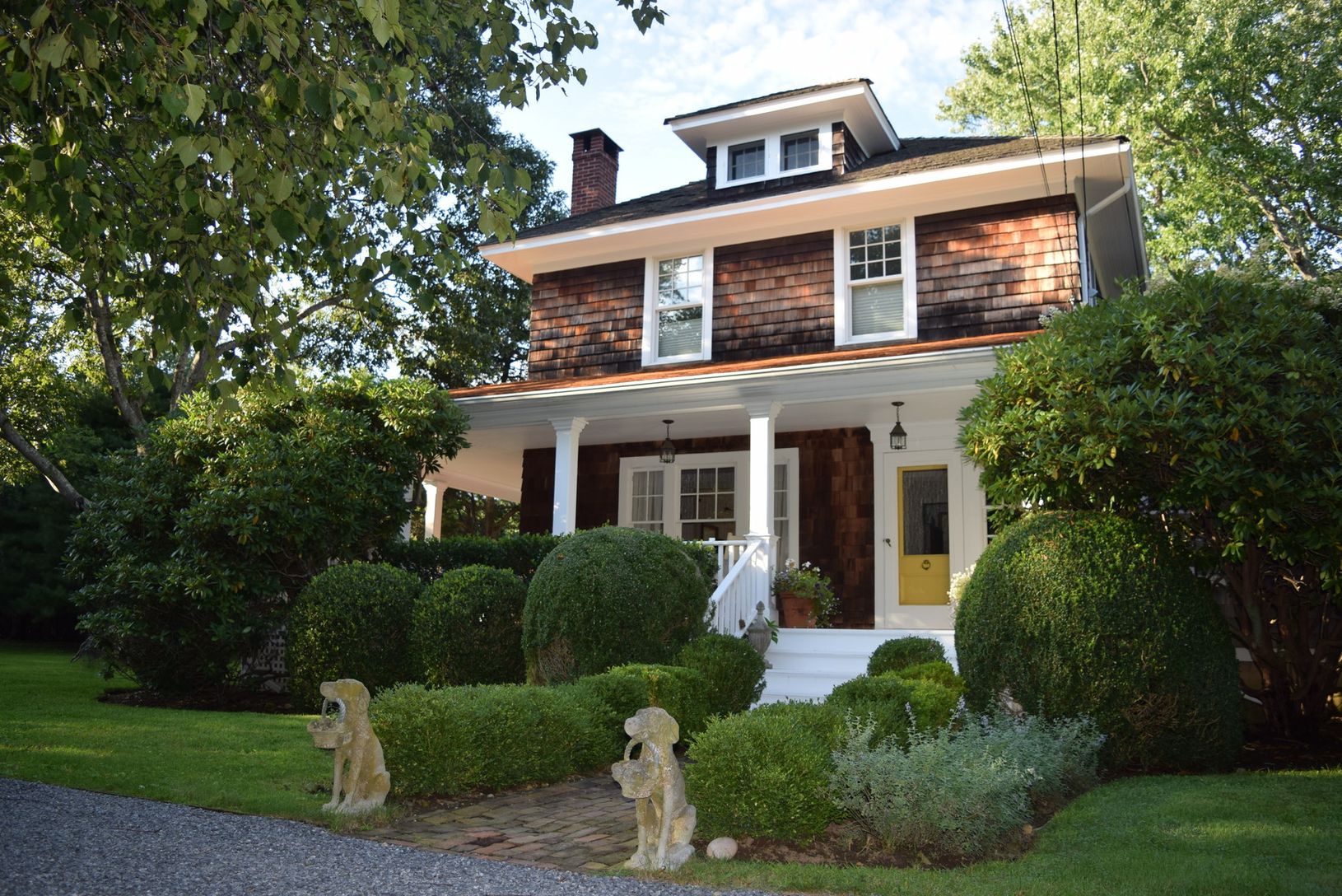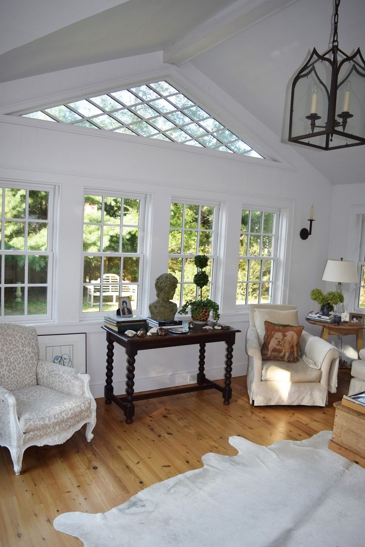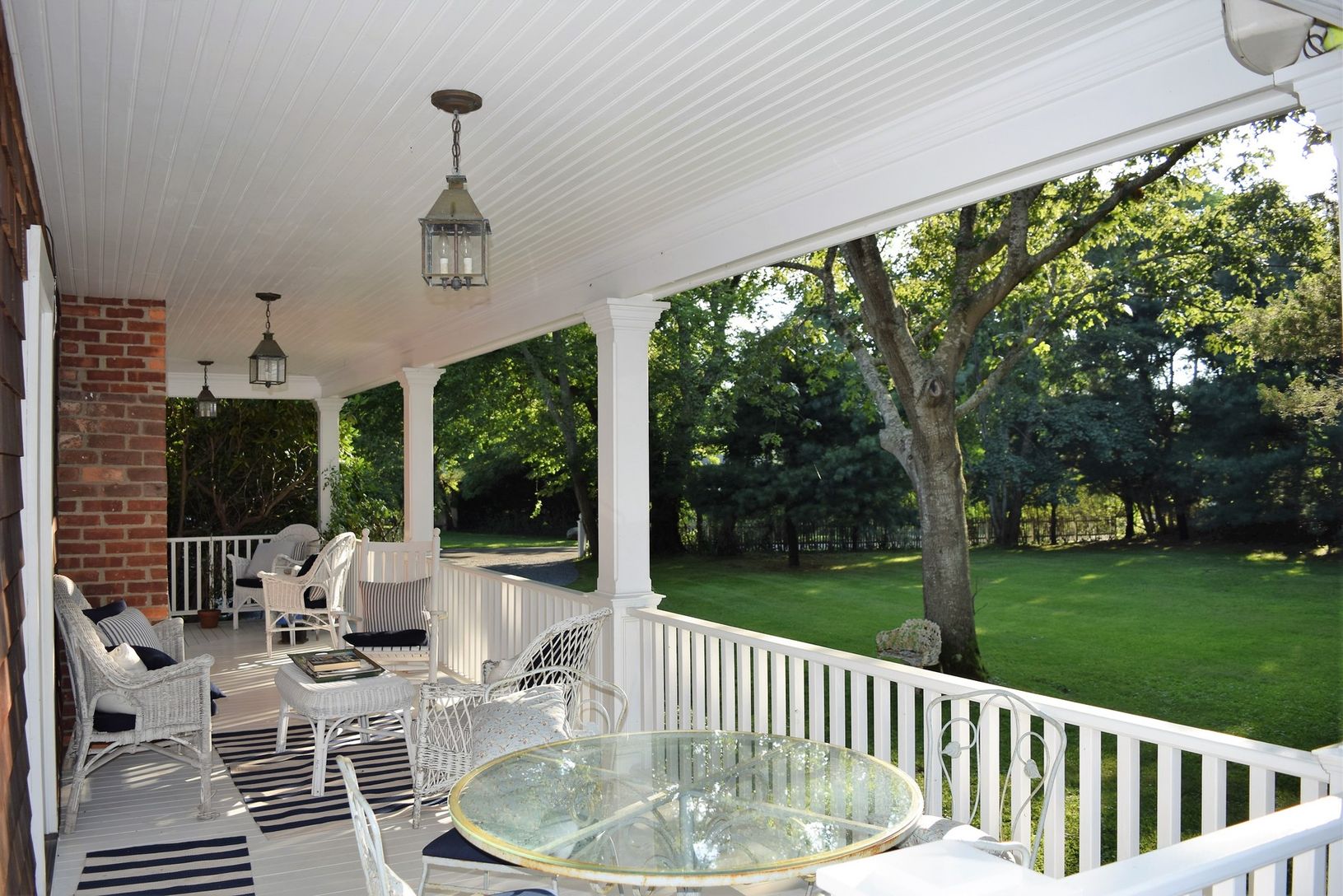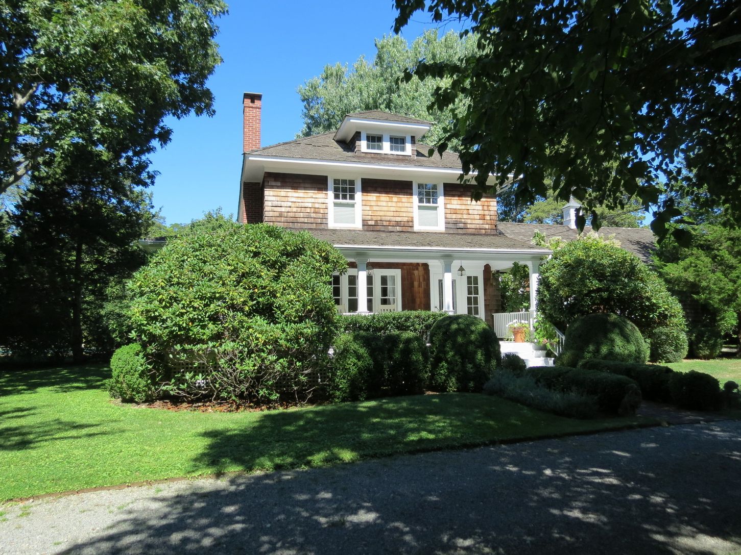 STAY FOR THE U.S. OPEN! A charming traditional farmhouse, renovated and updated by its noted interior designer owner. Living room with fireplace, dining area, updated kitchen and pantry with English-inspired details, spacious den with French doors to rear yard. Three bedrooms, two full baths. Shy acre of property, very private, lovely gardens, wraparound porch; walk to Long Beach, short walk or drive to Sag Harbor Village.