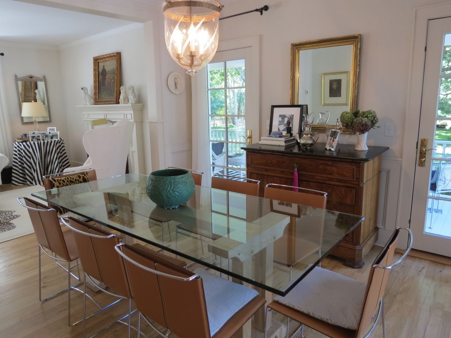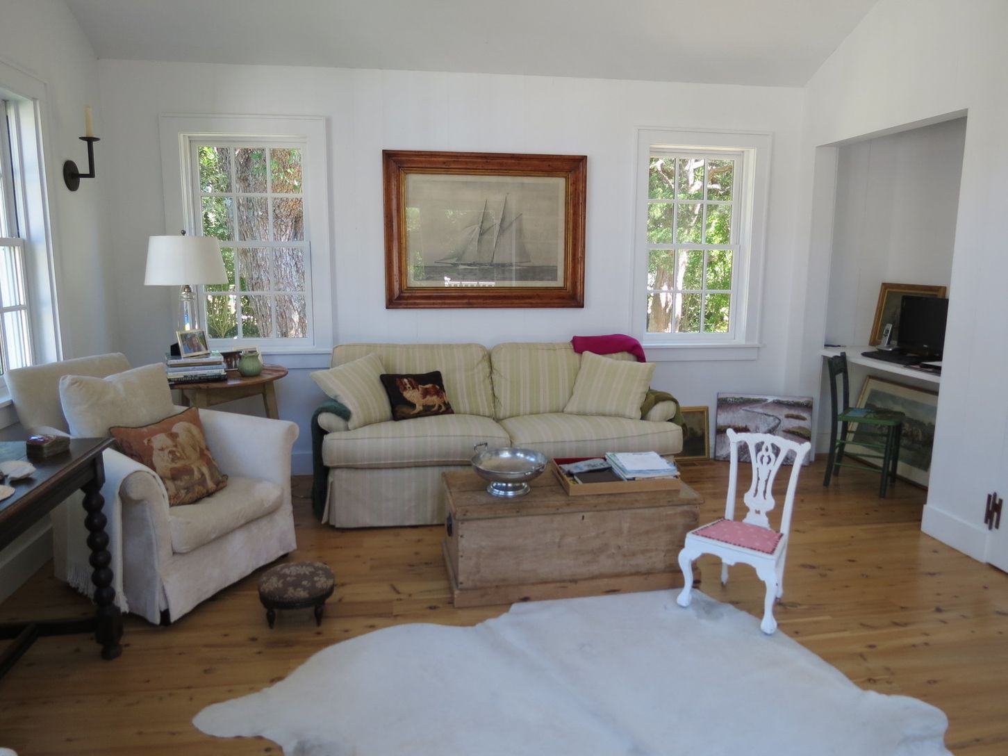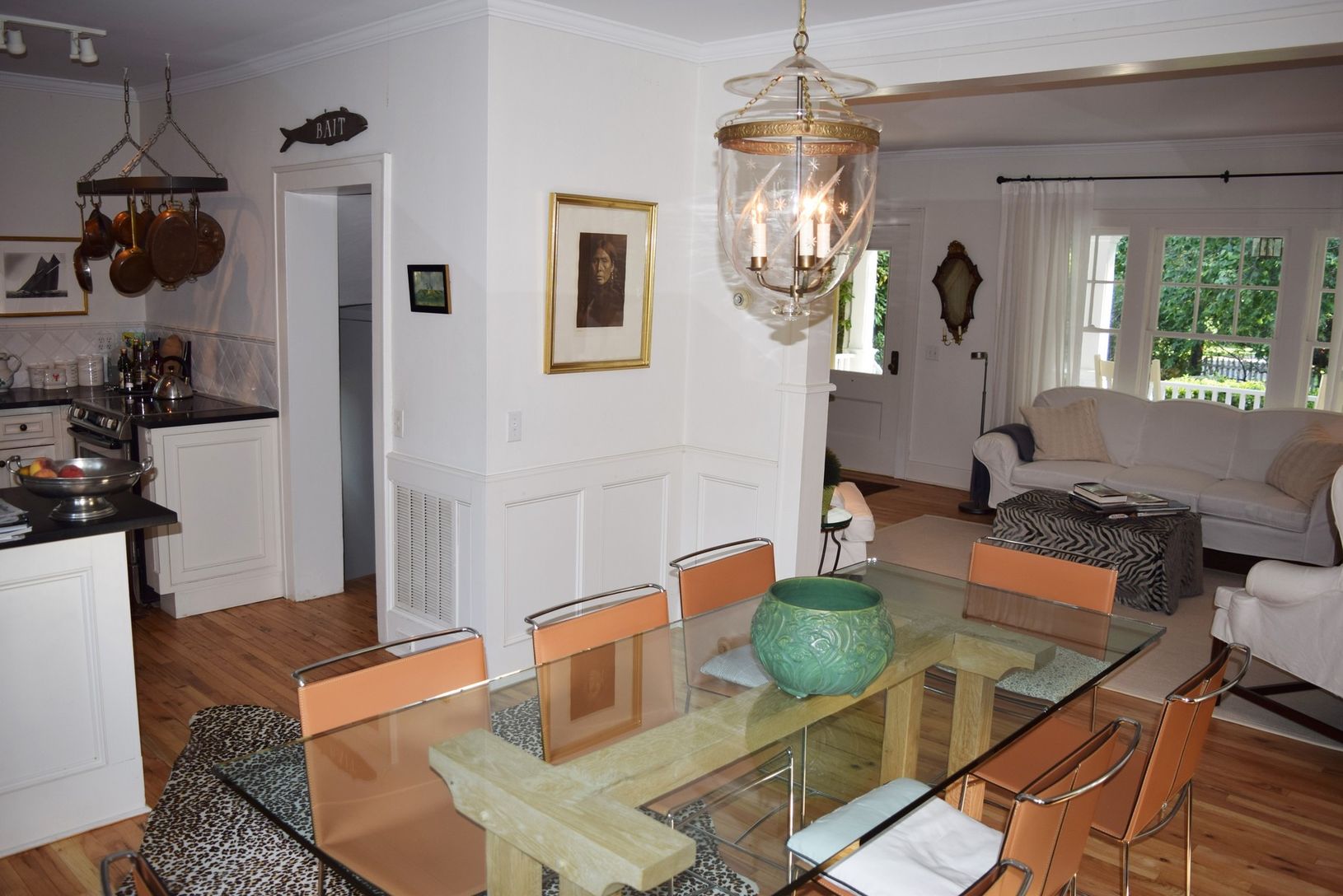 STAY FOR THE U.S. OPEN! A charming traditional farmhouse, renovated and updated by its noted interior designer owner. Living room with fireplace, dining area, updated kitchen and pantry with English-inspired details, spacious den with French doors to rear yard. Three bedrooms, two full baths. Shy acre of property, very private, lovely gardens, wraparound porch; walk to Long Beach, short walk or drive to Sag Harbor Village.