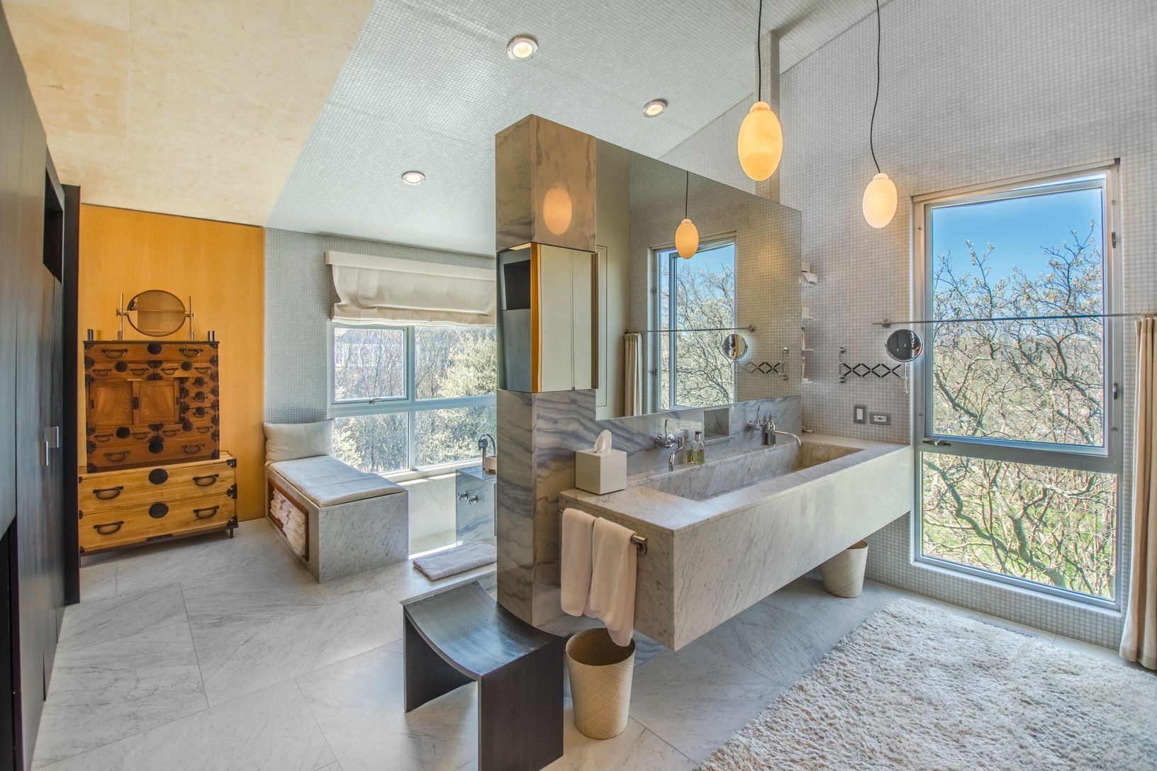 Famous Fashion Designer's Private Oceanfront Retreat. Located in Sagaponack's only truly private oceanfront enclave, this unique property will literally "Take you away." The secluded master suite with a panoramic view of the Atlantic Ocean's storied Sagaponack Beach, features a room sized shower, a six person pool-like tub, an office/getaway with 85 inch TV and private balcony overlooking the much published "great room." The expansive and ext