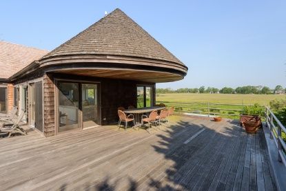 On 1.25 +/- acres this beautifully designed modern home takes full advantage of the panoramic farm field views over 25 open acres. Offering 5 bedrooms, 3.5 baths, living room with double height ceiling, fireplace and floor to ceiling windows, enormous gourmet kitchen/dining area, family room with terra cotta floors and large picture windows giving to the expansive grounds. Thoughtfully designed extensive second floor decks provide ample opp