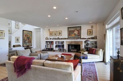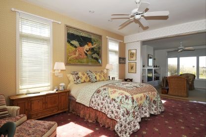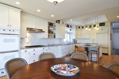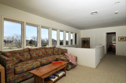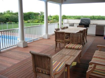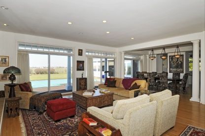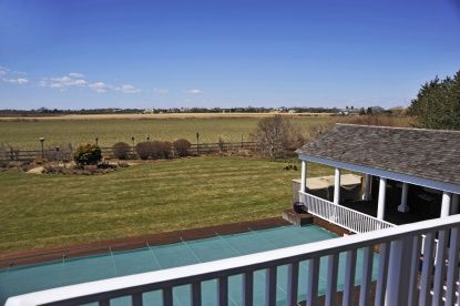 First time offered, wonderful Post Modern in prime Sagaponack location is perfect in every way. First floor master bedroom,large closet space, spacious master bath, plus four additonal guest bedrooms, five baths and den. The large country eat-in kitchen opens to an oversize, covered gazebo porch with additional southwest decking with awning and heated pool. There is an open livingroom and dining visually connecting the light filled yard a
