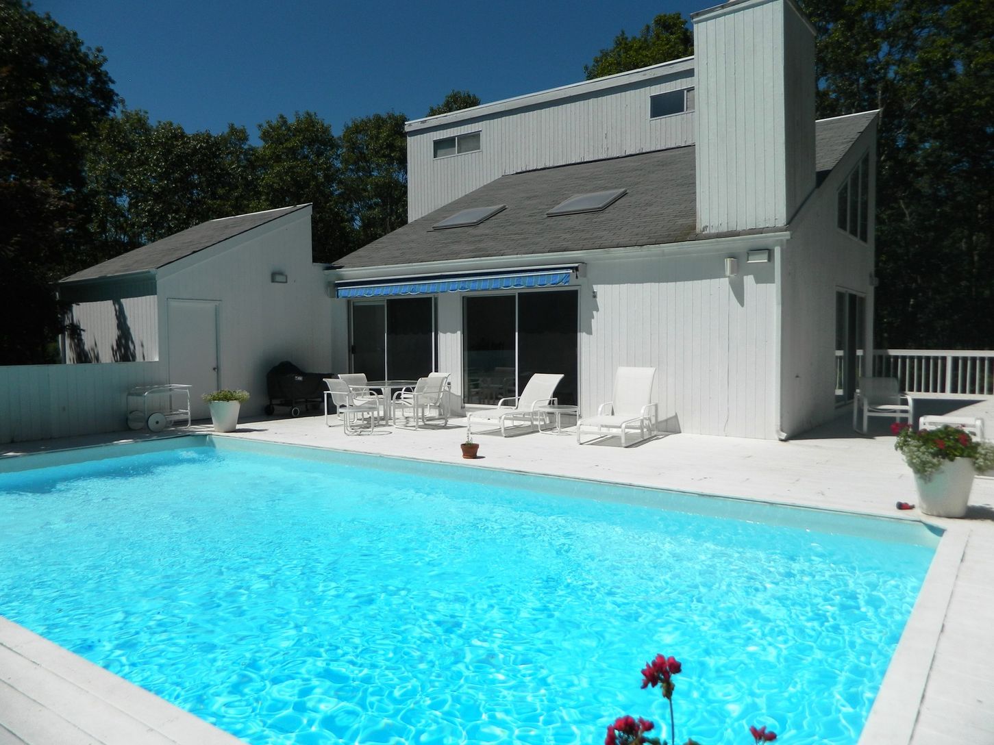 This private, perfectly located, three-bedroom, two-bath home is just minutes to beautiful beaches and all towns. Bright and sunny great room with vaulted ceilings, extra large sliders and skylights. Newly renovated chef's kitchen. Lots of decking around heated pool and wet bar for entertaining. Additional bathroom in pool house. Beach is just minutes down the road.