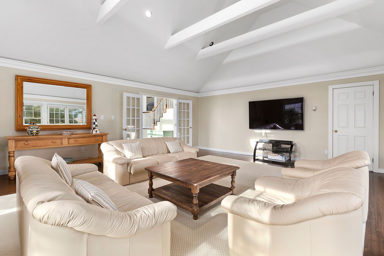 This beautiful Post Modern home is nestled away from the hustle and bustle, yet completely convenient to all Hamptons Amenities. On 2 acres, stroll through the back yard to the pond to enjoy the ducks and swans, or lounge by the large, heated Gunite pool from the generous deck area. The home has 4-5 bedrooms, including 2 Master Suites, one with steam shower and jacuzzi tub. There is a large country kitchen, separate dining area, formal living