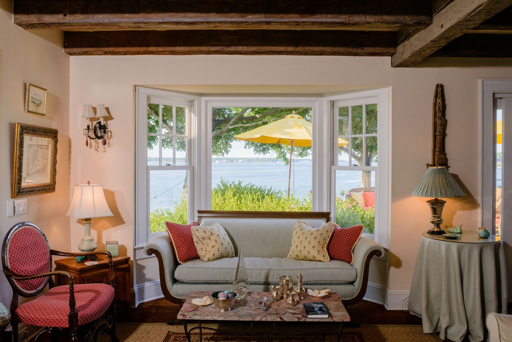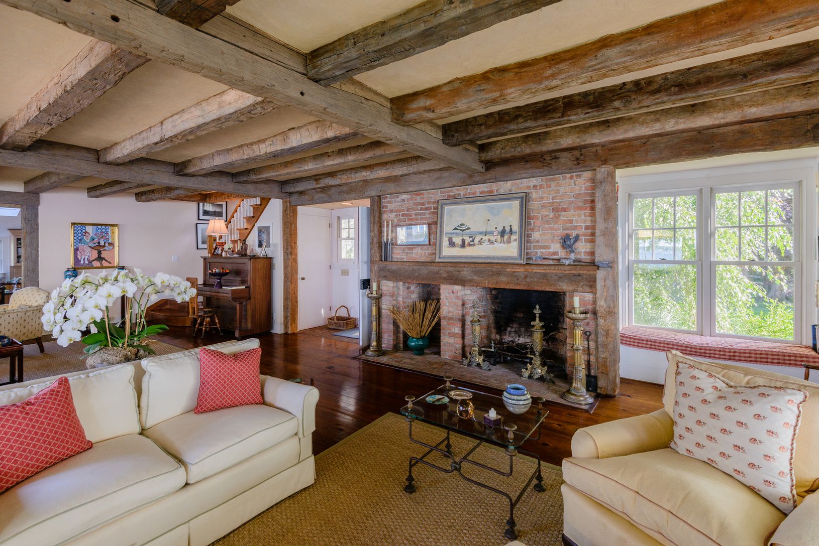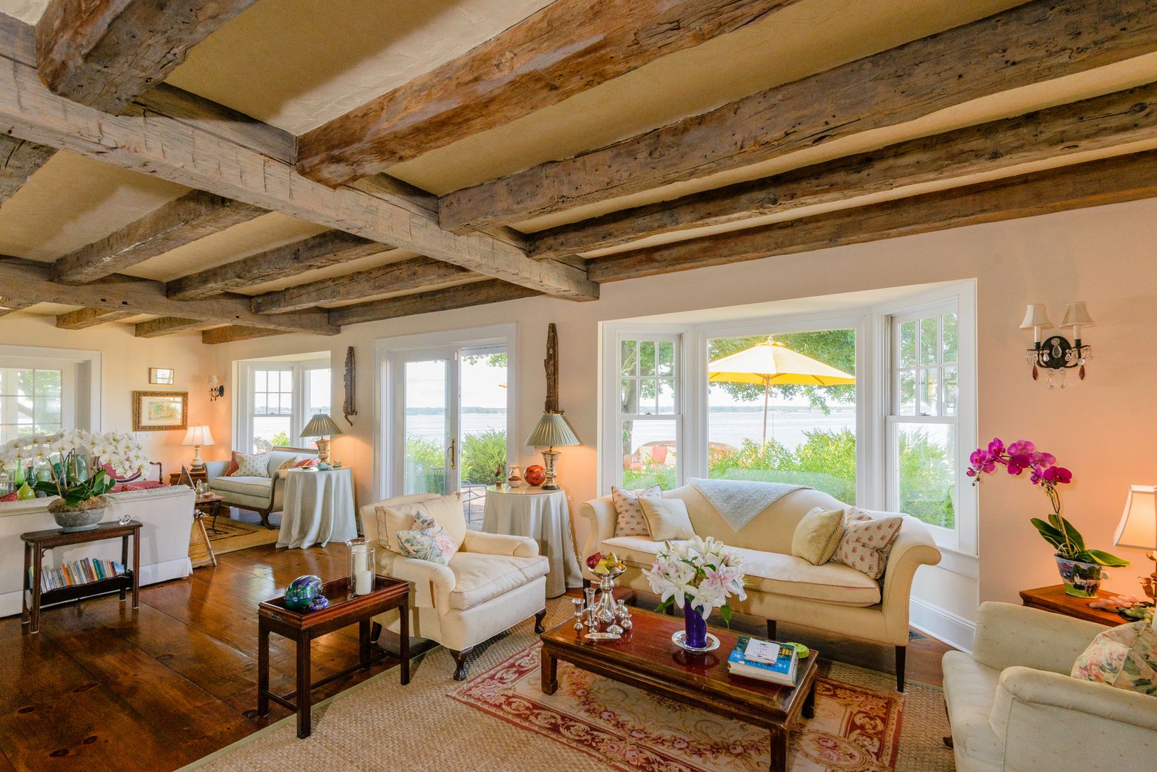 A superb waterfront location with panoramic views and a unique historic pedigree, this offering is an unrivaled opportunity to own in prestigious Dering Harbor. The exquisite 4 acre property, featuring a main residence and a fully appointed guest cottage, offers understated elegance, showcasing the grandeur of magnificent views and unparalleled sunsets. The spacious living room has wooden beams, a fireplace and stunning wide-plank floors. Fren