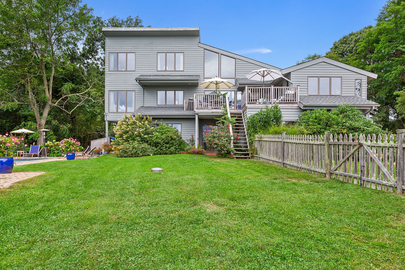 20-L-0022. Bordering golf course and overlooking Gardiner's Bay. Sunny and spacious 5 bedroom, 2.5 bath contemporary offers a second floor living room with vaulted ceilings, kitchen and dining area with glass doors to deck, master suite plus loft bedroom all with scenic water views. Main level has den with fireplace, three bedrooms and access to 20x40 Gunite pool and outdoor shower. Secluded on 1.8 acres convenient to sandy beach. Available fo