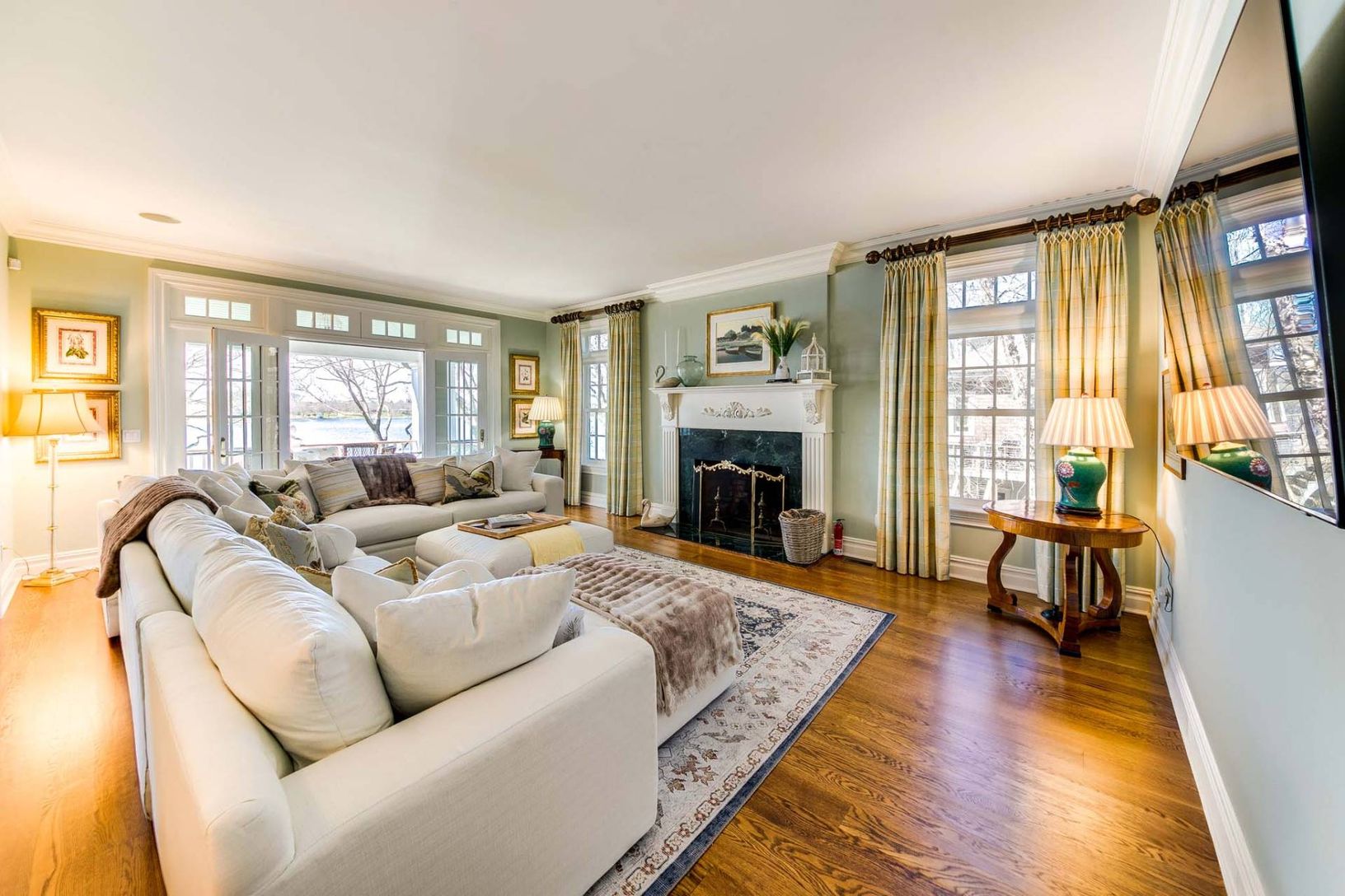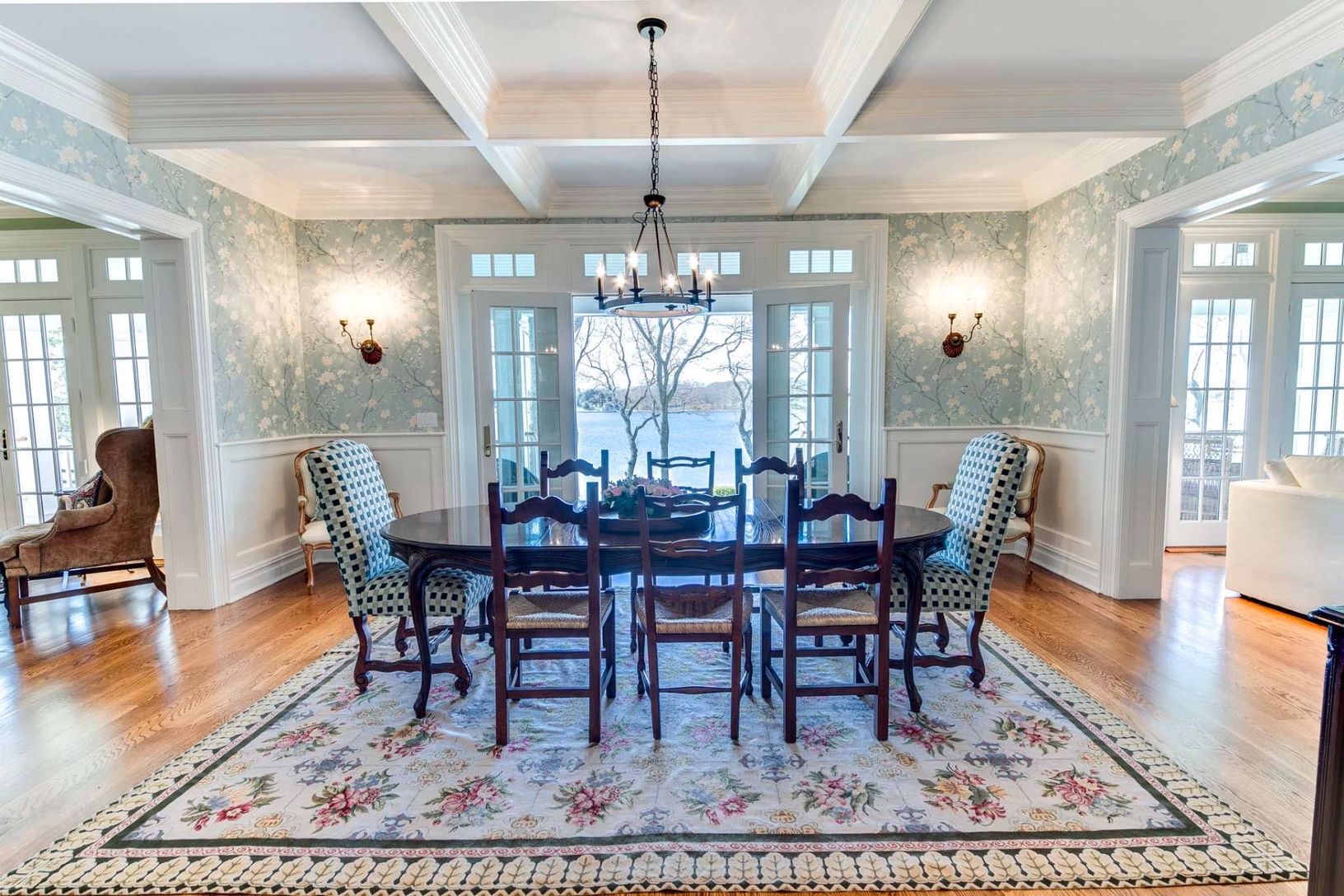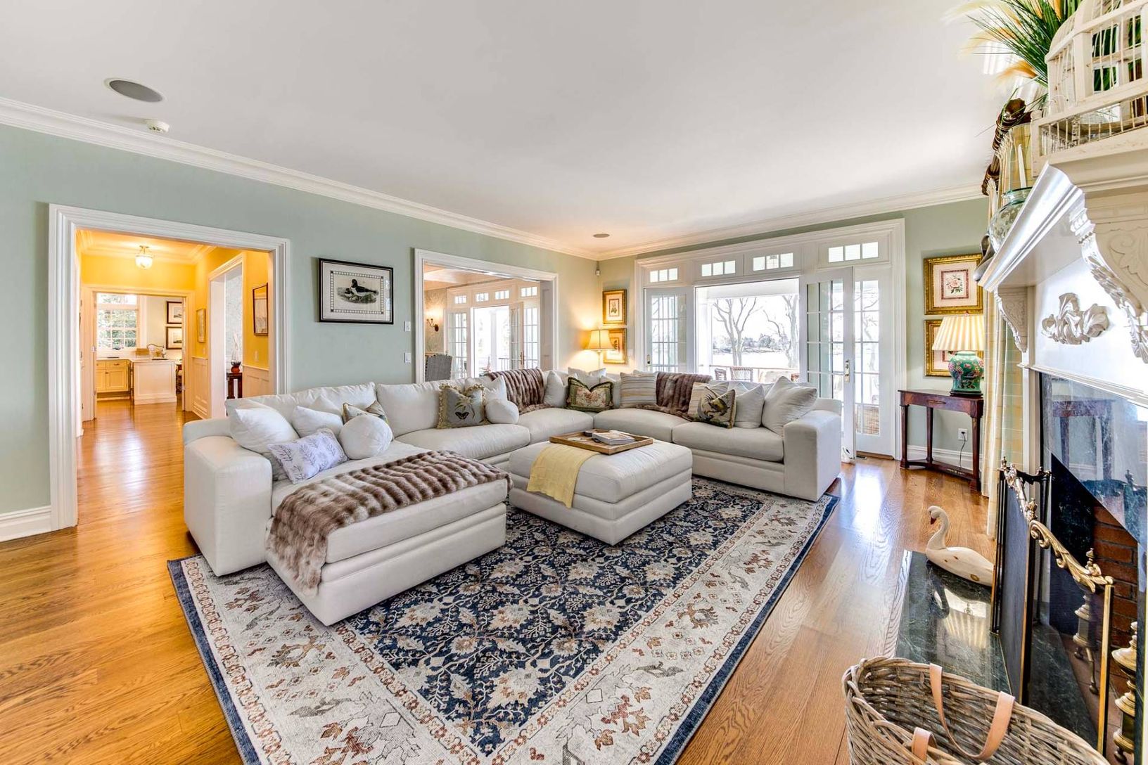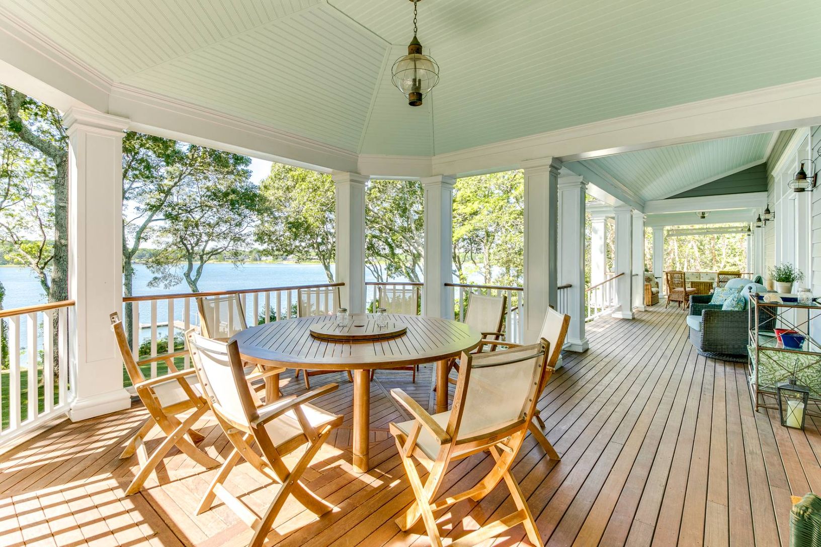 This elegant traditional graces a slight bluff facing south on West Neck Bay and is ready for your summer vacation. Designed by Pamela Pospisil, there are custom touches throughout, starting at the spacious foyer, that features a curvaceous staircase, a hall to a separate en-suite guest bedroom and, the main attraction, the areas that have direct waterviews and access points to a wide entertainment veranda. The living room has a plush sectiona