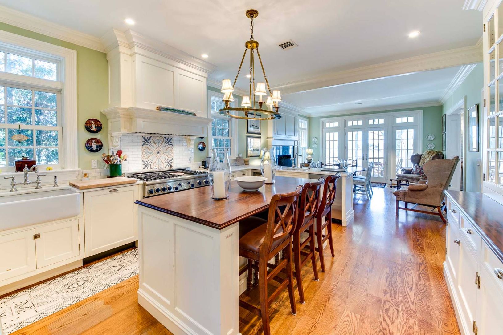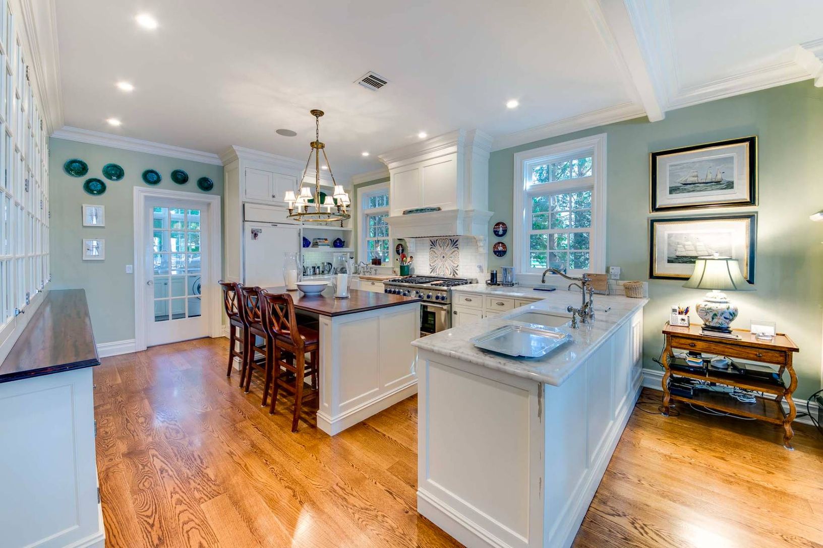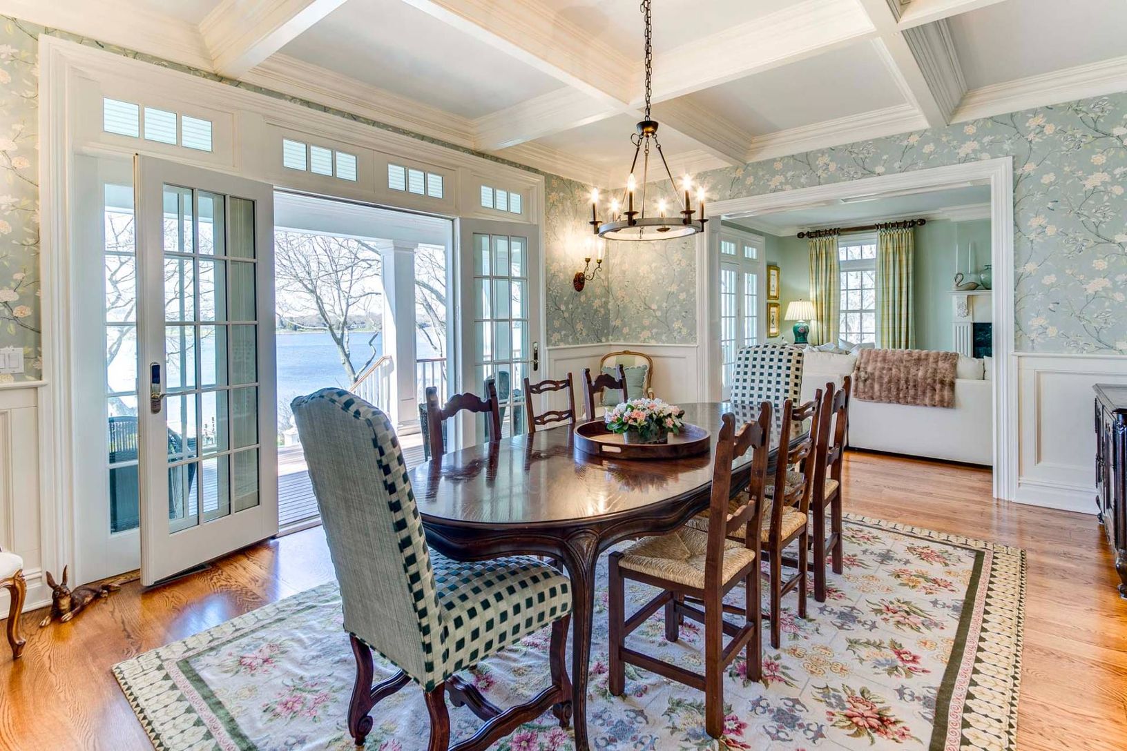 This elegant traditional graces a slight bluff facing south on West Neck Bay and is ready for your summer vacation. Designed by Pamela Pospisil, there are custom touches throughout, starting at the spacious foyer, that features a curvaceous staircase, a hall to a separate en-suite guest bedroom and, the main attraction, the areas that have direct waterviews and access points to a wide entertainment veranda. The living room has a plush sectiona