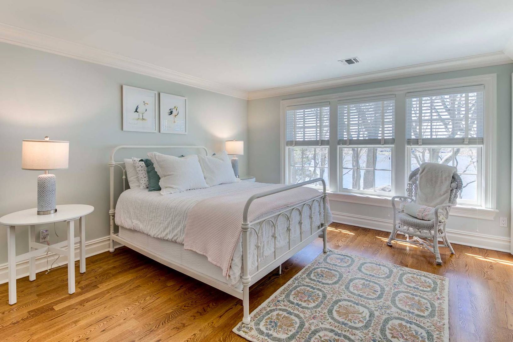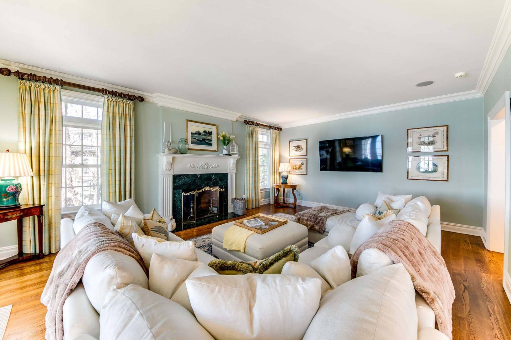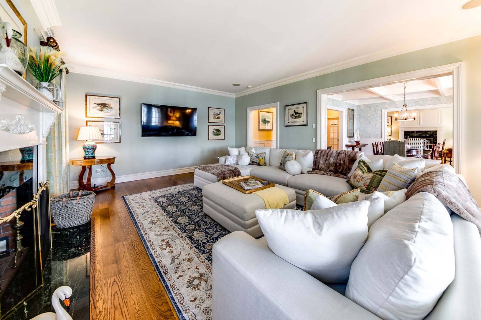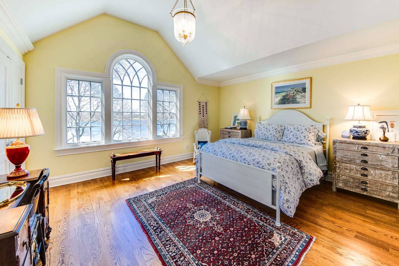 This elegant traditional graces a slight bluff facing south on West Neck Bay and is ready for your summer vacation. Designed by Pamela Pospisil, there are custom touches throughout, starting at the spacious foyer, that features a curvaceous staircase, a hall to a separate en-suite guest bedroom and, the main attraction, the areas that have direct waterviews and access points to a wide entertainment veranda. The living room has a plush sectiona