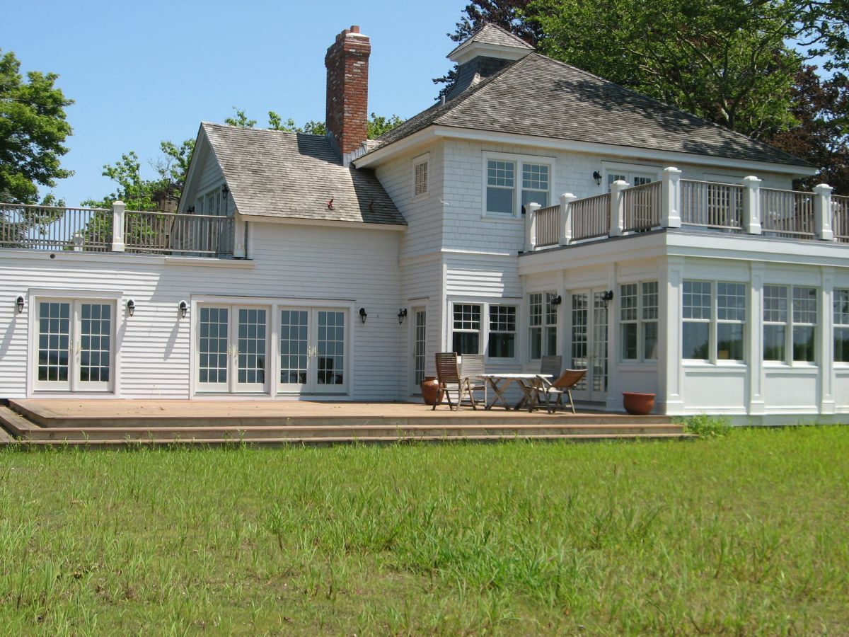 Beautifully restored waterfront Carriage House with private beach, 4 bedrooms, 4.5 baths, master bedroom with private veranda, second floor hideaway with fireplace and private veranda. First floor master bedroom with private deck. Great room with gourmet kitchen and breakfast bar, separate dining area with splendid oak dining table that seats ten, separate library, living room with fireplace. Solarium with extraordinary views over Peconic Bay,