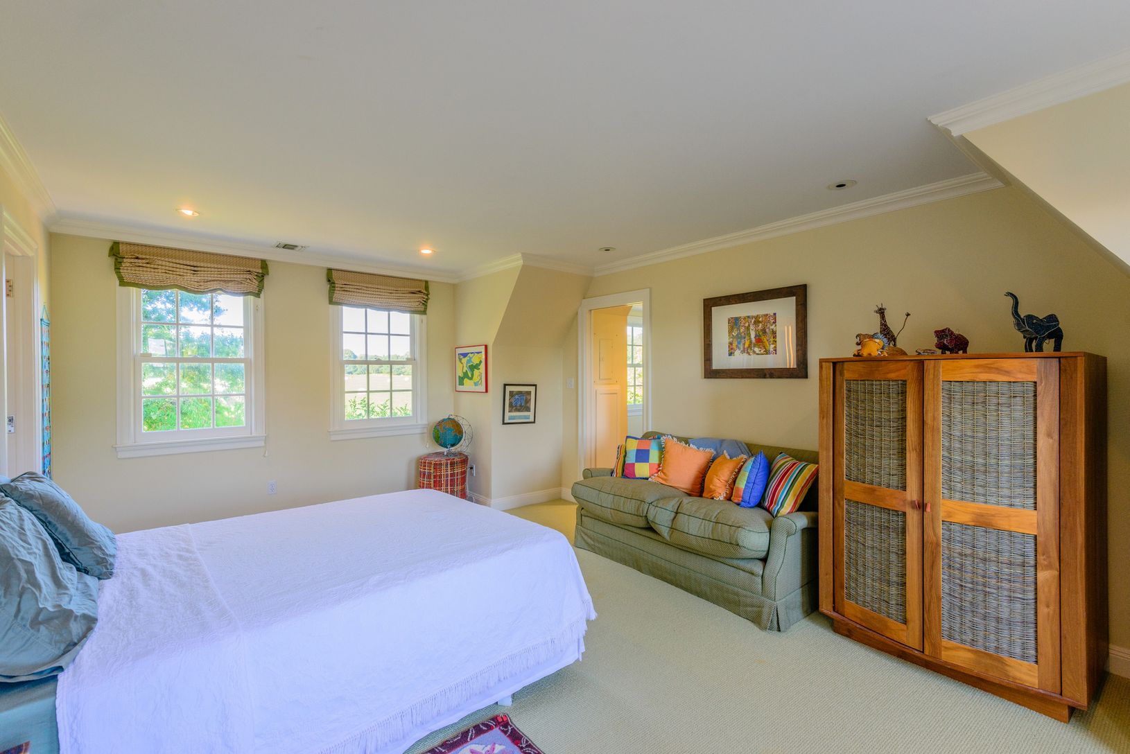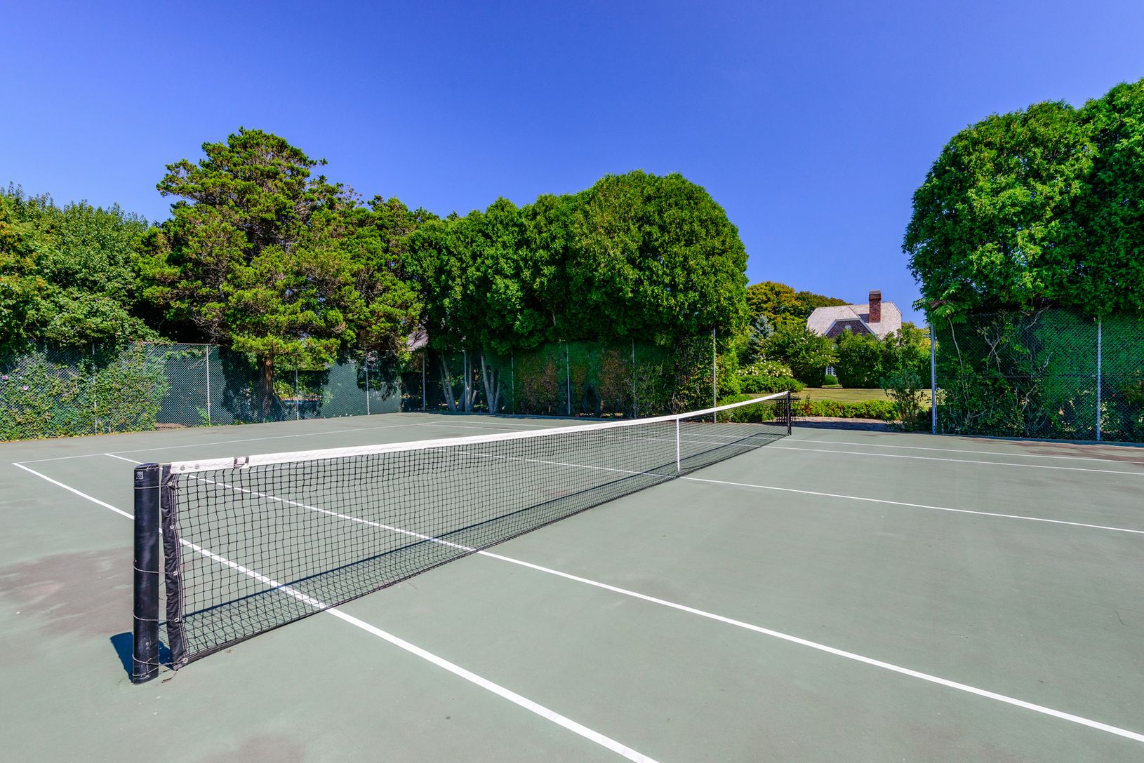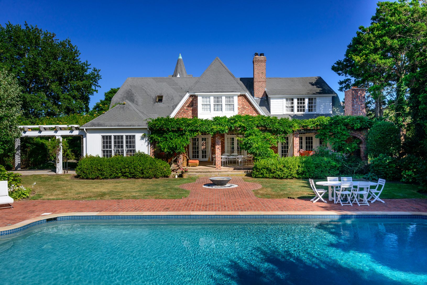 Built in the style of Grosvenor Atterbury residences in Southampton's Estate Section, sited on almost two acres with heated Gunite 40'x20' pool and north-south Har-Tru tennis court, is set back from lovely Meadowmere Lane down a gated, winding gravel drive. The parking court leads to the brick-clad home's entrances. The front door opens to a vestibule, a sitting room with fireplace, the great room with fireplace and main stair, then through to