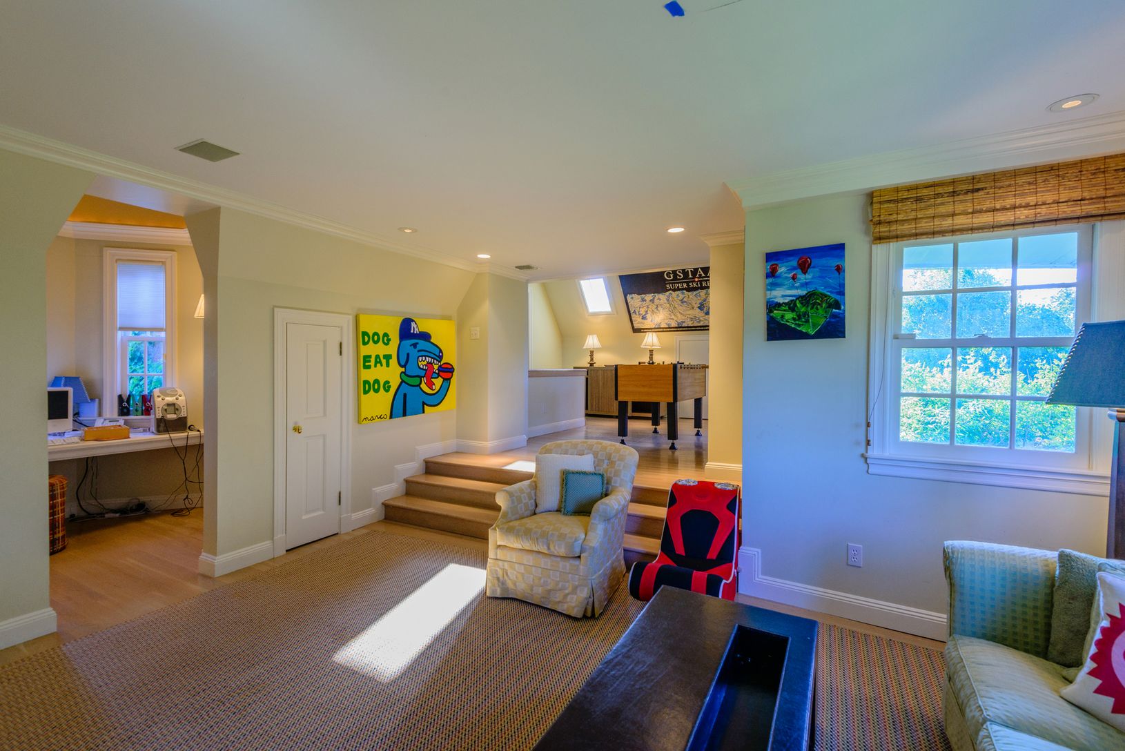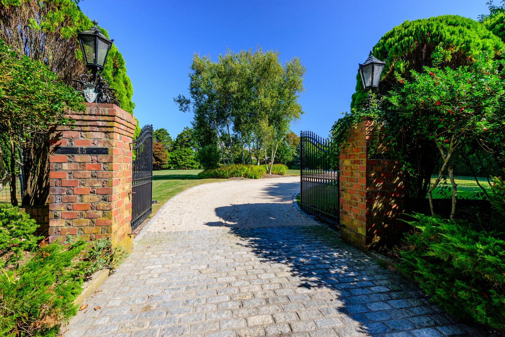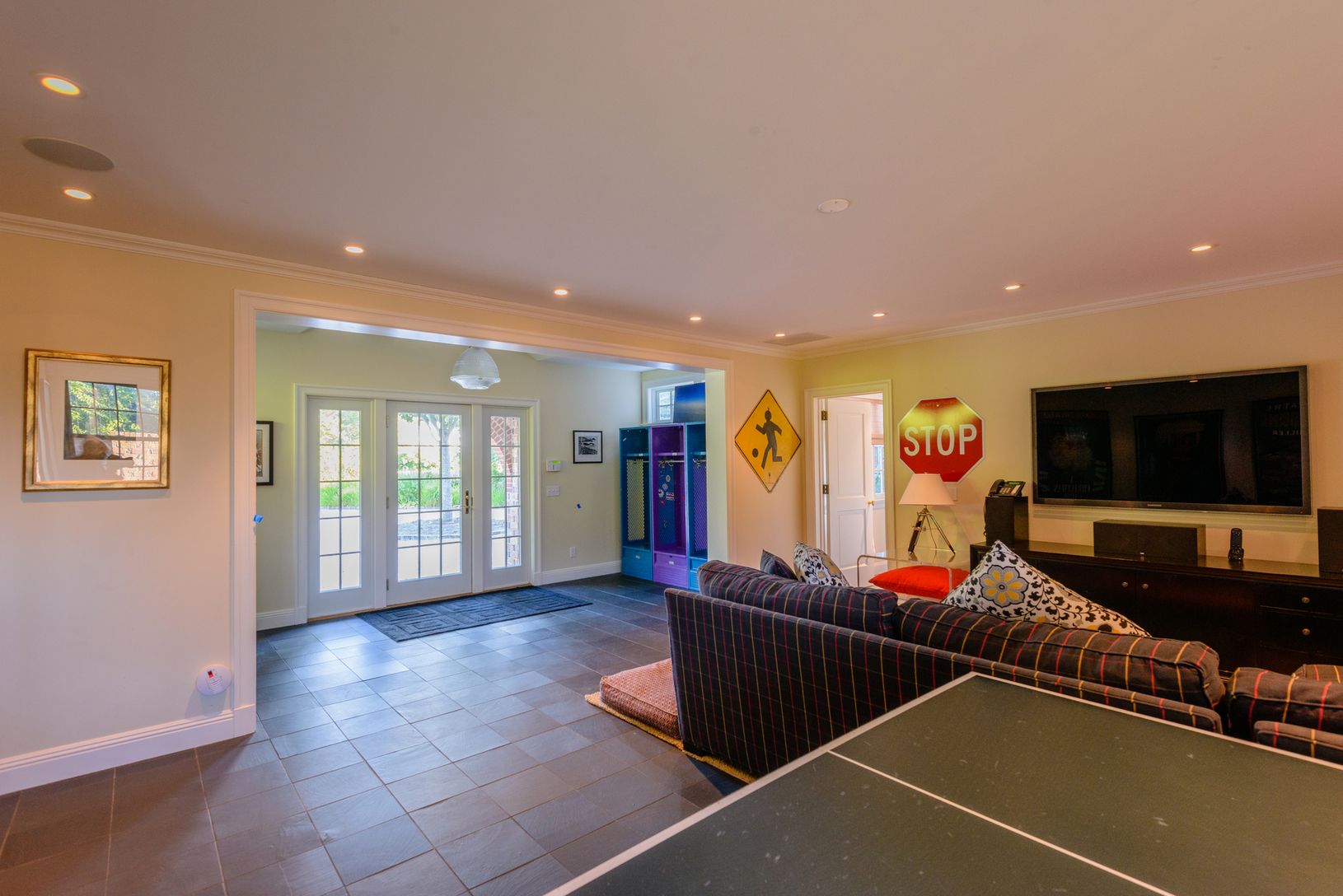Built in the style of Grosvenor Atterbury residences in Southampton's Estate Section, sited on almost two acres with heated Gunite 40'x20' pool and north-south Har-Tru tennis court, is set back from lovely Meadowmere Lane down a gated, winding gravel drive. The parking court leads to the brick-clad home's entrances. The front door opens to a vestibule, a sitting room with fireplace, the great room with fireplace and main stair, then through to