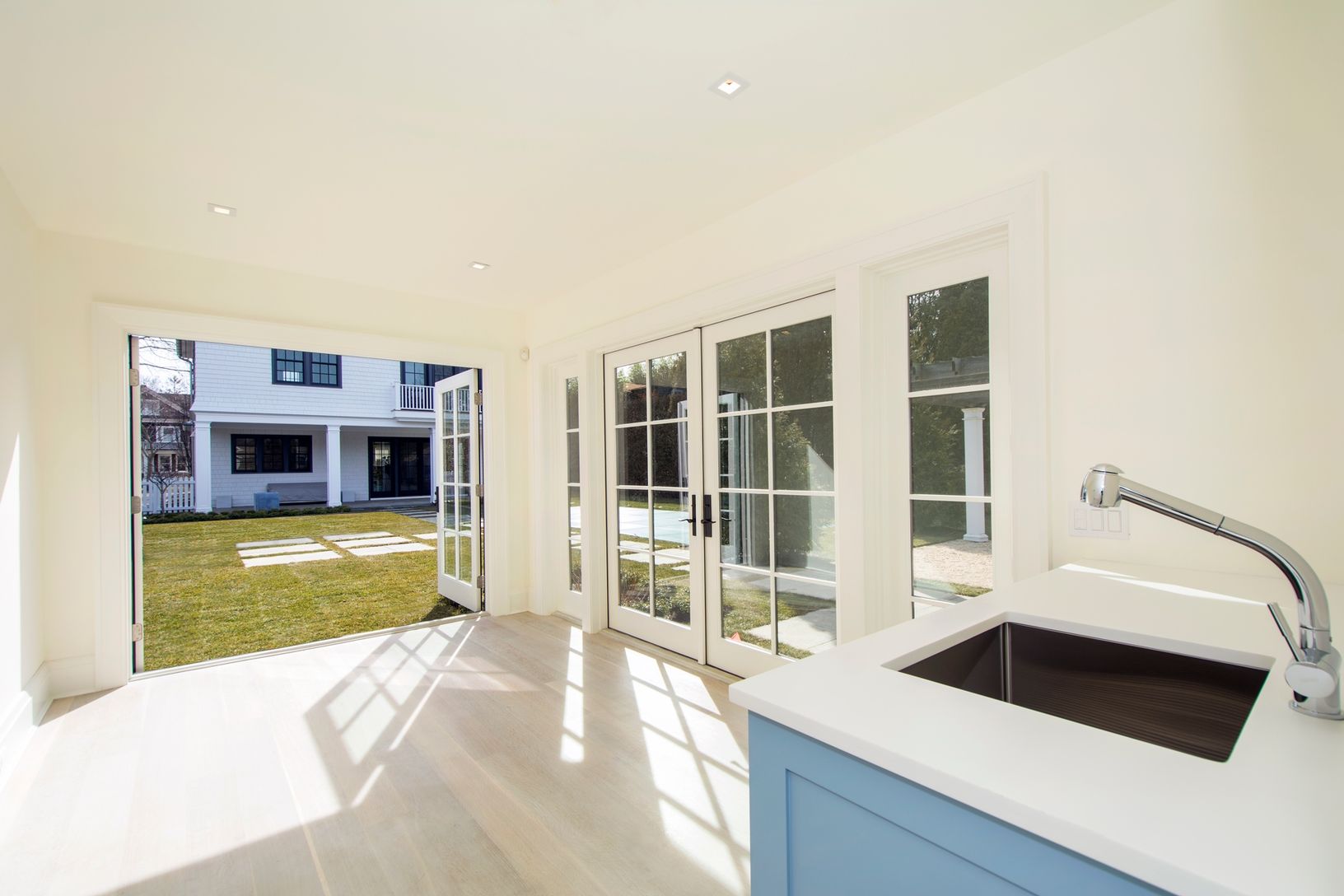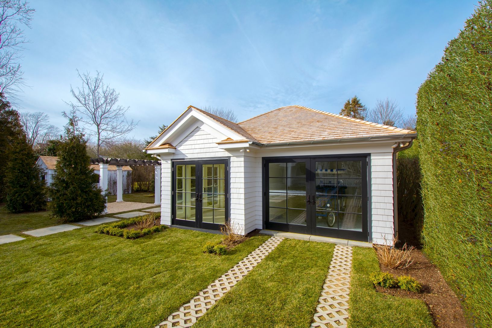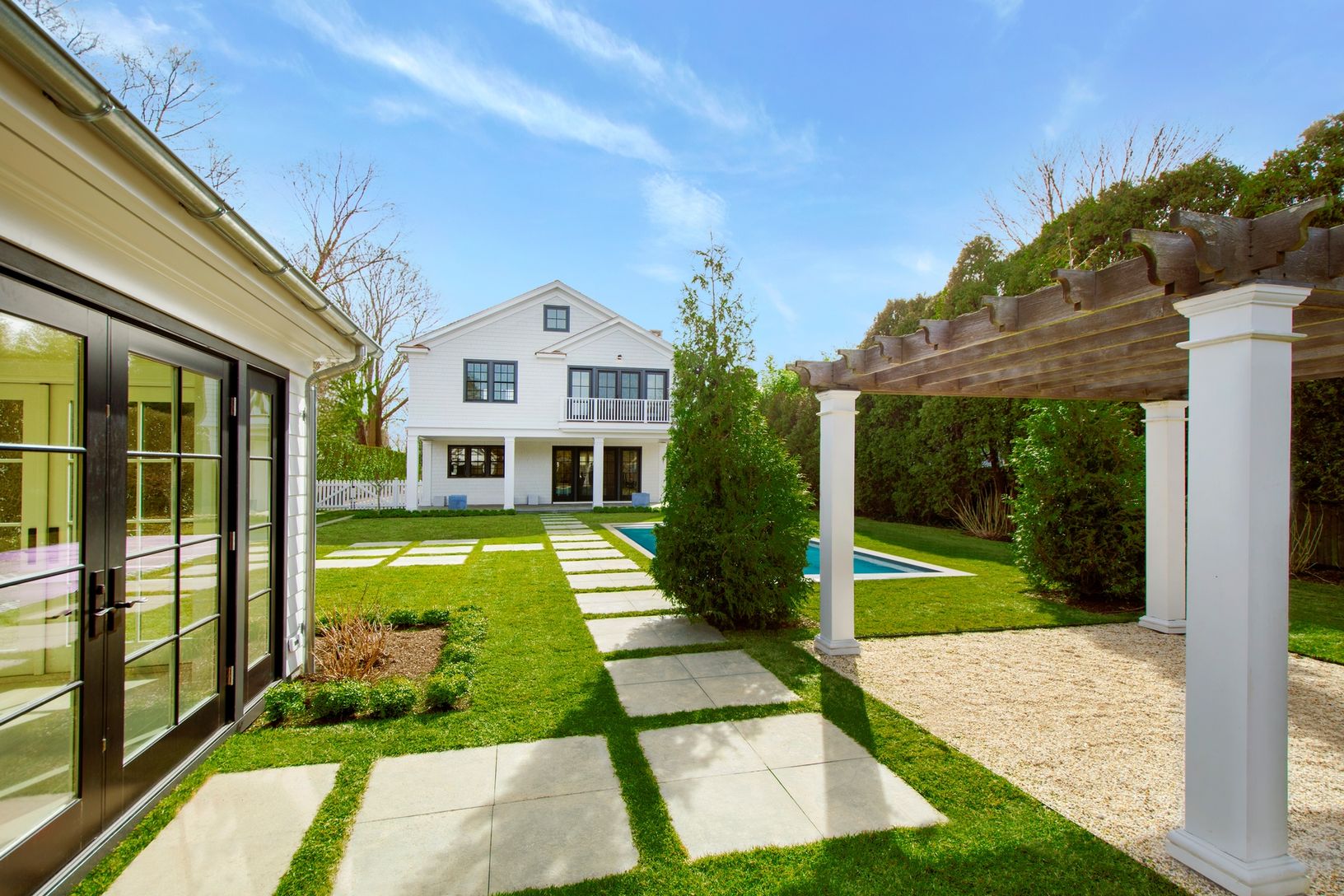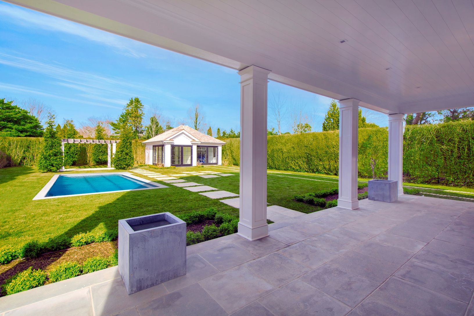 Located in the hot area of Southampton Village, east of South Main, this new residence with pool, pool house, and garage evokes the modern/transitional style. Light-toned wide-plank flooring, dark-toned accents and handrails, wide horizontal wainscoting, superb modern bathrooms, and a brand new ultra- modern kitchen with Bosch, Subzero, Wolf, Miele appliances have all been installed. The five-bedroom, six-bath home offers a den/convertible gue