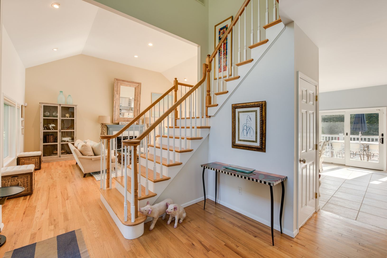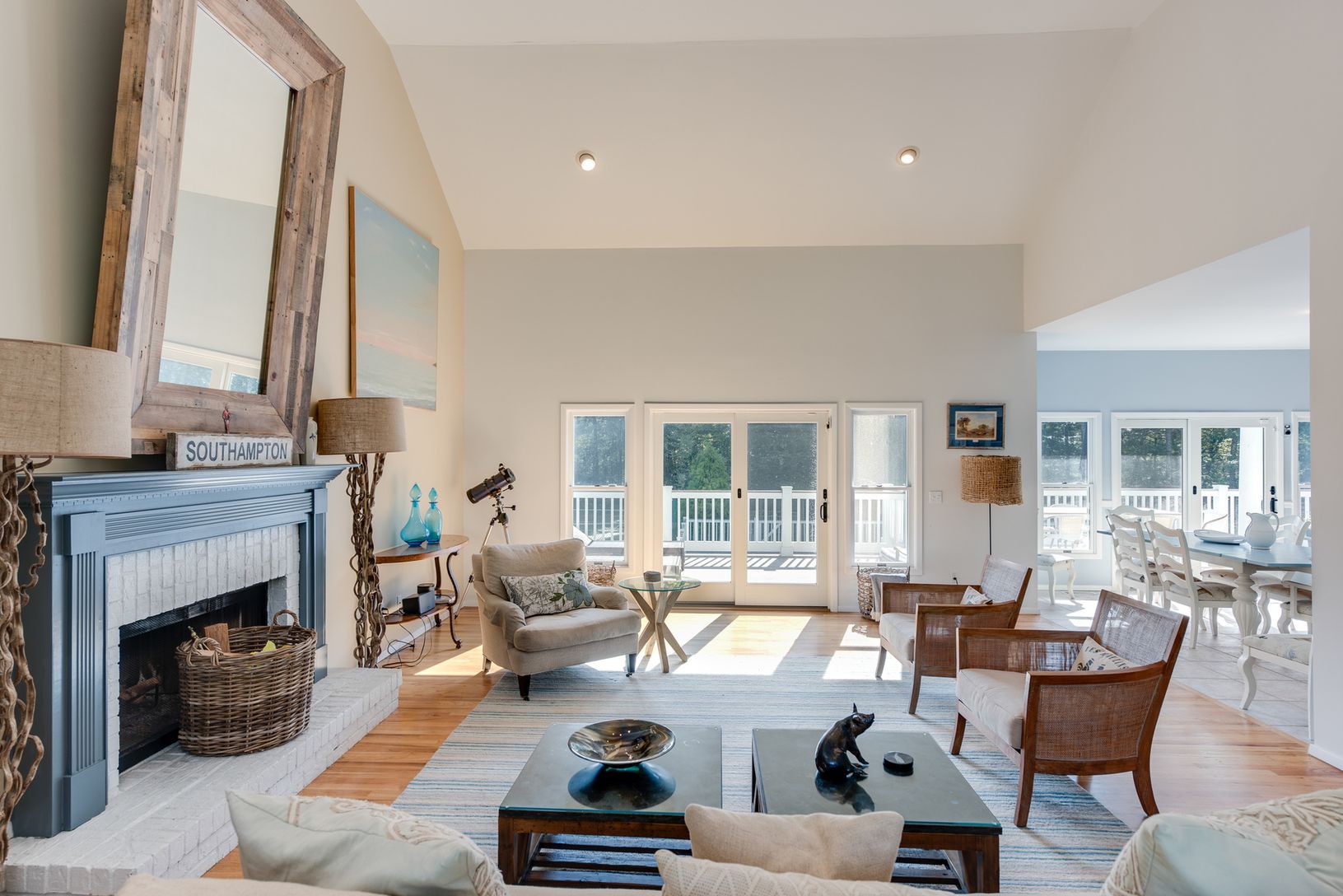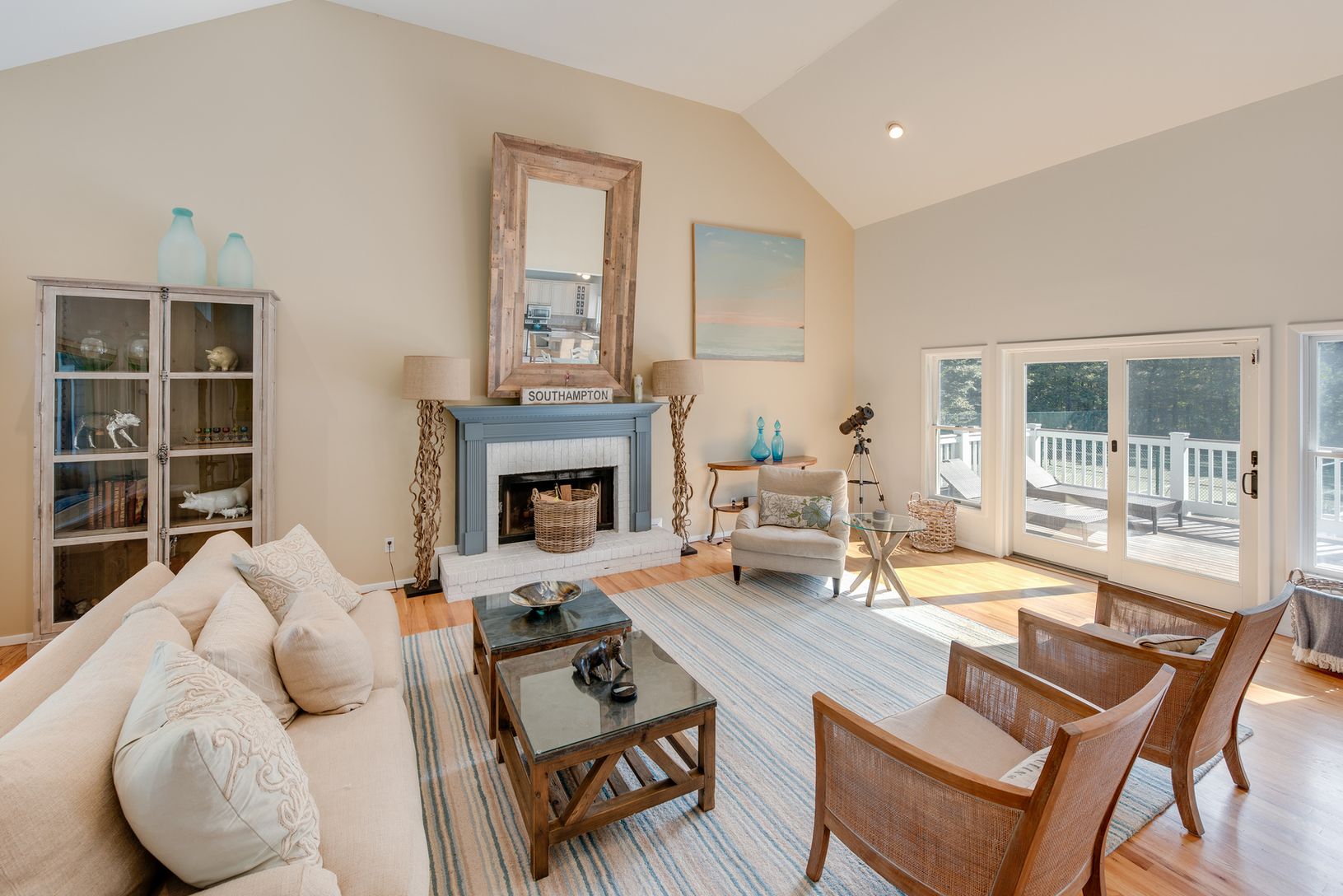 This dramatic two-story Post Modern home is located on 1.8-acres just outside Southampton Village. Lots of property, landscaping and privacy too!! interior features include 5-bedrooms, 4-1/2 baths, dining room, fireplace in living room, finished basement and central air. Plus 3,000 sq. ft. of sun-drenched decking around the pool for the utmost in summer entertaining.